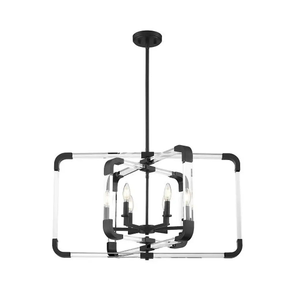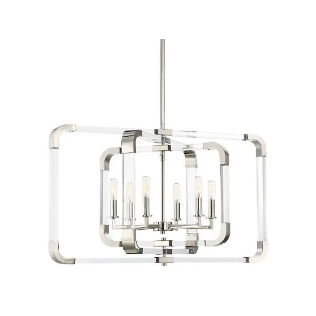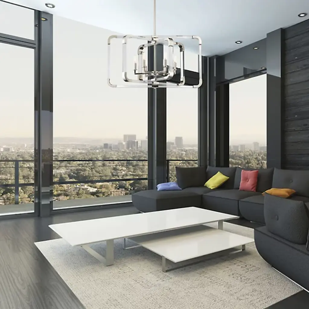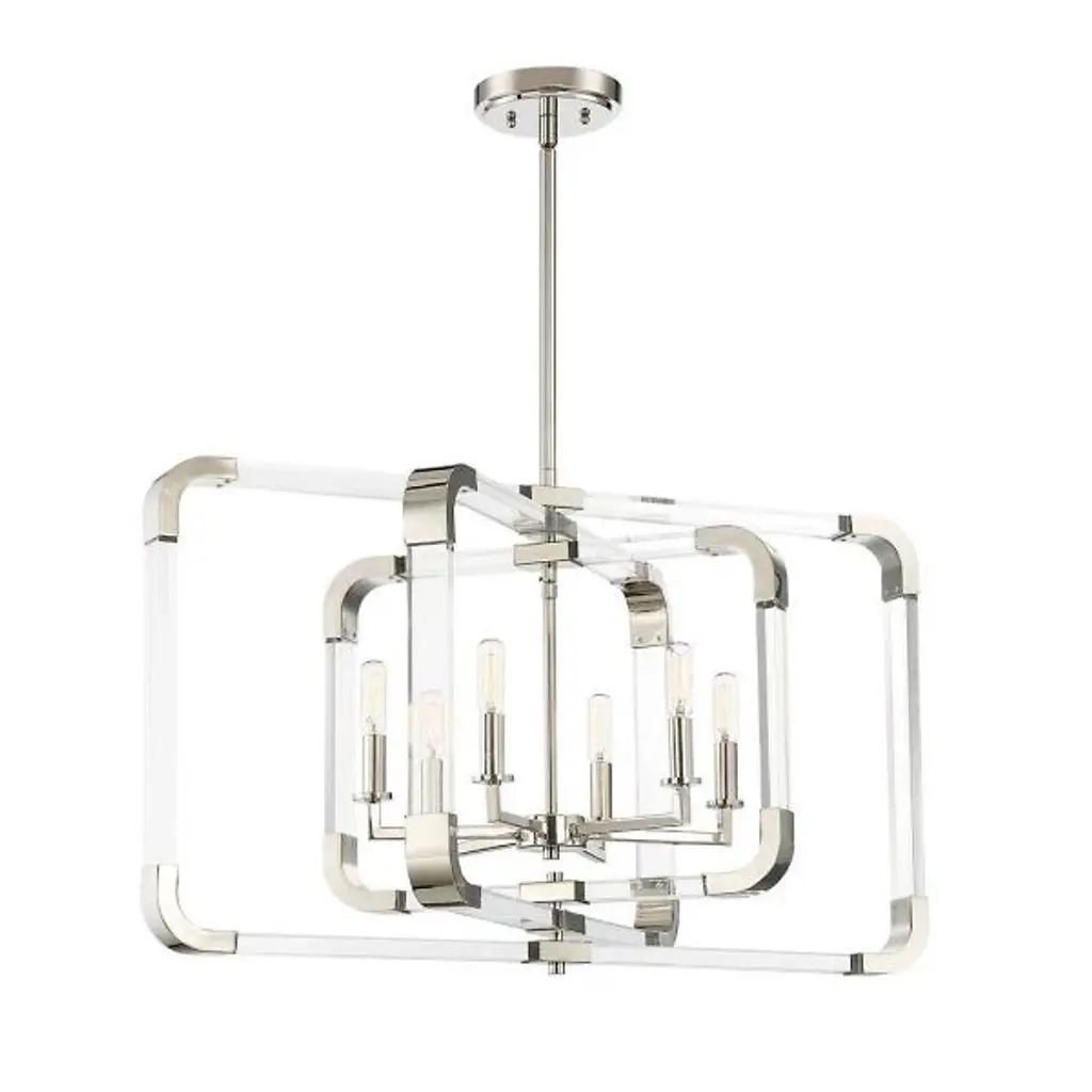 Fancy and flexible, Savoy House’s Rotterdam Rectangular Pendant uses posable frames of clear acrylic held together by smooth metal corners to draw attention to the open lamping. Set into sleek metal candelabra-style sockets pointing upward from a central hub, the Rotterdam’s structure is adjustable at your discretion and leaves the decision to slightly obscure its light at your discretion. An excellent choice to accent contemporary décor in larger living spaces, particularly over tables or counters.