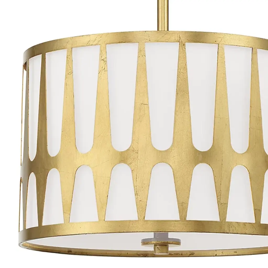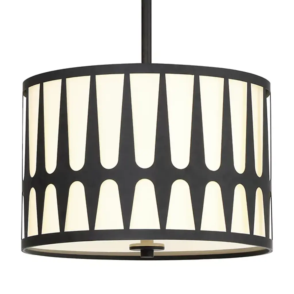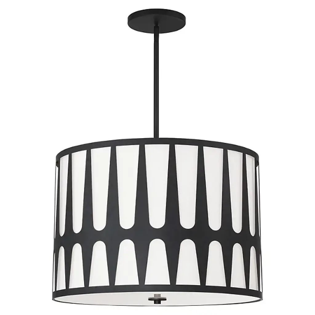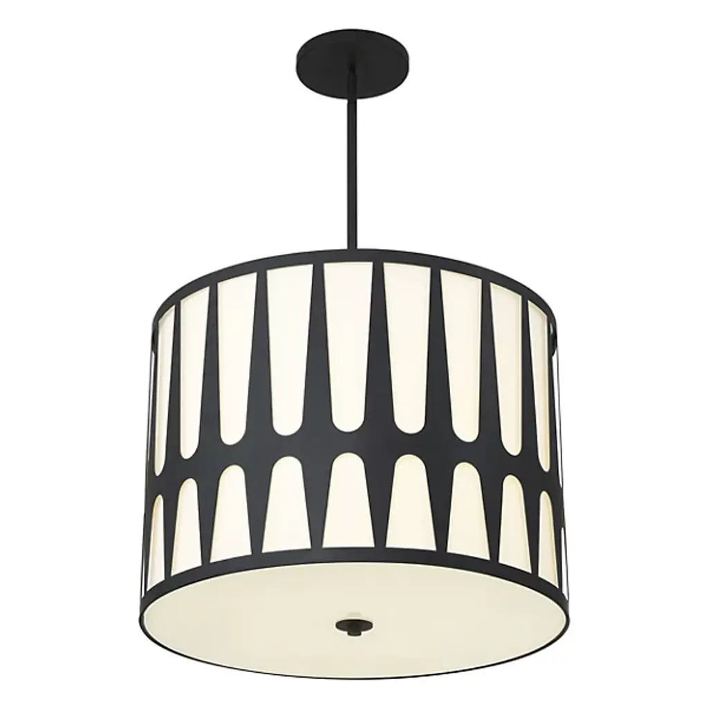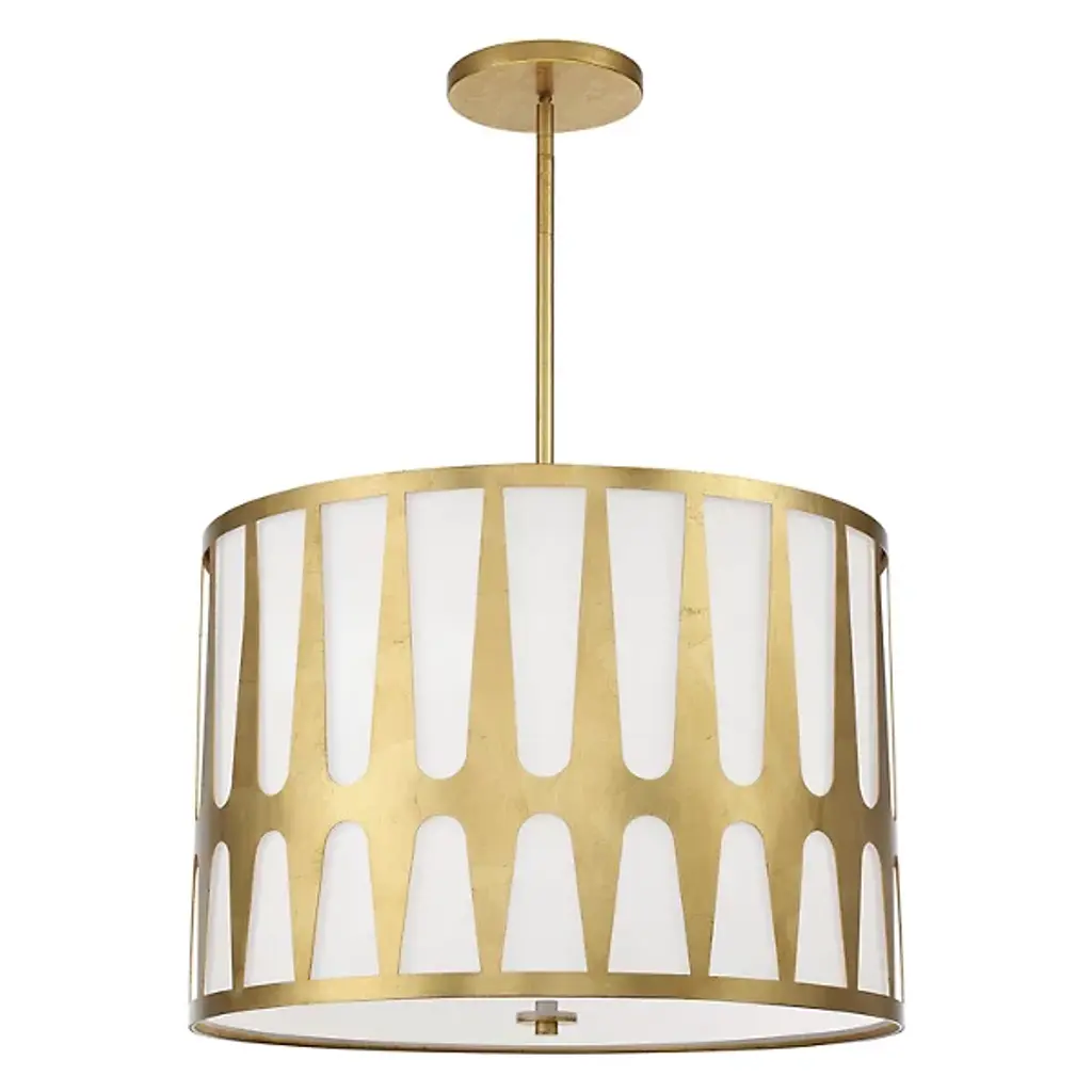 Striking and stylish, with an enduring Art Deco expressiveness, the Royston Drum Pendant from Crystorama dazzles with an artsy metal pattern overlay fronting an inner white silk shade suspended from a single downrod. This juxtaposition creates its intriguing profile, adding texture, while a glass diffuser softens direct light, casting soft illumination throughout its environment, resulting in a perfect marriage of classic and modern styles.