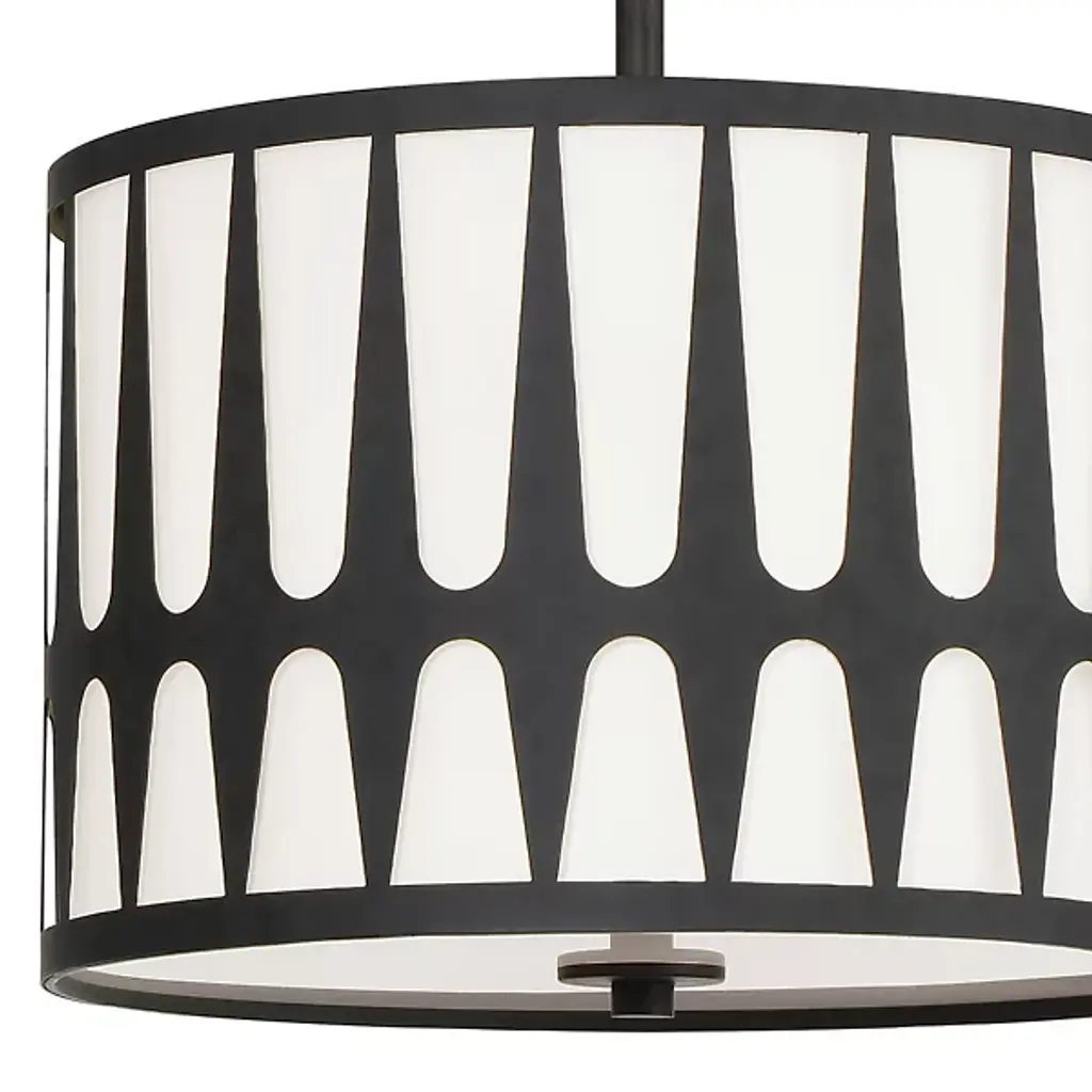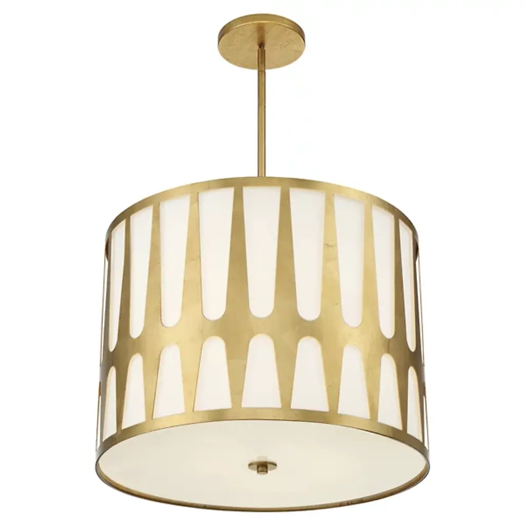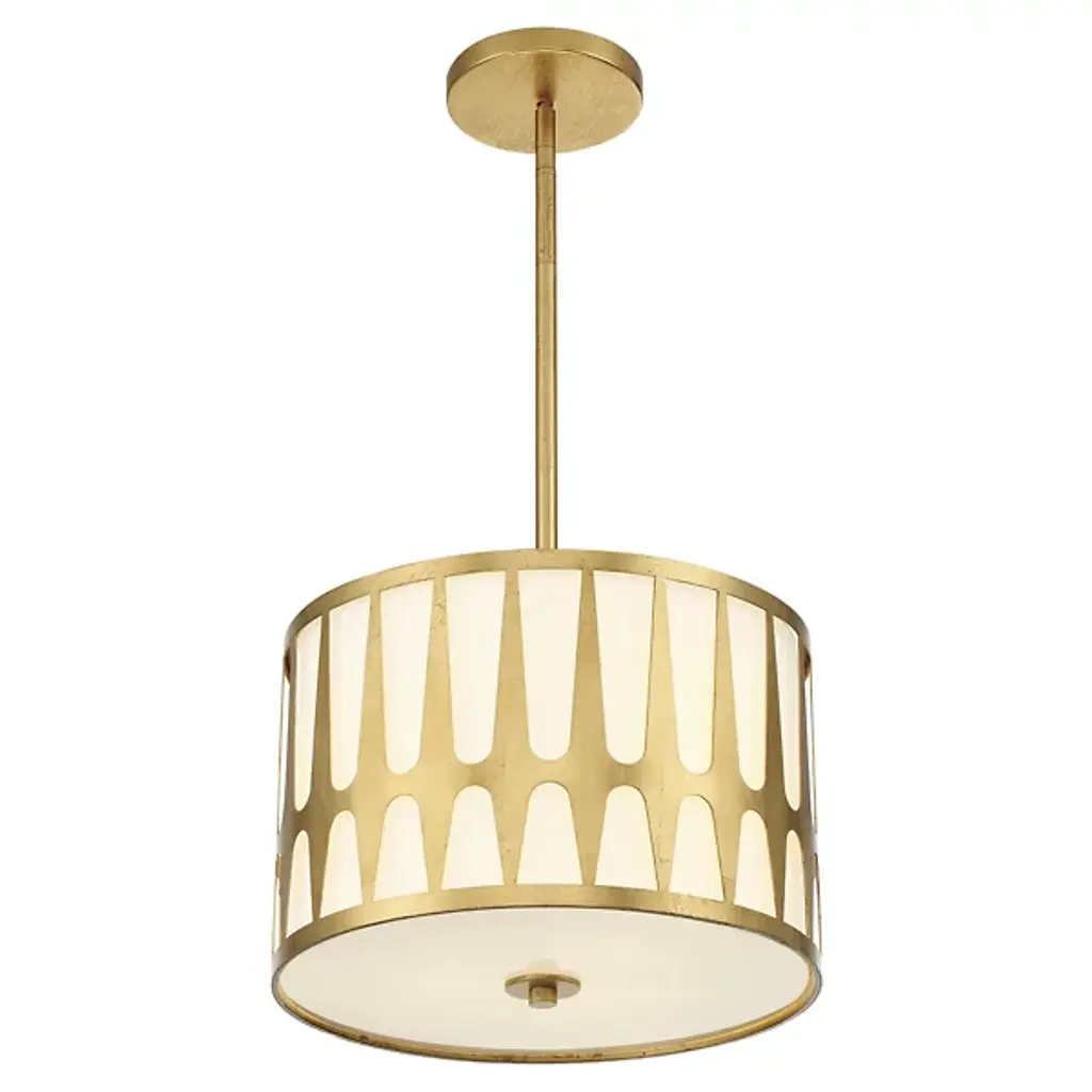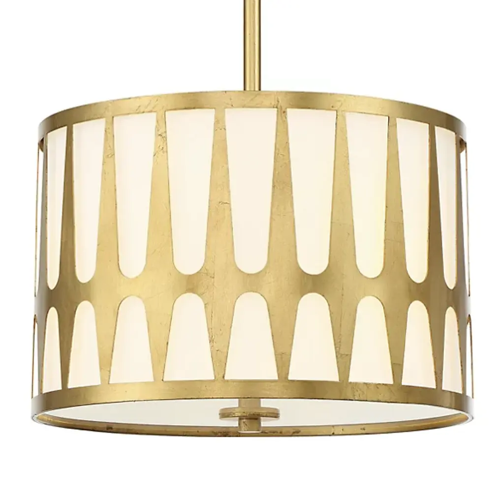Striking and stylish, with an enduring Art Deco expressiveness, the Royston Drum Pendant from Crystorama dazzles with an artsy metal pattern overlay fronting an inner white silk shade suspended from a single downrod. This juxtaposition creates its intriguing profile, adding texture, while a glass diffuser softens direct light, casting soft illumination throughout its environment, resulting in a perfect marriage of classic and modern styles.