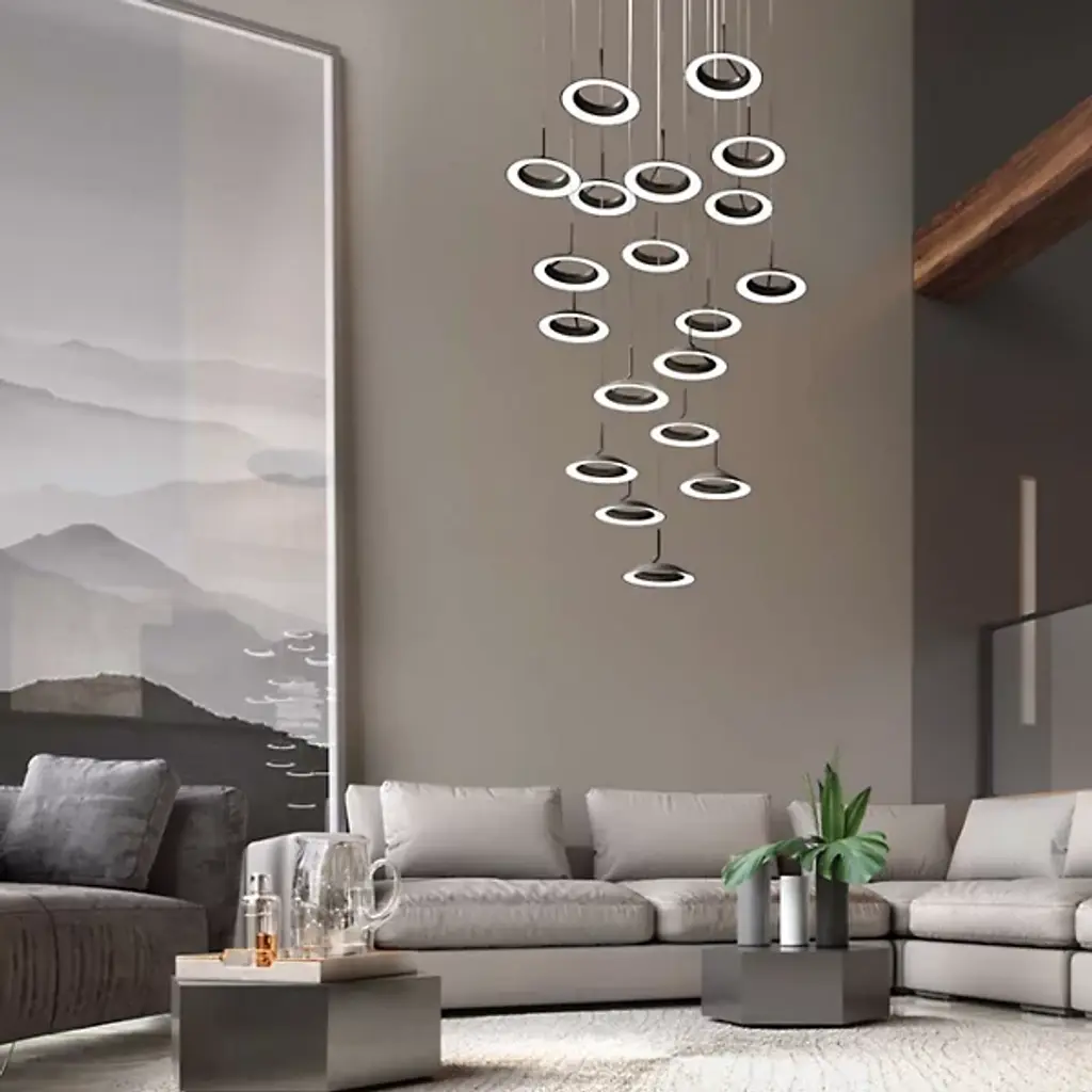 The Royyo LED Multi Light Pendant by Koncept is a modern statement piece for your home. Individual pendants are formed from fully recyclable Aluminum into smooth and minimal circular silhouettes with a Glass shade and house an integrated LED light source. Paired together into a tiered group, the elegant composition of this piece emits an even and bright light. With an energy efficient and sleek design, the Royyo Multi Light Pendant adds a stylish flair to entryways and living spaces.