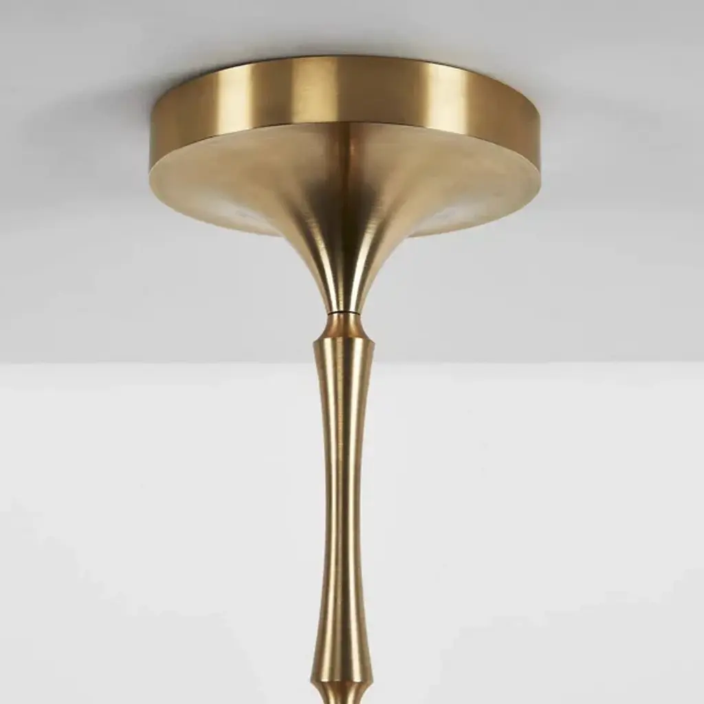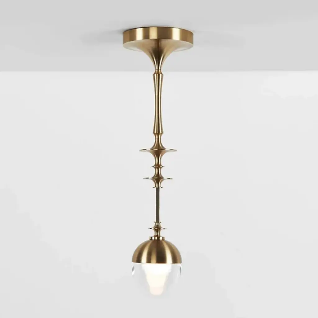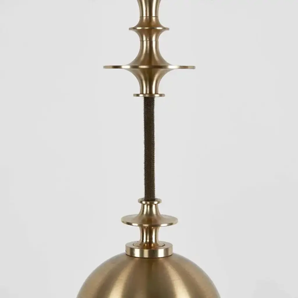 The Rue Sala Corded Single Pendant from Roll & Hill enhances interiors with a refined vintage appeal and a deceptively delicate artistic appearance. A Jessica Helgerson design inspired by summers at her ancestral home in Lyon, it sweeps down from a rounded canopy, using a slim stem embellished with disc accents and sleek contours and a short cord to suspend energy-efficient LED lamping below. A dome-shaped glass shade descends from a small brass bowl, contrasting well with the rich metal to dispense a bold and balanced wash of ambient light below that burnishes the metal abov