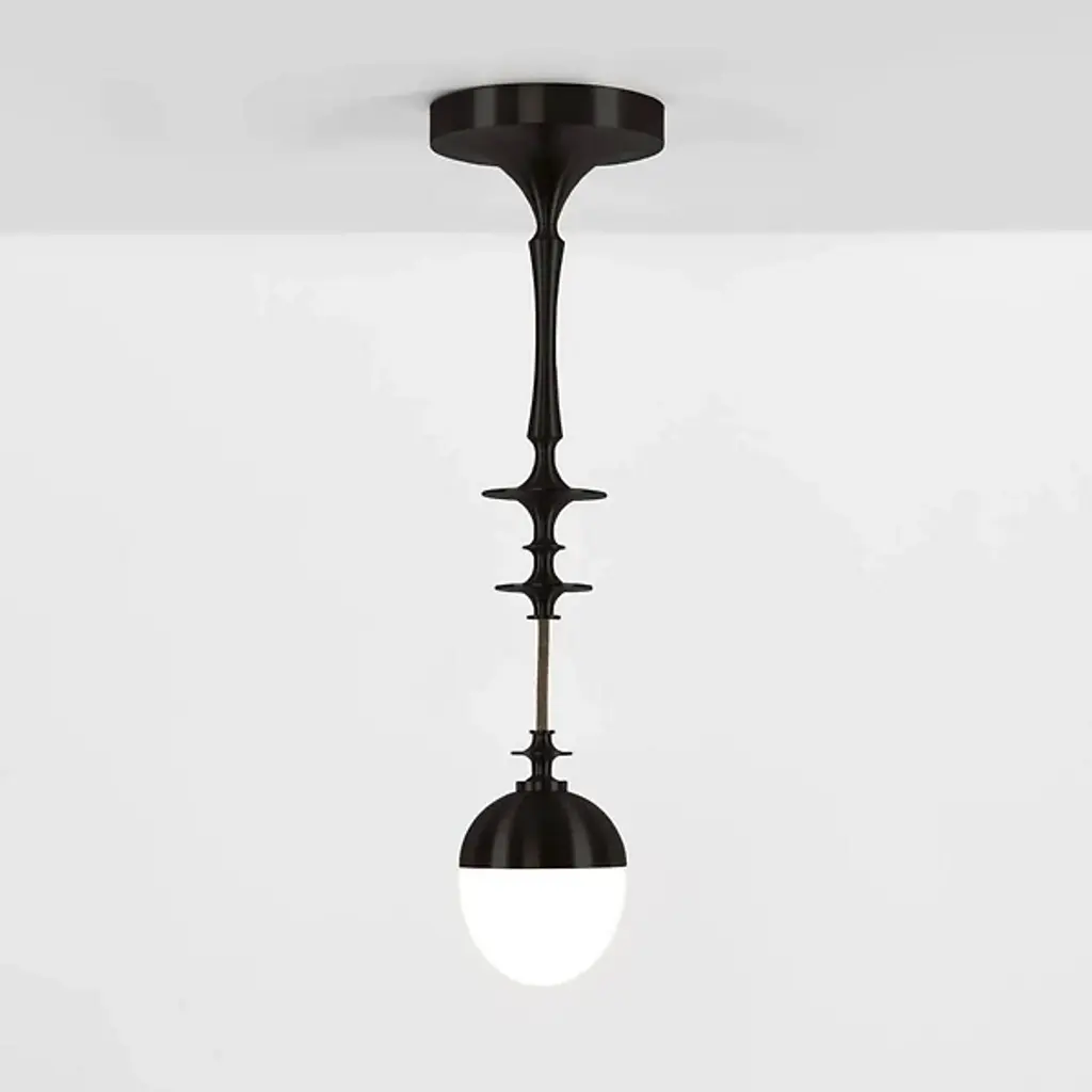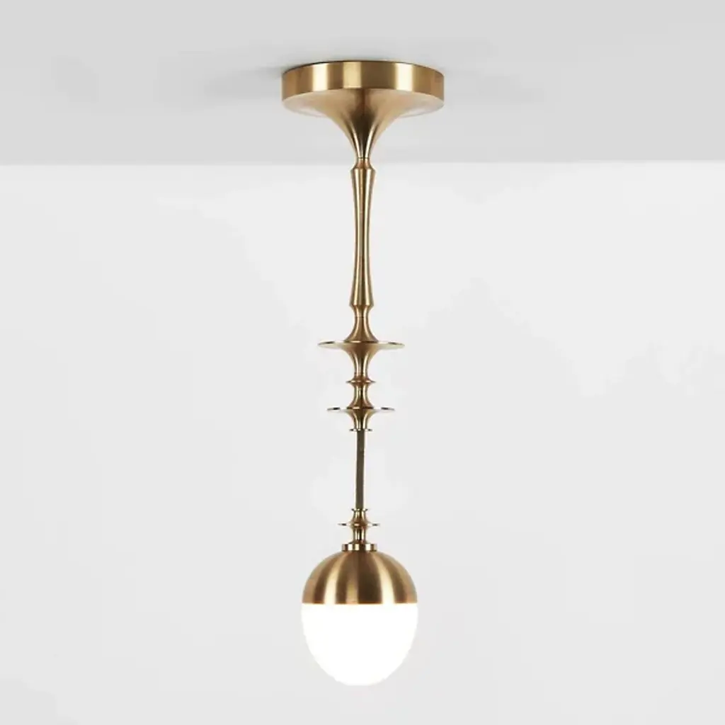 The Rue Sala Corded Single Pendant from Roll & Hill enhances interiors with a refined vintage appeal and a deceptively delicate artistic appearance. A Jessica Helgerson design inspired by summers at her ancestral home in Lyon, it sweeps down from a rounded canopy, using a slim stem embellished with disc accents and sleek contours and a short cord to suspend energy-efficient LED lamping below. A dome-shaped glass shade descends from a small brass bowl, contrasting well with the rich metal to dispense a bold and balanced wash of ambient light below that burnishes the metal abov