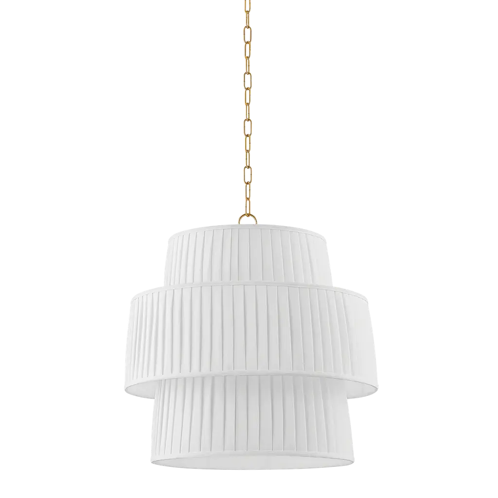 Floating like a cloud, the soft pleated linen shades of Rya are light as air. The stacked silhouette recalls a tiered cake, lending this pendant its architectural feel. Suspended from an Aged Brass chain, this oversized beauty glows from within. Part of our Dabito x Mitzi Tastemakers collection.