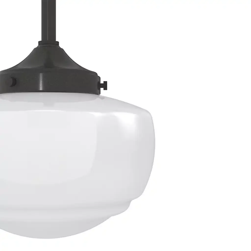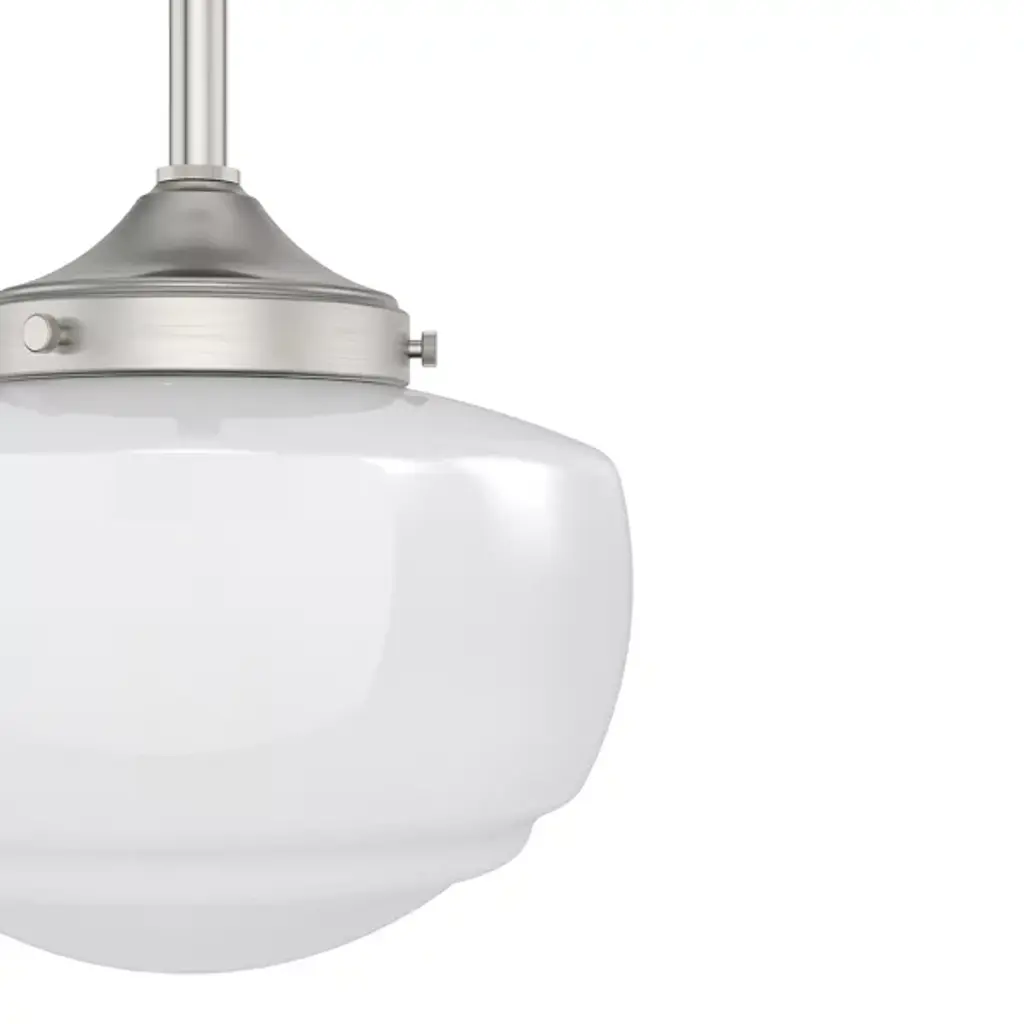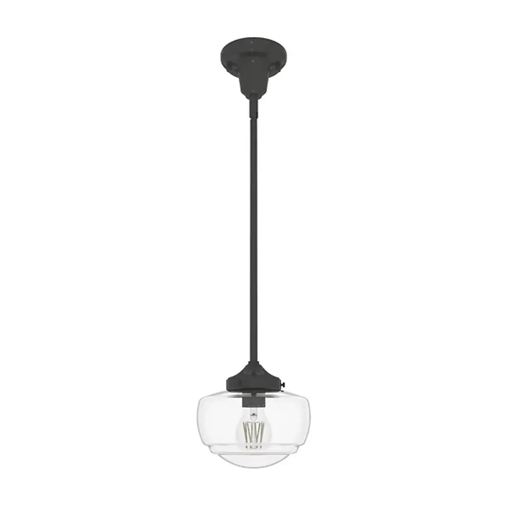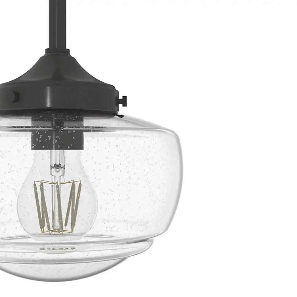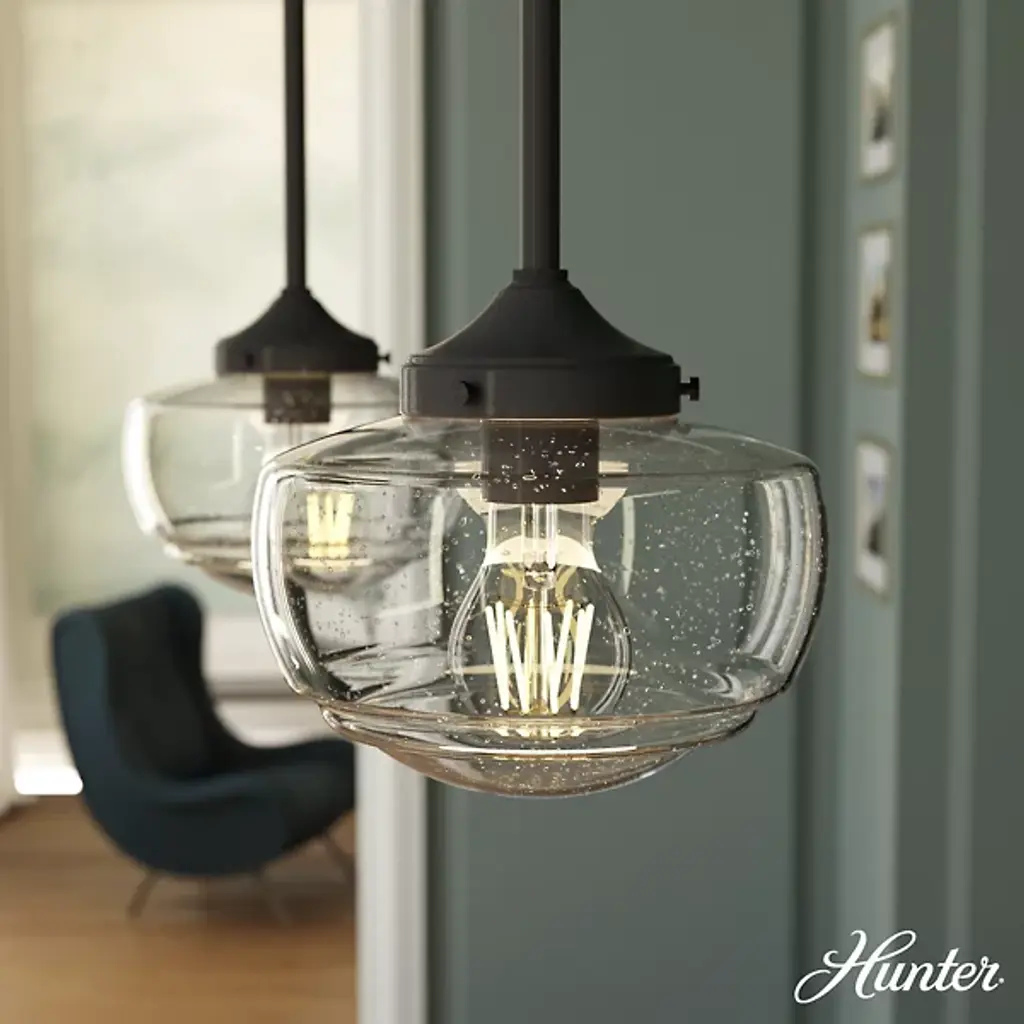 The Hunter Saddle Creek Mini Pendant by Hunter Fans combines traditional design and elevated elements. The light fixture draws inspiration from the iconic American schoolhouse light but adds an updated touch with subtle detailing in the glass shade. This transitionally styled light fixture is secured by a ceiling canopy, allowing bright light to emit from overhead.
