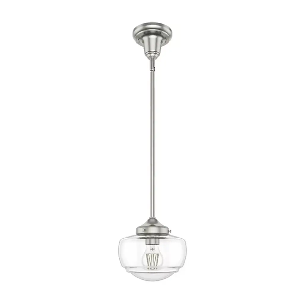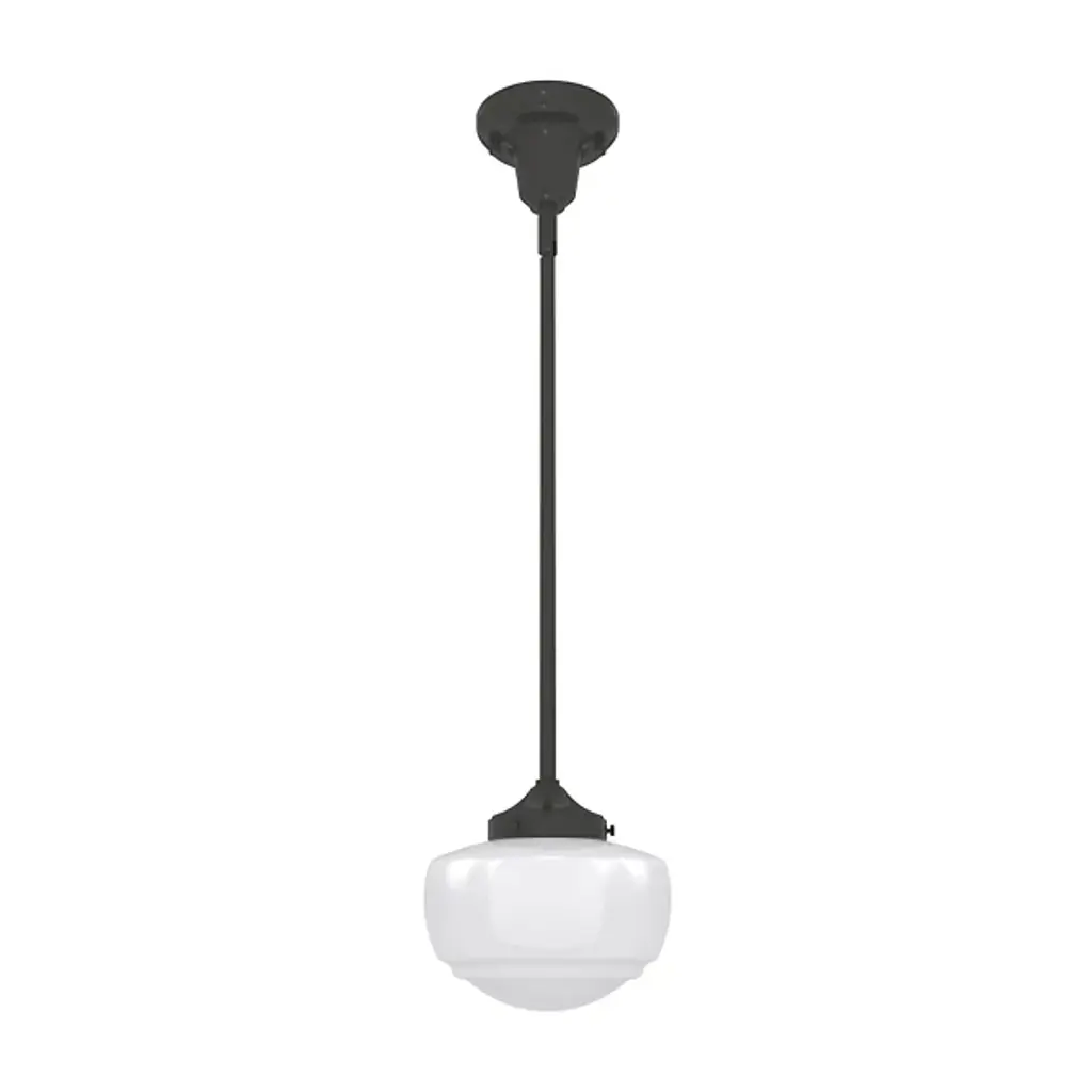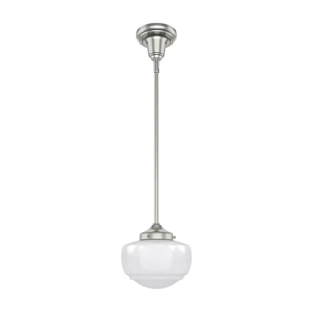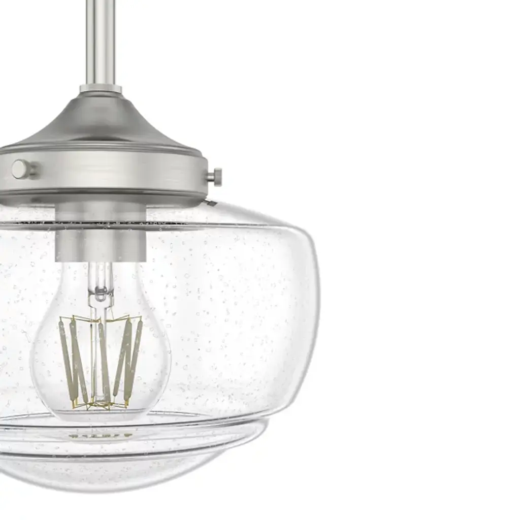 The Hunter Saddle Creek Mini Pendant by Hunter Fans combines traditional design and elevated elements. The light fixture draws inspiration from the iconic American schoolhouse light but adds an updated touch with subtle detailing in the glass shade. This transitionally styled light fixture is secured by a ceiling canopy, allowing bright light to emit from overhead.