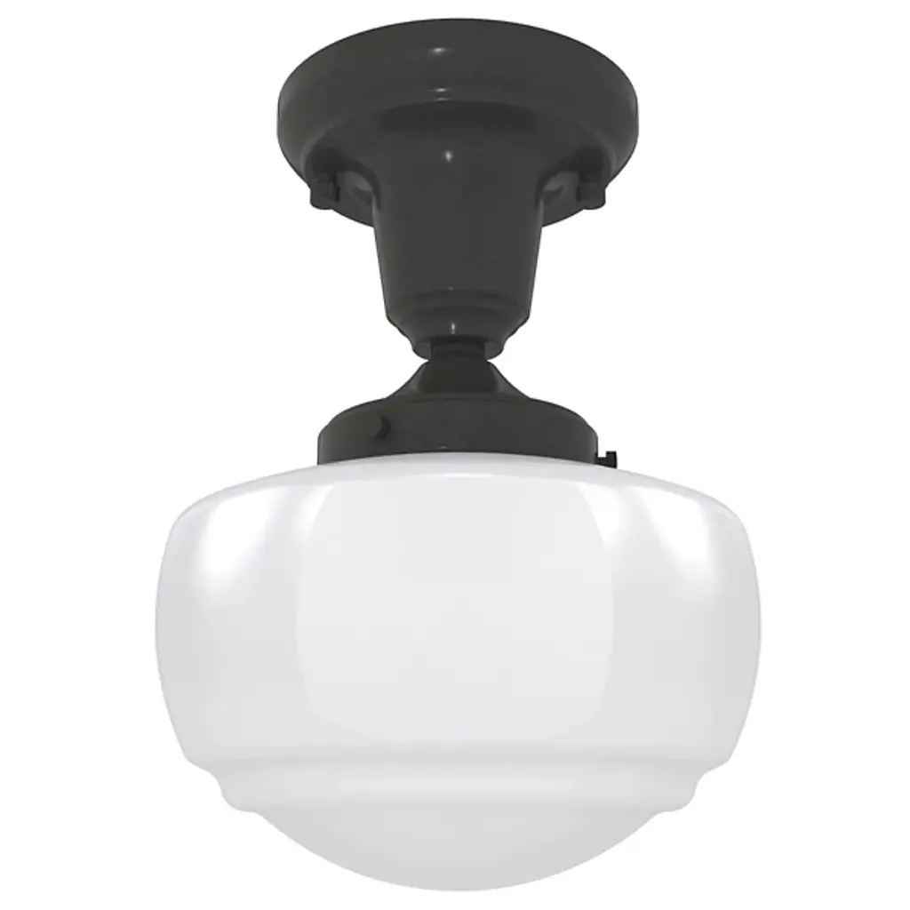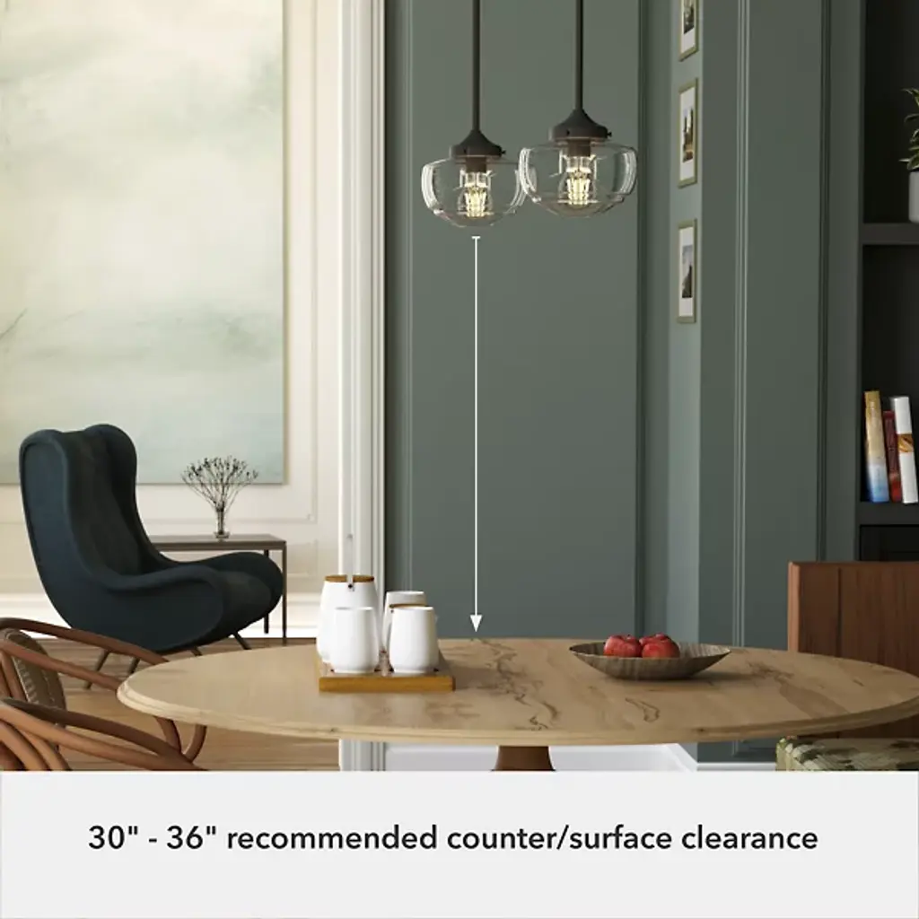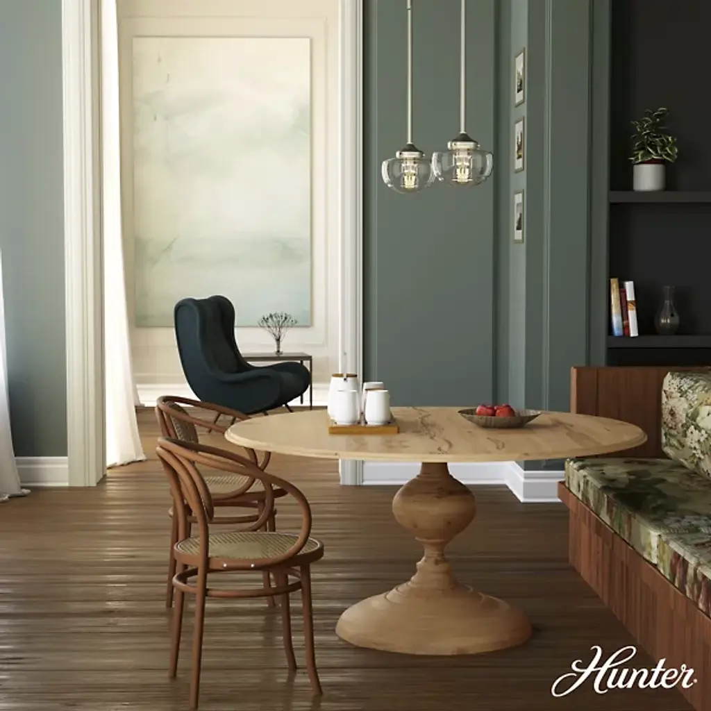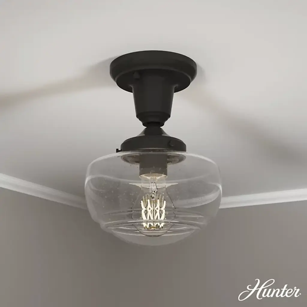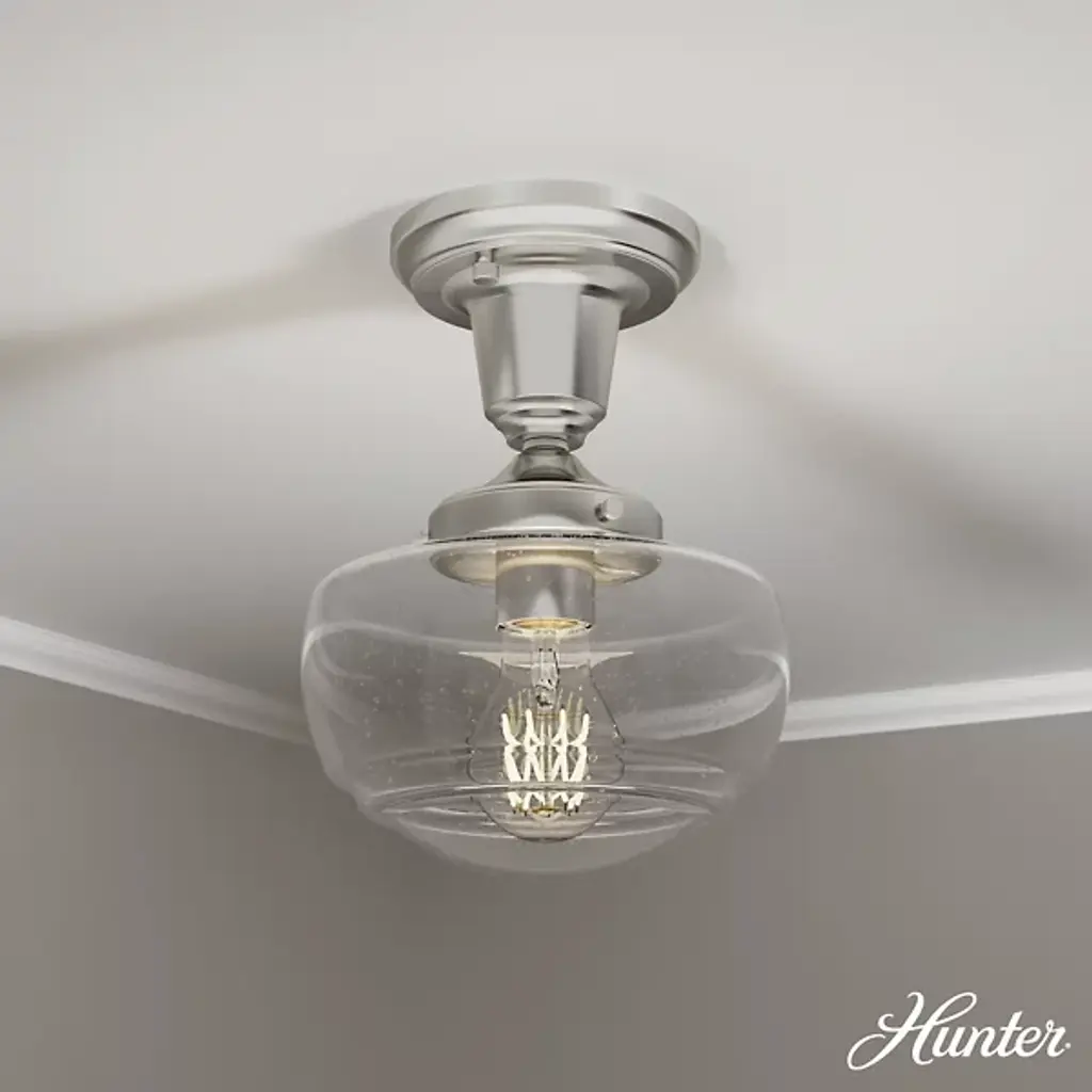 The Hunter Saddle Creek Mini Pendant by Hunter Fans combines traditional design and elevated elements. The light fixture draws inspiration from the iconic American schoolhouse light but adds an updated touch with subtle detailing in the glass shade. This transitionally styled light fixture is secured by a ceiling canopy, allowing bright light to emit from overhead.