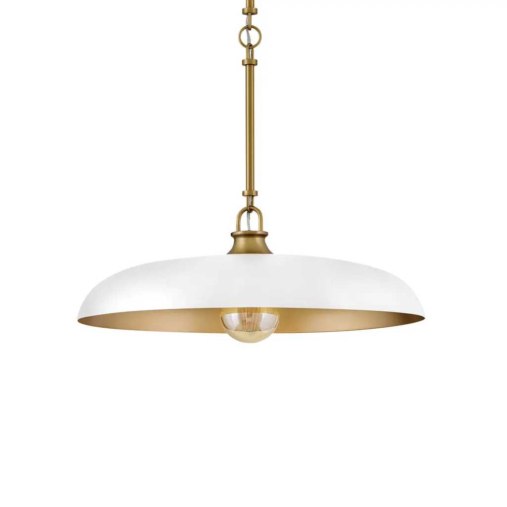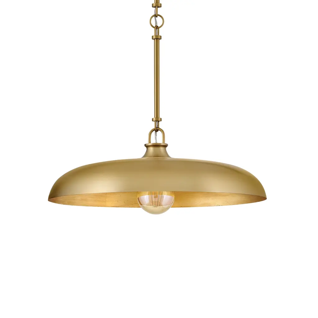 A sophisticated and transitional accent, the Sadie Pendant Light from Hinkley features a large yet shallow, saucer-style shade for a graceful look. This elegant pendant is defined by its wide shade, which has a classic two-tone finish with a contrasting interior to enhance its warm illumination. The shade is suspended from a decorative, chain-linked stem, adding a touch of refined, traditional detail. A fusion of classic details and contemporary form, it’s a timeless centerpiece for any home. Highlights: