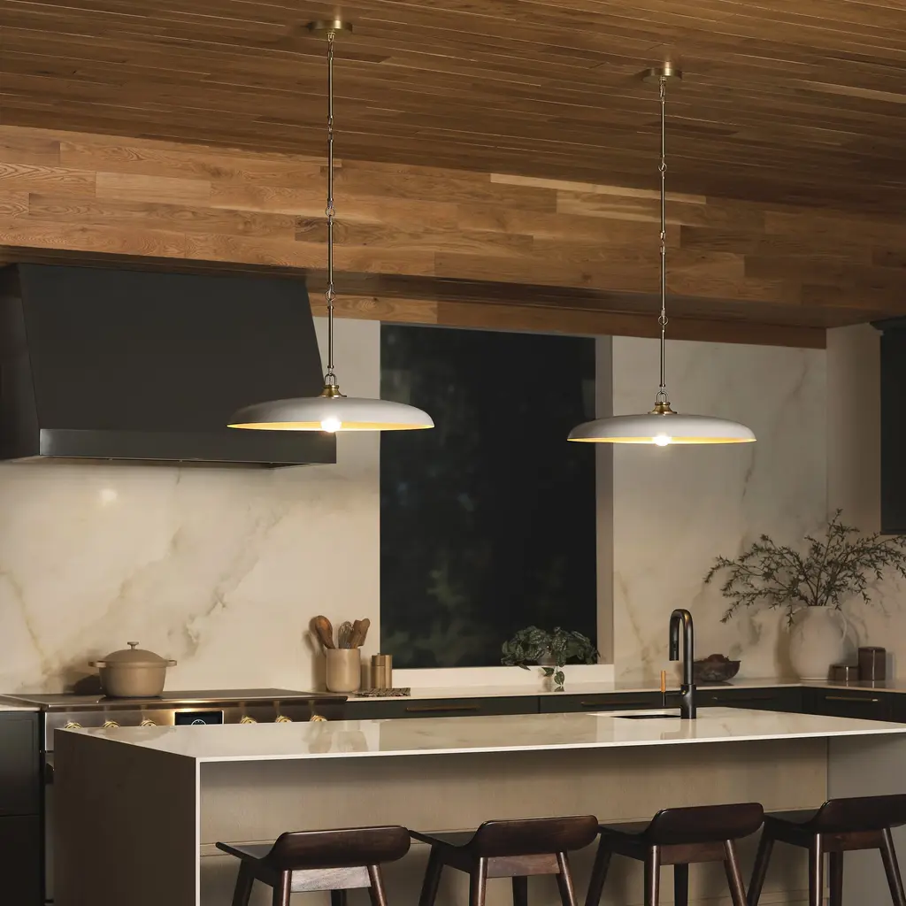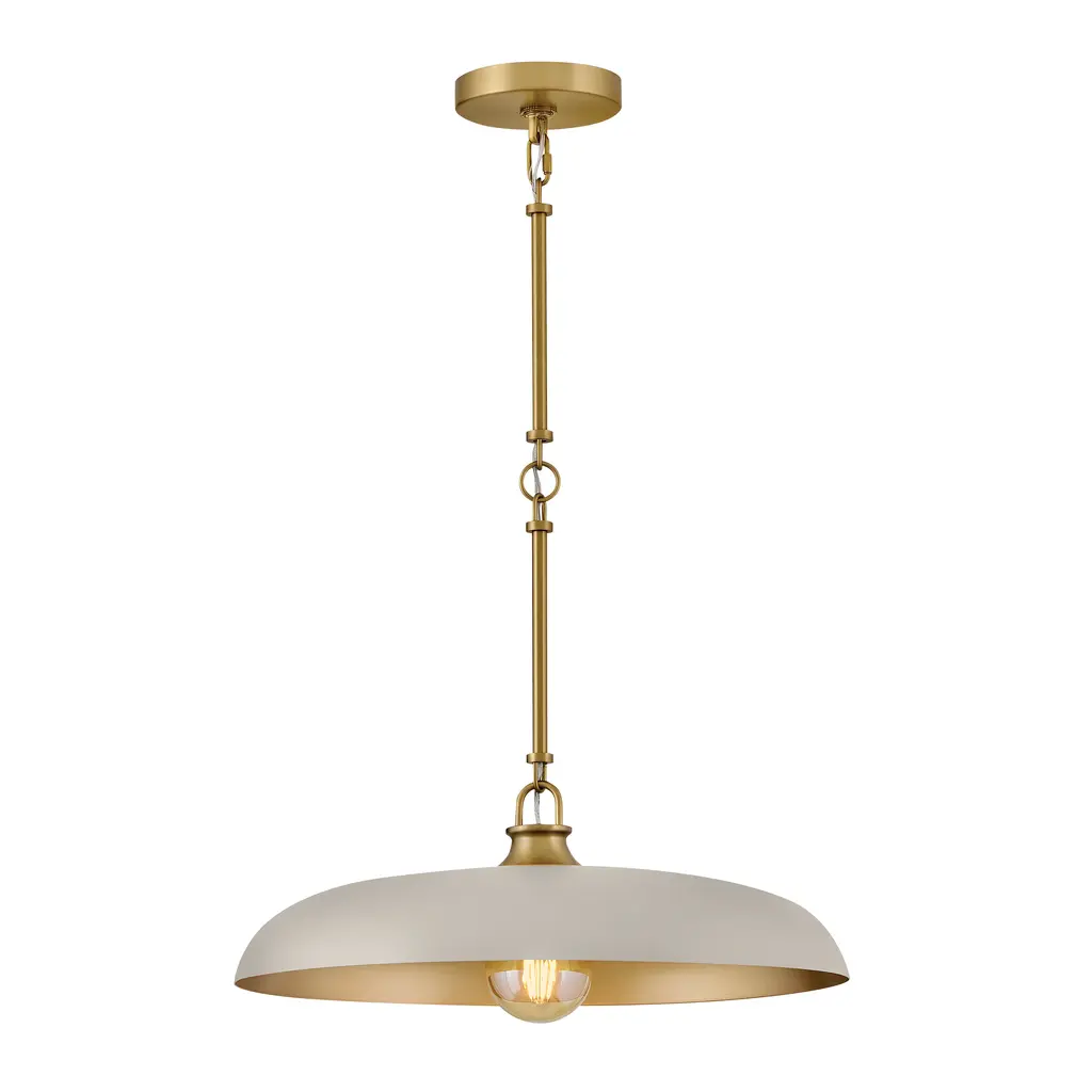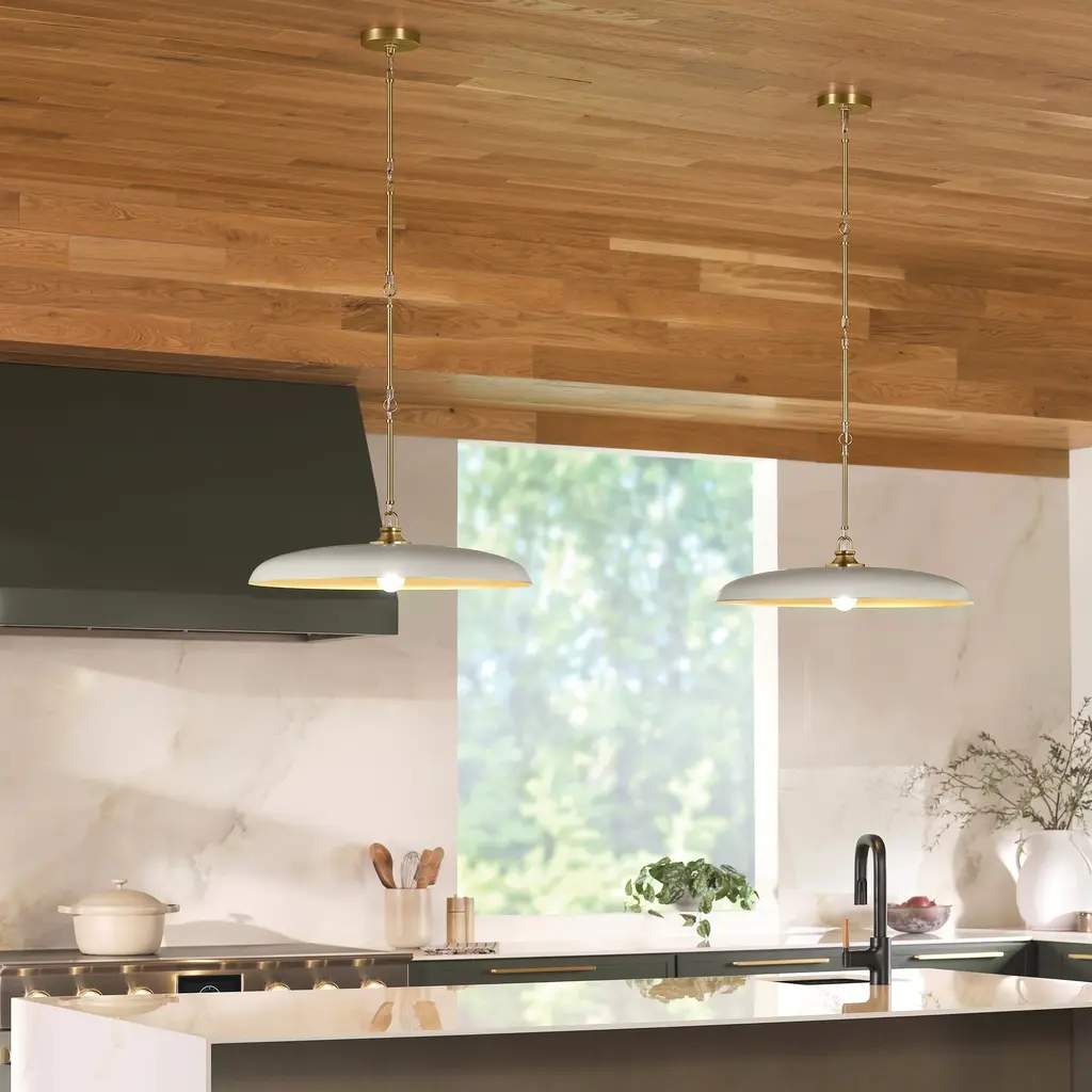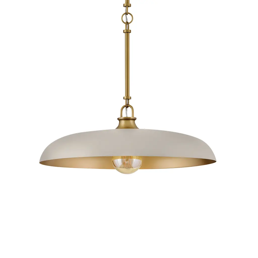 A sophisticated and transitional accent, the Sadie Pendant Light from Hinkley features a large yet shallow, saucer-style shade for a graceful look. This elegant pendant is defined by its wide shade, which has a classic two-tone finish with a contrasting interior to enhance its warm illumination. The shade is suspended from a decorative, chain-linked stem, adding a touch of refined, traditional detail. A fusion of classic details and contemporary form, it’s a timeless centerpiece for any home. Highlights:
