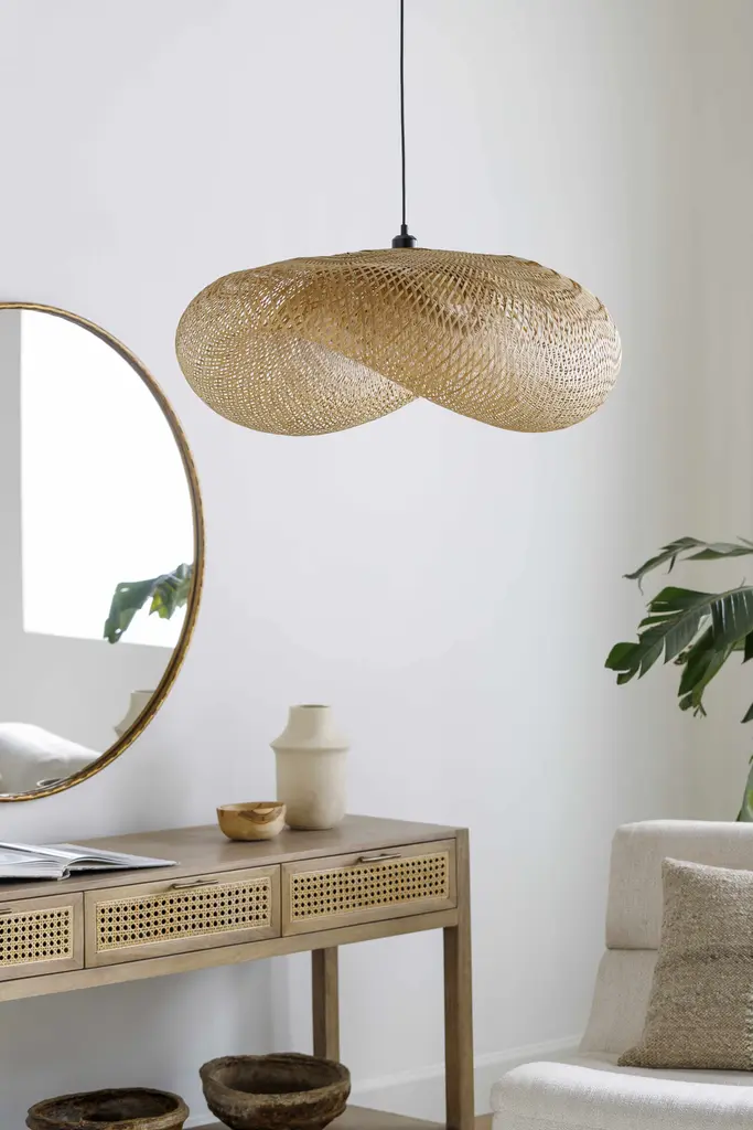 Collection: Sadzhavka Colors: Tan Material: Fixture: Bamboo Styles: Southwestern Made In: China Shade Color: CamelCamel Hanging Method: Cord Cord Length: 6' Switch Type: On/Off Number of Bulbs: 1 Socket Type: E-26 Bulb Wattage: 100W