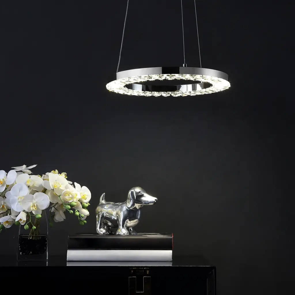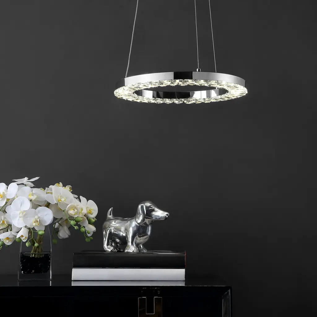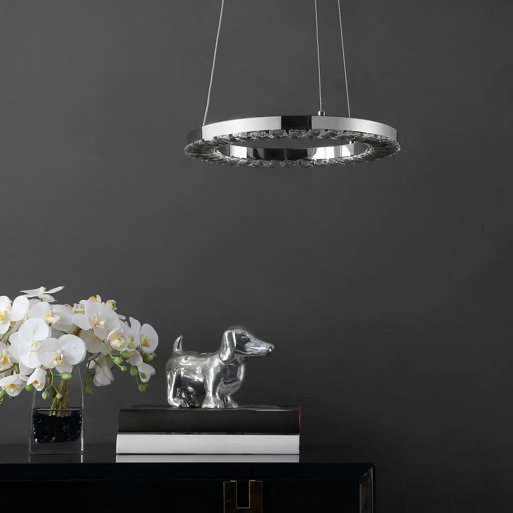 Lights, camera, action! This Messon Pendant's dimmable jewel-like LED lights and circular chrome frame bring Hollywood pizzazz to any modern or transitional decor. Cast the spotlight over a beloved display or above a seating area for effortless celebrity ambiance.