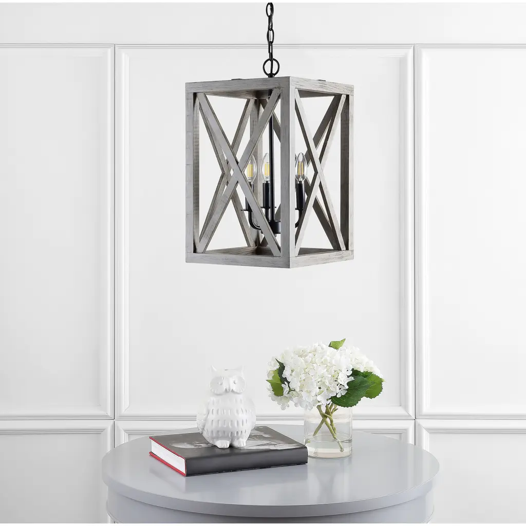 Crafted to recall the warm interiors of a chic Belgian farmhouse, this pendant light is a fresh spin on vintage style. The geometric black metal and wood-textured crisscross design that frames its interior lights brings modern luxury to any interior.