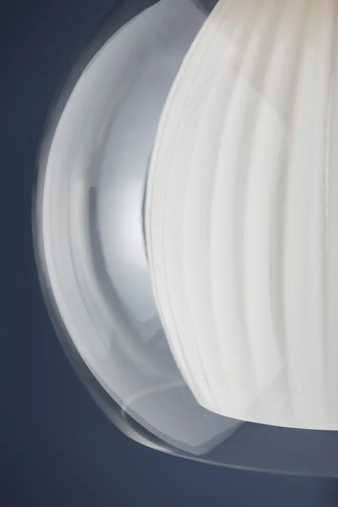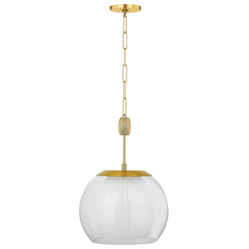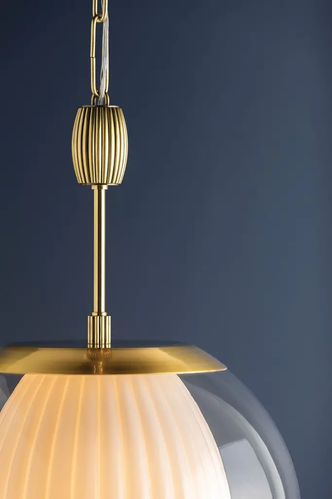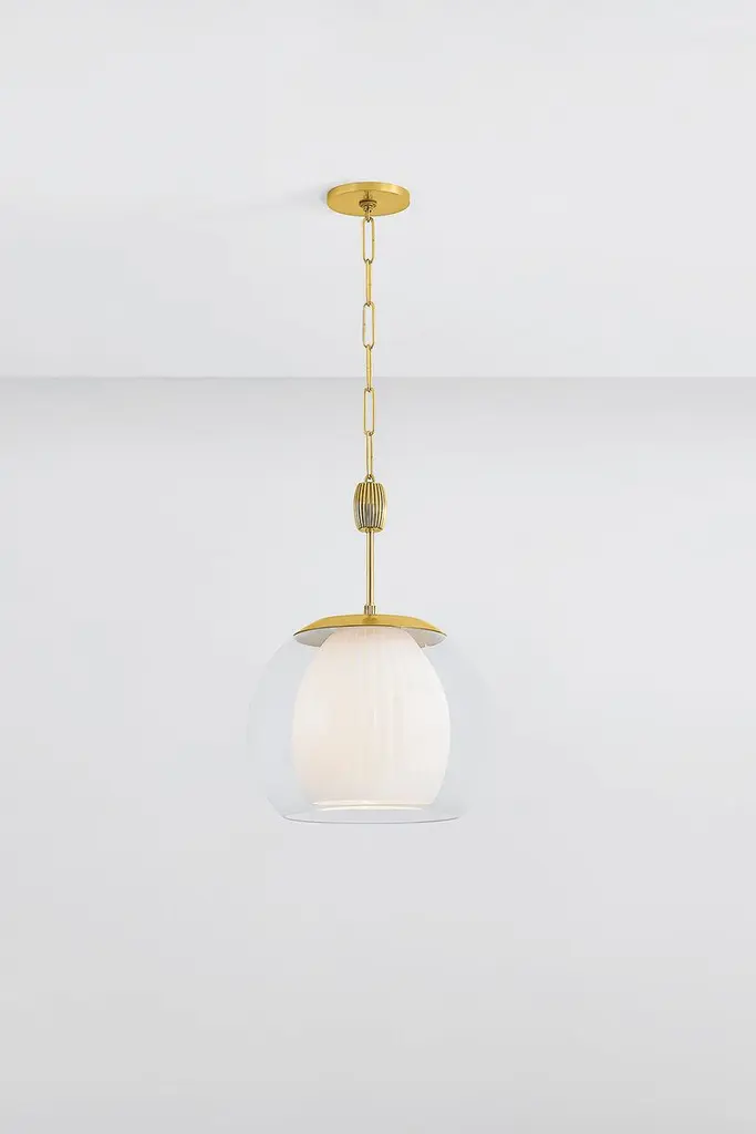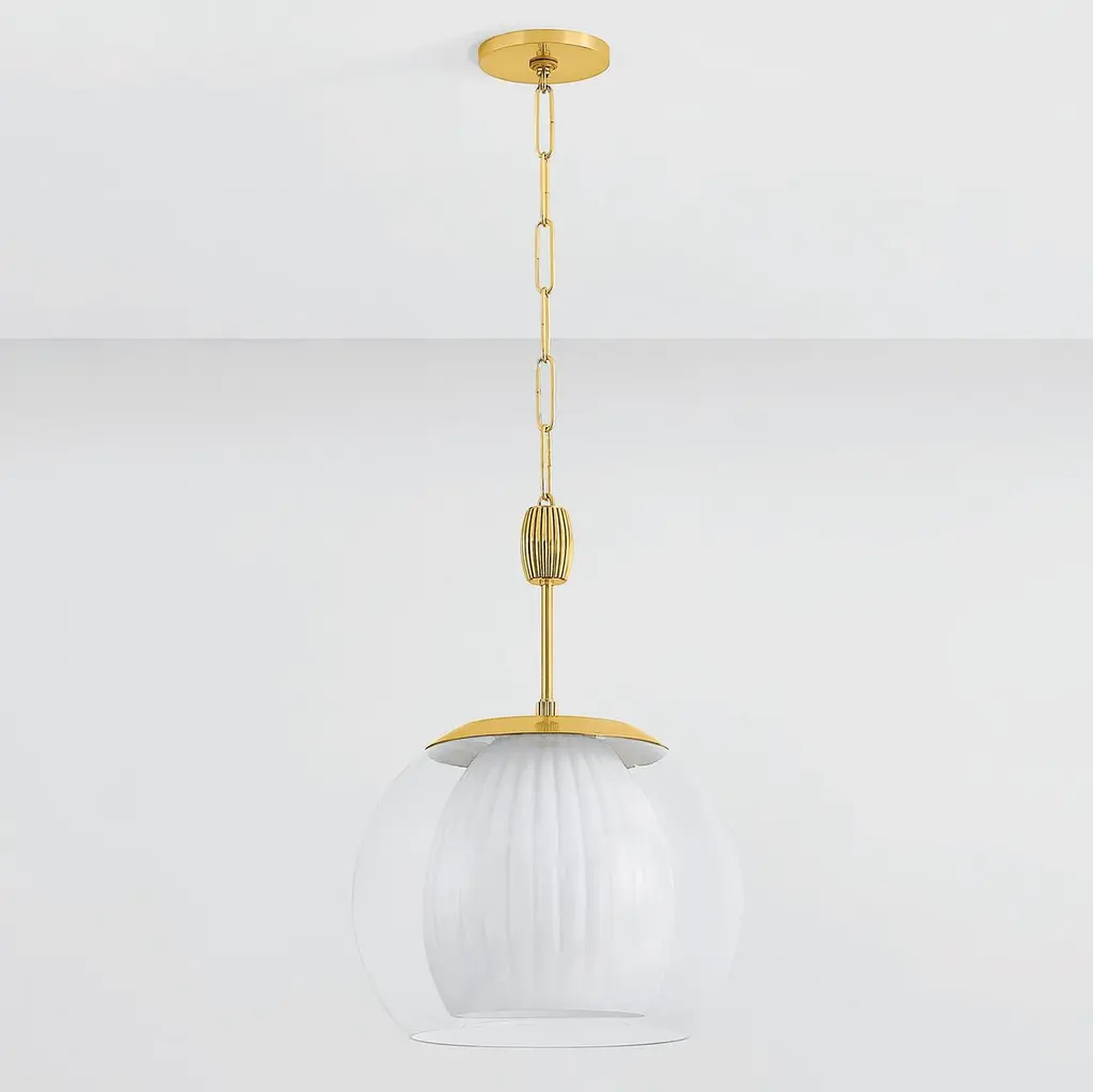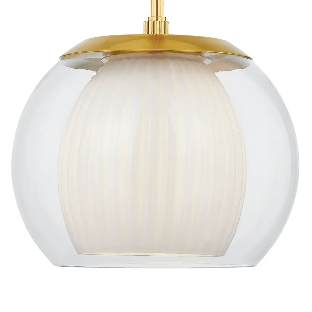 Inspired by nature, the retro silhouette of Saffron features a single orb accented by graceful details. The exterior shade is molded from clear glass, while the opal shiny glass interior features elegant fluting. Saffron can make a fresh statement alone or be grouped above a countertop.