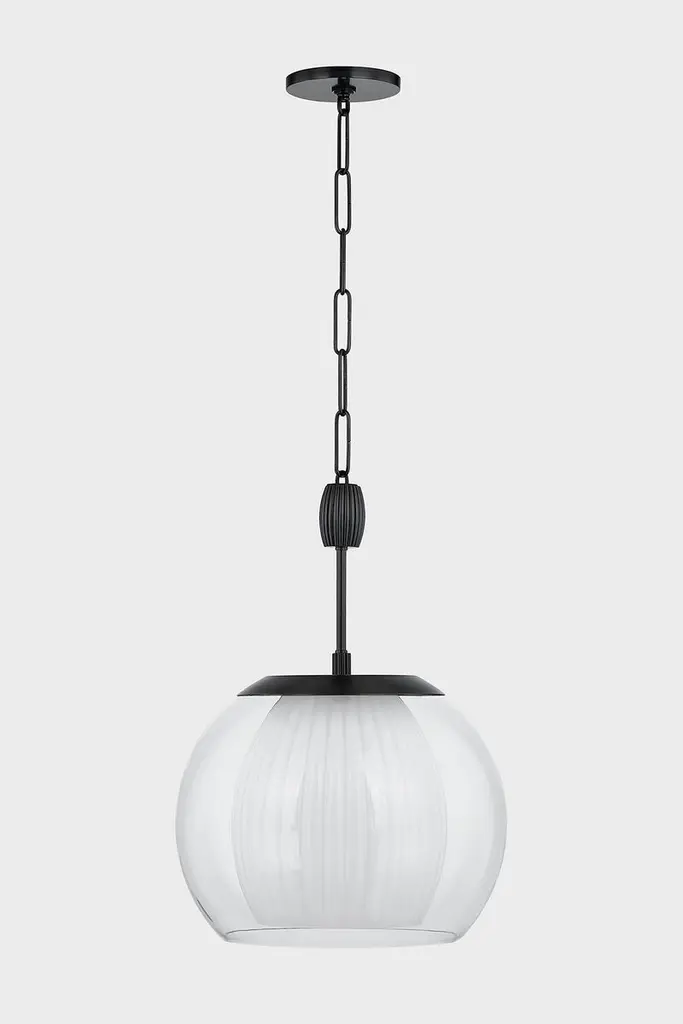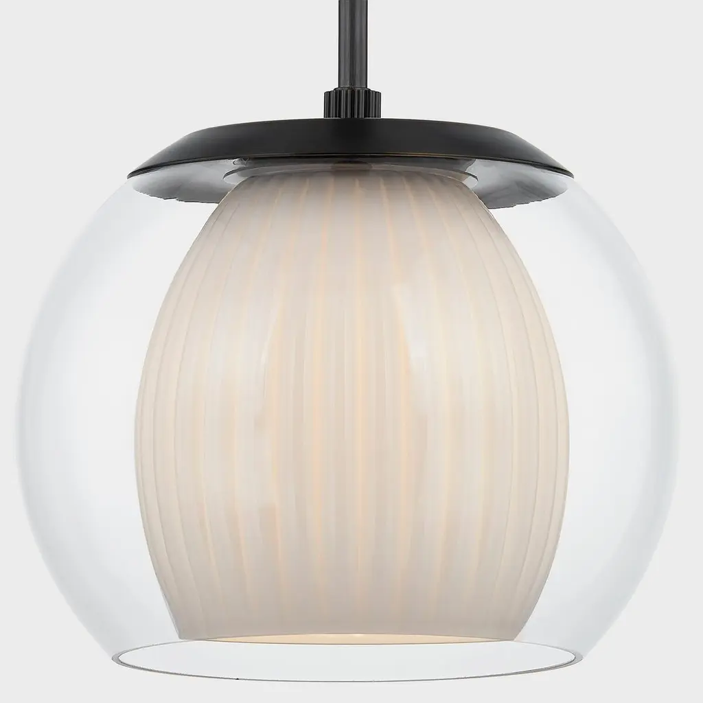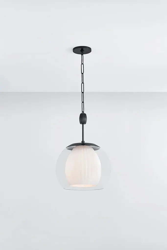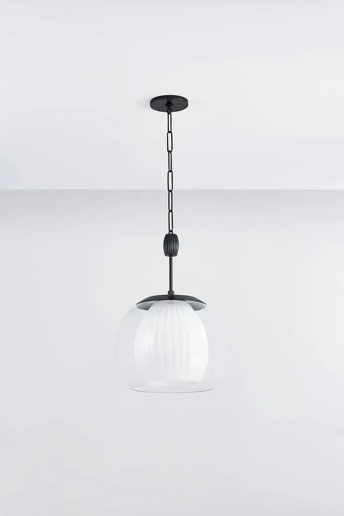 Inspired by nature, the retro silhouette of Saffron features a single orb accented by graceful details. The exterior shade is molded from clear glass, while the opal shiny glass interior features elegant fluting. Saffron can make a fresh statement alone or be grouped above a countertop.