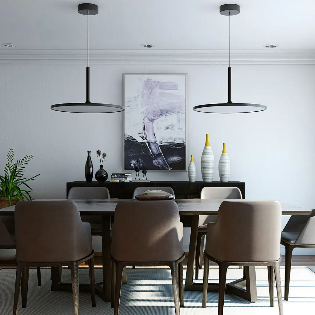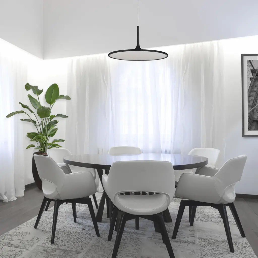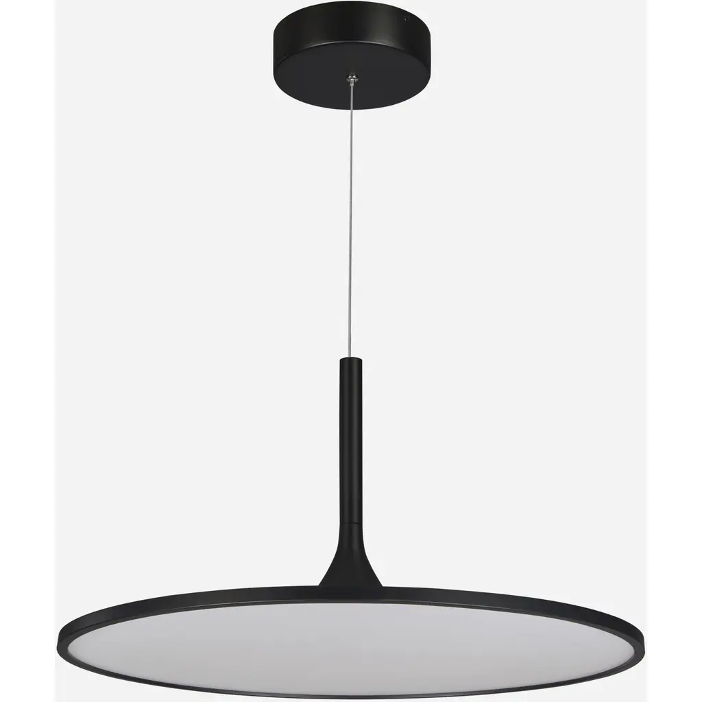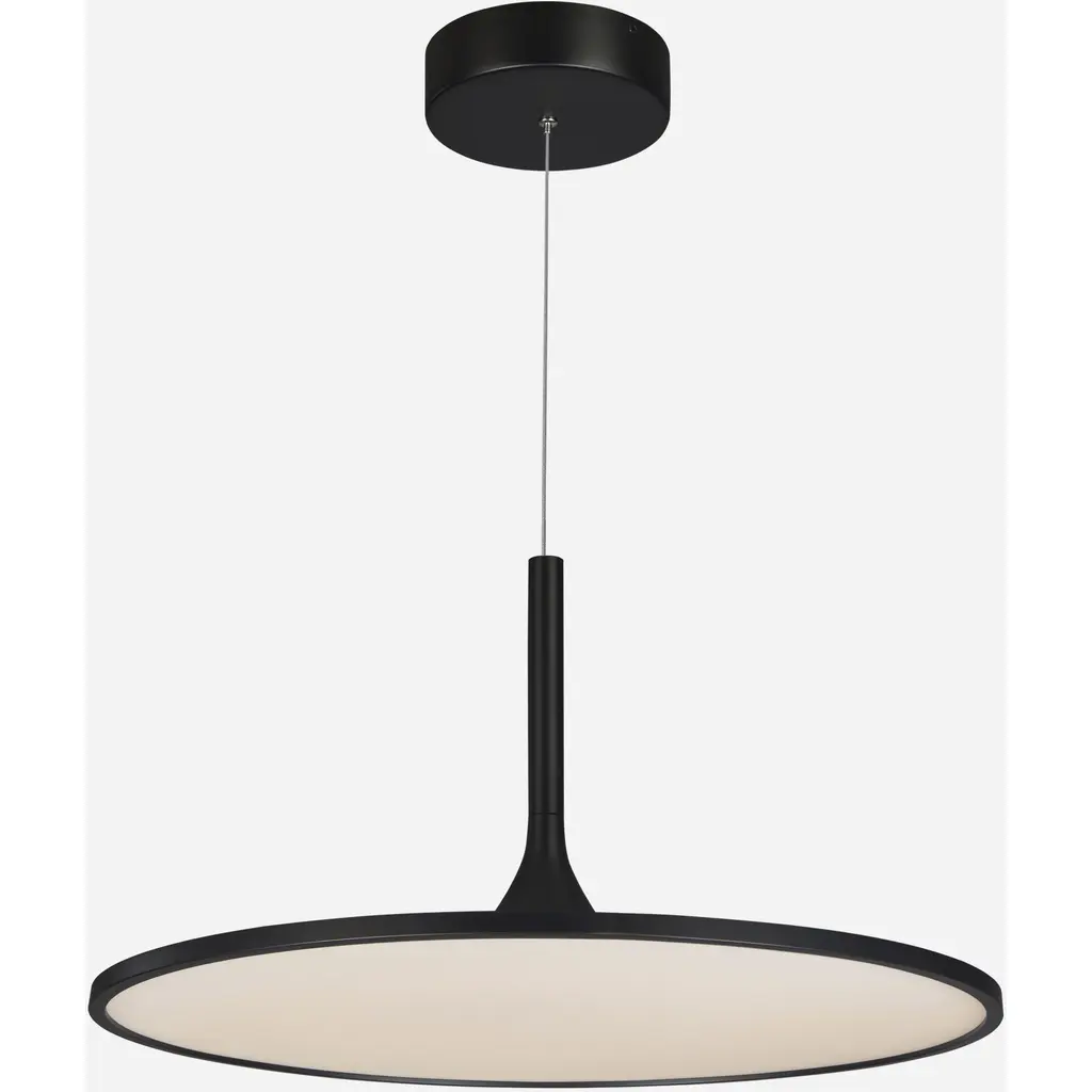 From VONN's Salm Series, the VMC31820BL Integrated LED Chandelier is a modern 24-inch fixture made from aluminum and acrylic, with a Black aluminum canopy and an Integrated LED Shade. The shade consists of a 24-inch sleek Disk Shade and 11-inch tall stem in a Black finish. Emitting a soft white ambient light at 3000 Kelvin, it offers adjustable height, dimmable functionality, and compatibility with sloped ceilings. With 3092.51 Lumens brightness, an energy-efficient power consumption of 45 Watts, and CRI 90, this chandelier combines style and efficiency for versatile and customizable illumination.