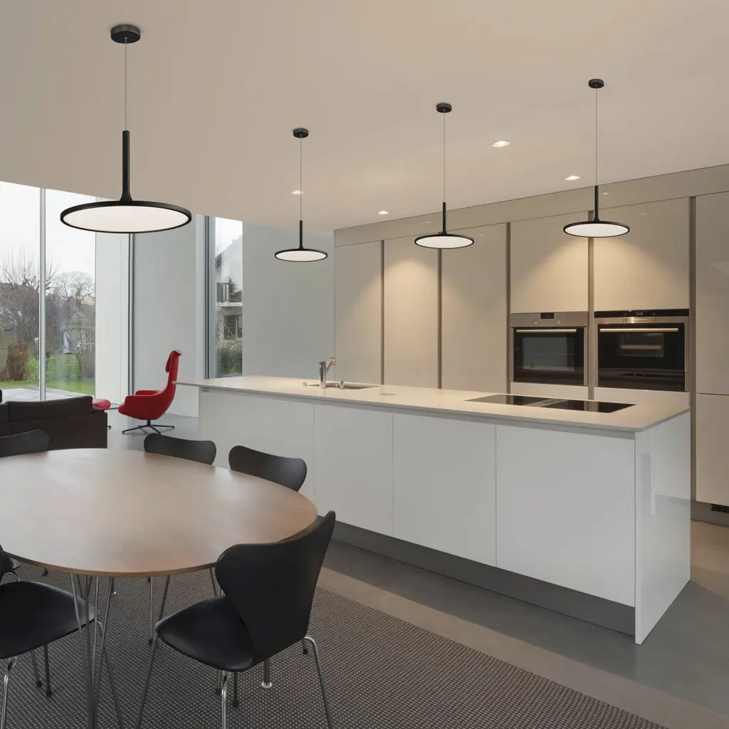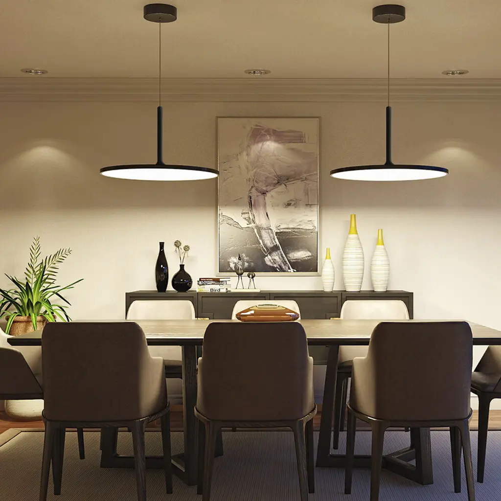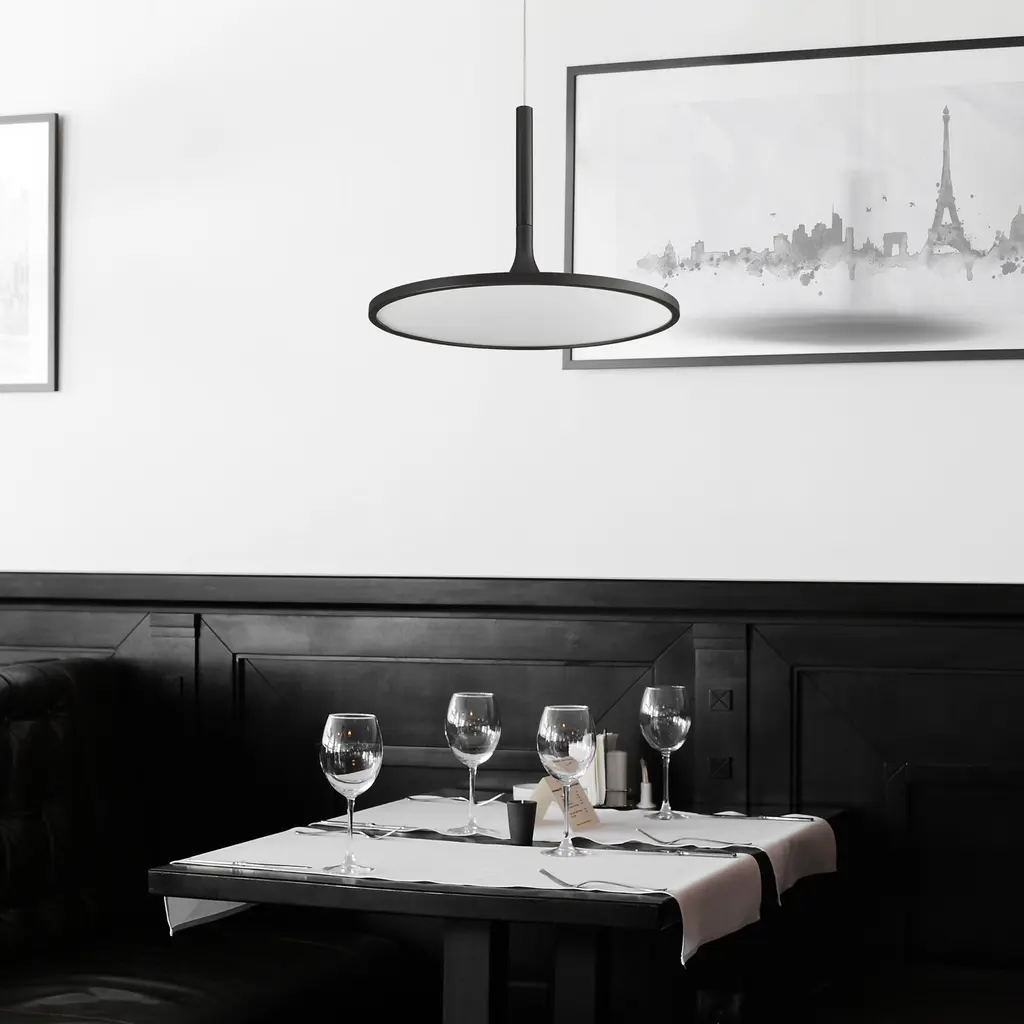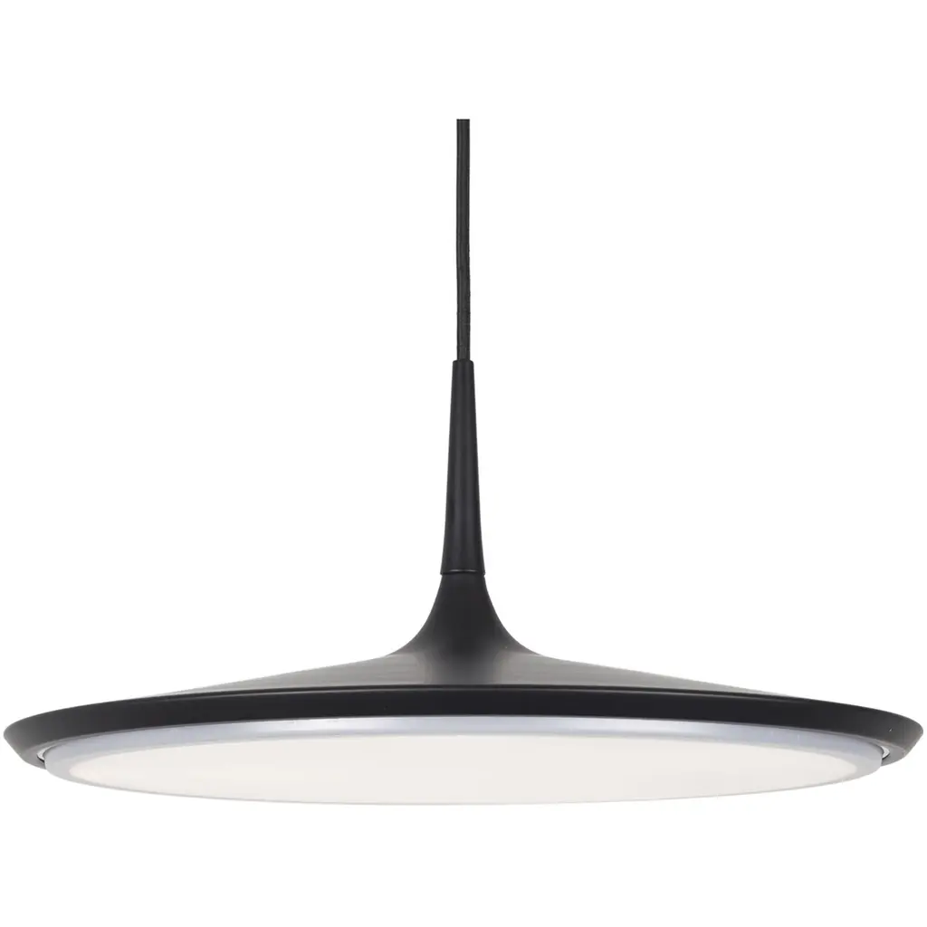 From VONN's Salm Series, the VMC31820BL Integrated LED Chandelier is a modern 24-inch fixture made from aluminum and acrylic, with a Black aluminum canopy and an Integrated LED Shade. The shade consists of a 24-inch sleek Disk Shade and 11-inch tall stem in a Black finish. Emitting a soft white ambient light at 3000 Kelvin, it offers adjustable height, dimmable functionality, and compatibility with sloped ceilings. With 3092.51 Lumens brightness, an energy-efficient power consumption of 45 Watts, and CRI 90, this chandelier combines style and efficiency for versatile and customizable illumination.