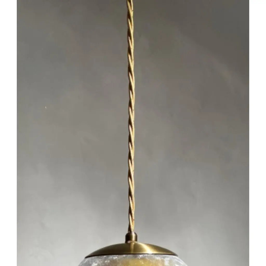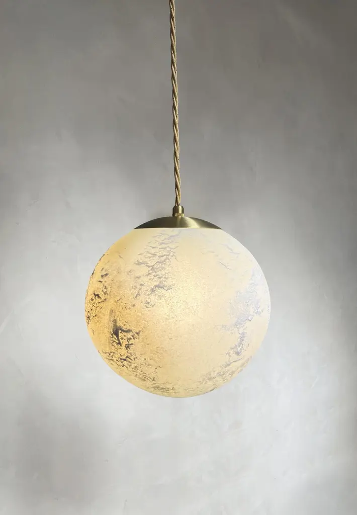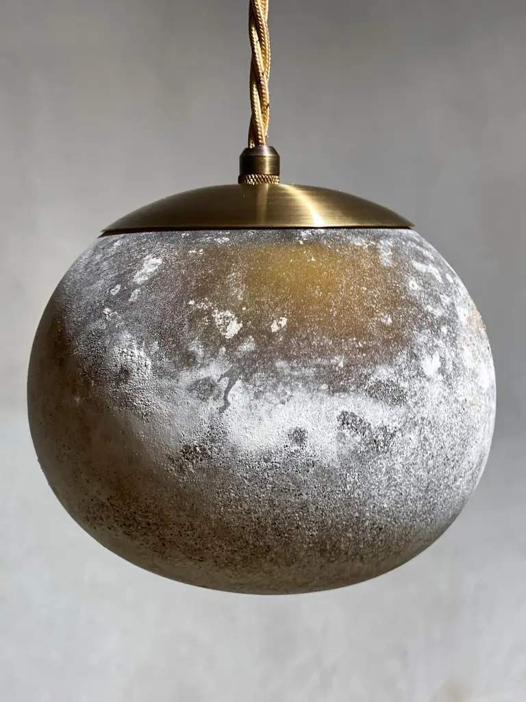 Salty Pendant Ball 18 by ContainDimensions: Ø 18 x H 100 cm (custom length).Materials: Blown glass from local production with salty process and brass structure.Available in different finishes and dimensions (14 cm Ø / 18 cm Ø / 20 cm Øx (custom length)). Please contact us.All our lamps can be wired according to each country. If sold to the USA it will be wired for the USA for instance.“You are where you live” So, we decided to live in Mallorca. We are Mauricio Obarrio and Juan Peralta and CONTAIN is our lighting and furniture design studio.This collection is the result of the collaboration between our studio, local artisans and the industrial sector; where creativity and simplicity creates a unique synergy and generates a narrative between the materials used and the pieces created. Our mission is to deliver artisan crafted, highly engineered, sophisticated yet simple lighting design solutions. Our studio's inspiration is fueled by an obsession with natural materials such as Brass, Glass, and Hardwoods along with a love for artisan craftsmanship.