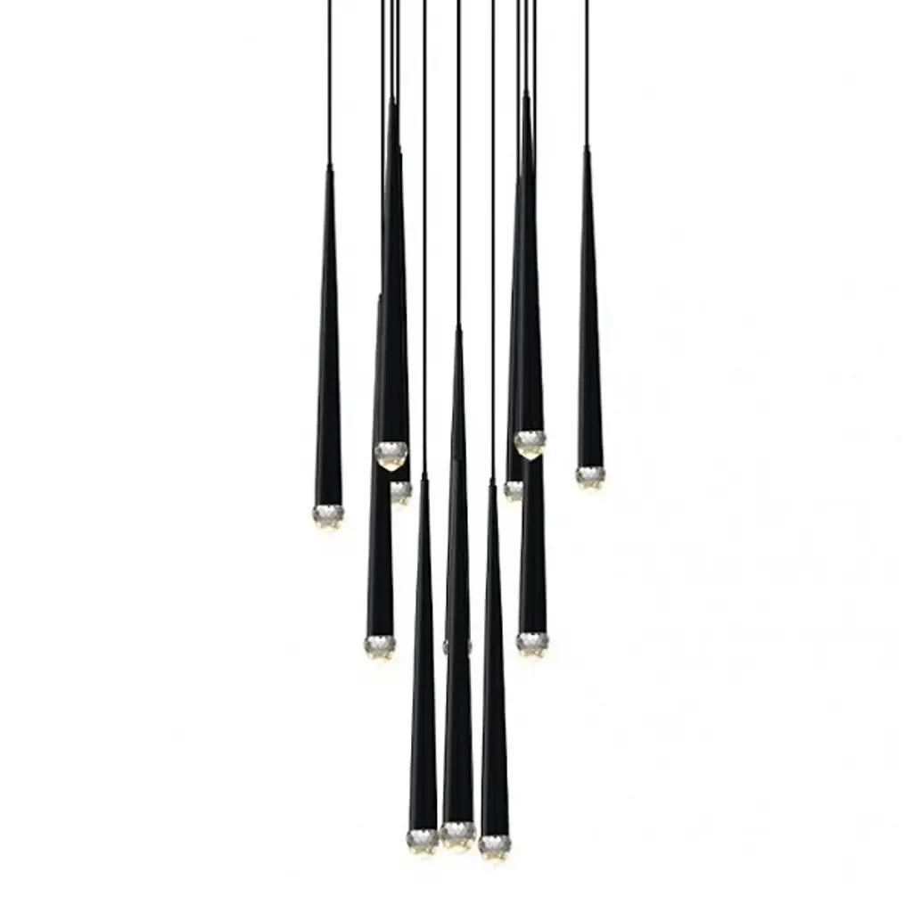 The Salve LED Multi-Light Pendant Light by Huxe is a striking fixture with captivating detail. Tapered stainless steel fixtures drop from a disc canopy, cascading downward at varying heights like the tail of a comet. A detailed, clear glass shade at each piece’s end glistens with light from an integrated LED light module, creating a warm glow while sparkling through the crystalline glass. Sharp, yet charming, this fixture instantly elevates modern décor.