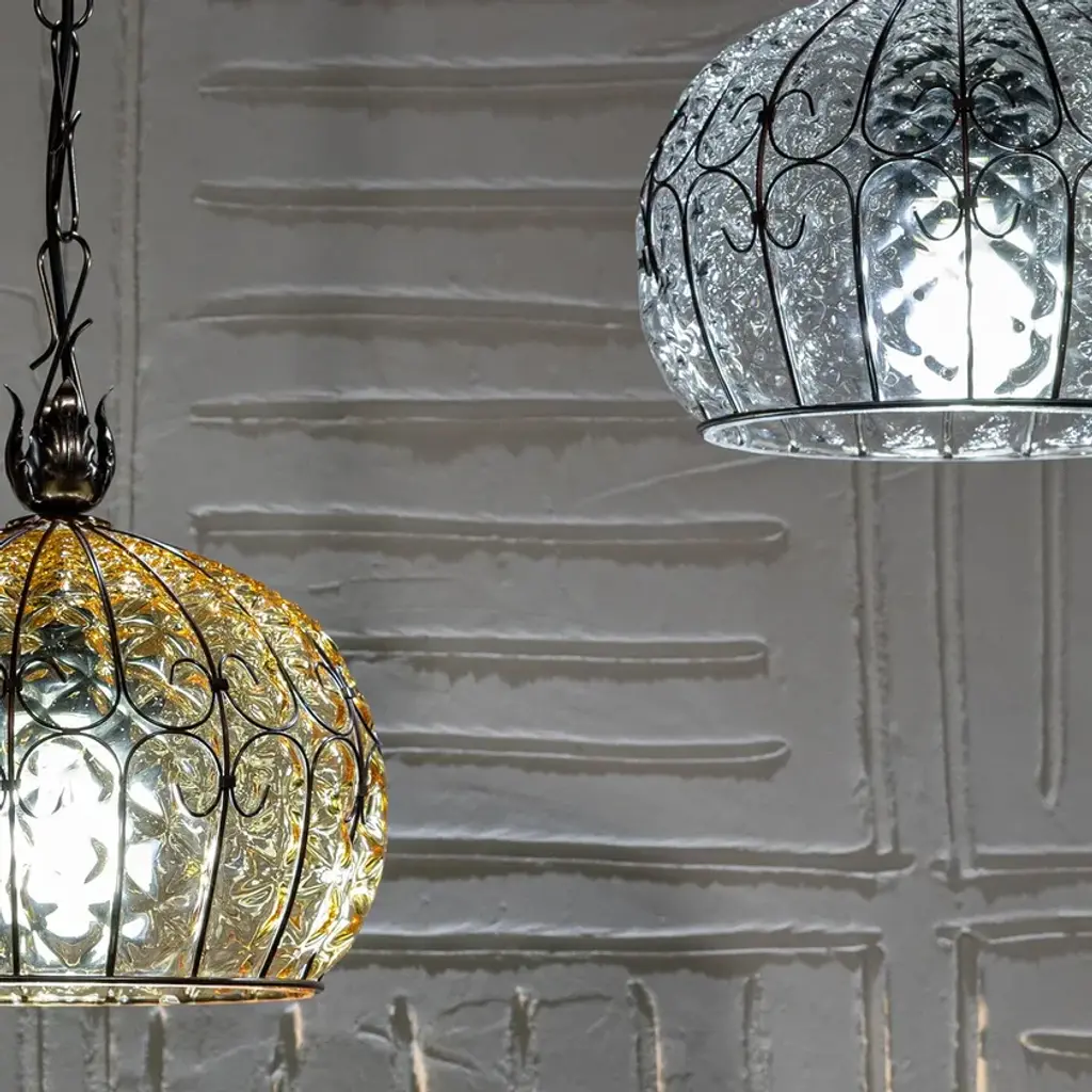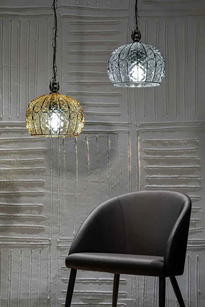 A rounded shape with a composition of neatly welded curls shaped with a diameter-2 wire for a less intrusive result. The blown glass is moulded according to their form.