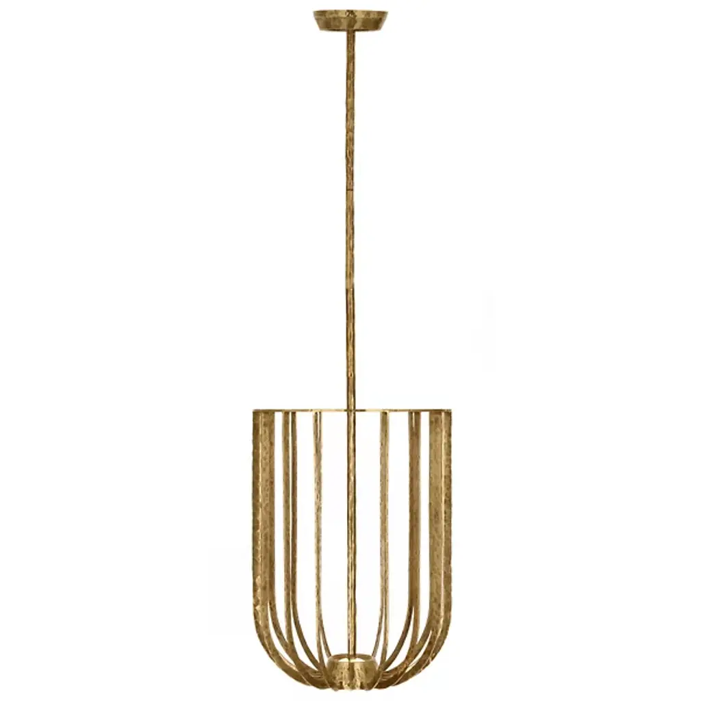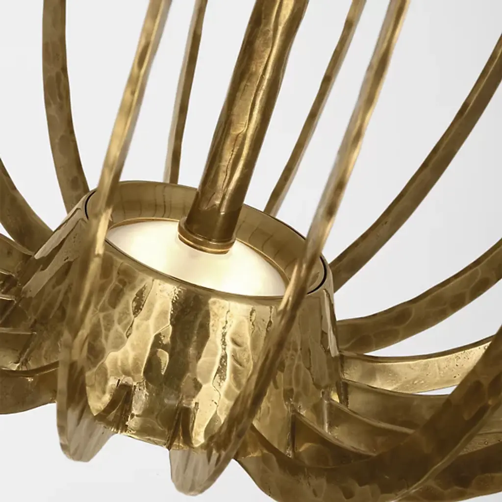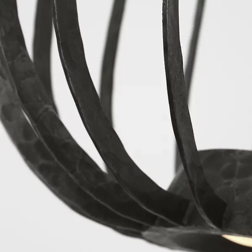 The Sanchi LED Pendant from Visual Comfort Modern is a memorable embodiment of rustic elegance. Designed by Sean Lavin, its bowl-shaped design features an open, metal framework anchored by a sleek, beveled canopy and support stem. Each element is hand-hammered by skilled artisans, adding texture, depth, and character to the piece while also shimmering in the light of a central integrated LED light source.