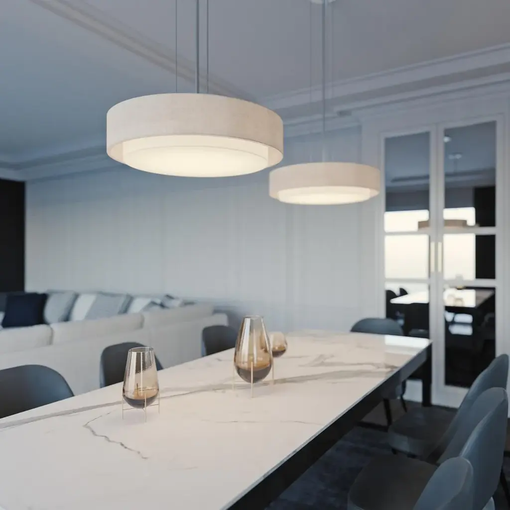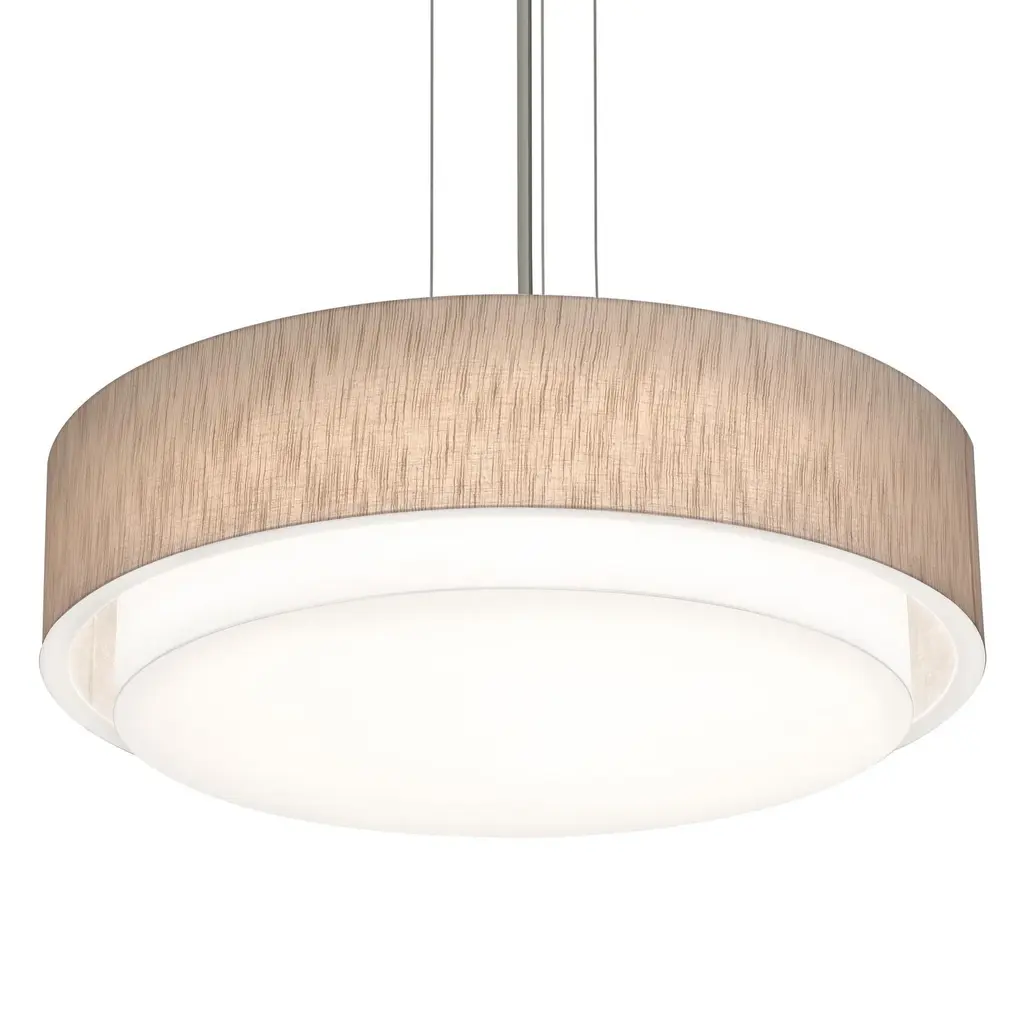 The Sanibel LED Pendant Light from AFX presents a striking modern double-layer drum design, featuring a Lumafuse™ laminated fabric and acrylic shade available in two elegant colors. Its white bottom acrylic diffuser softly disperses light for a balanced glow. Equipped with adjustable stems and a swivel canopy, it easily adapts to ceilings with up to a 60-degree slope, making it a sophisticated choice for contemporary interiors. Highlights