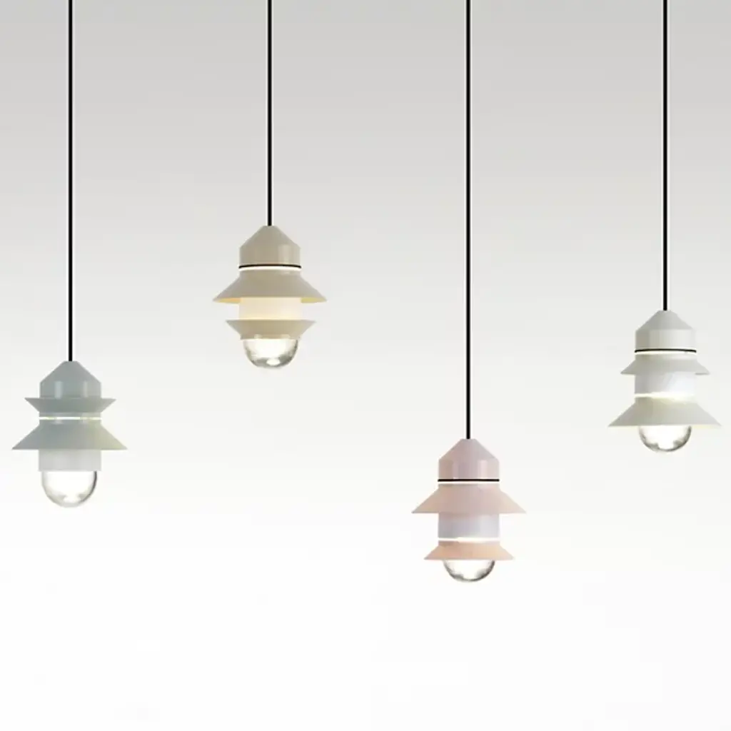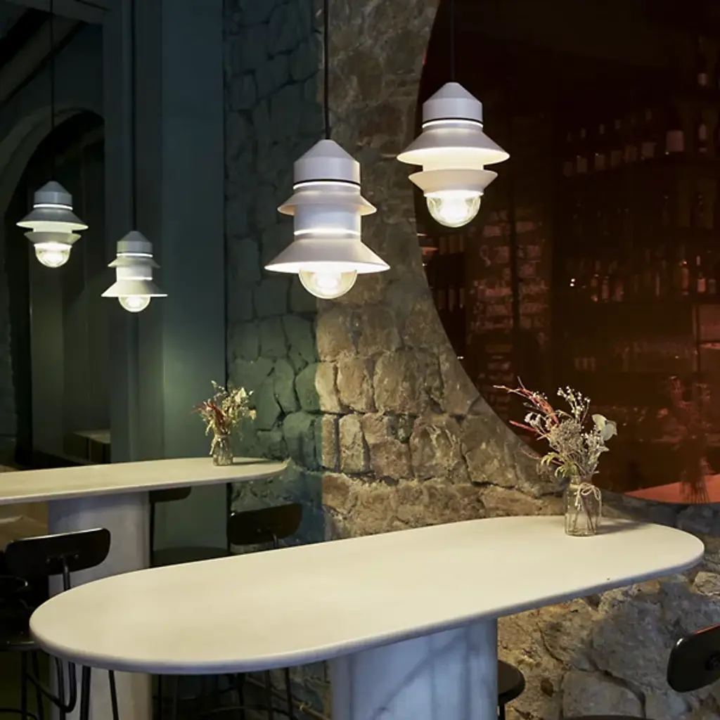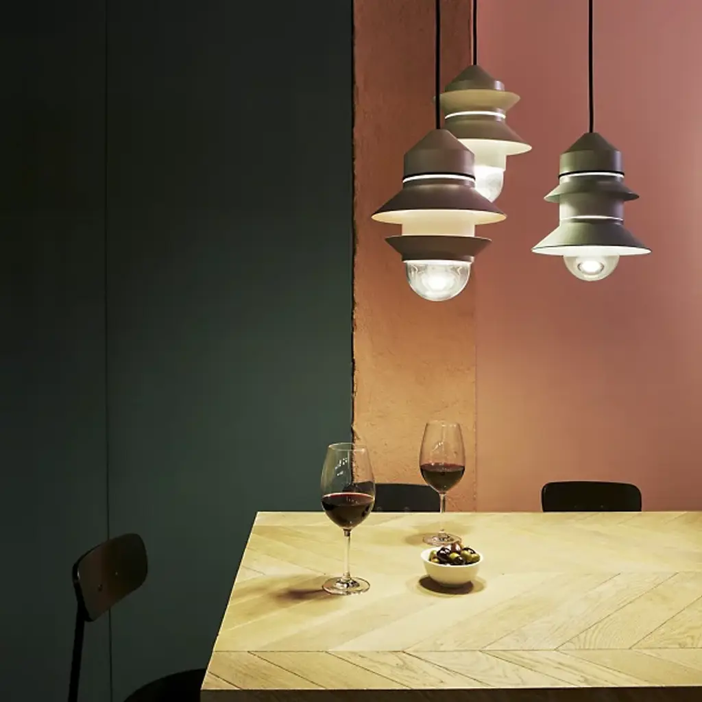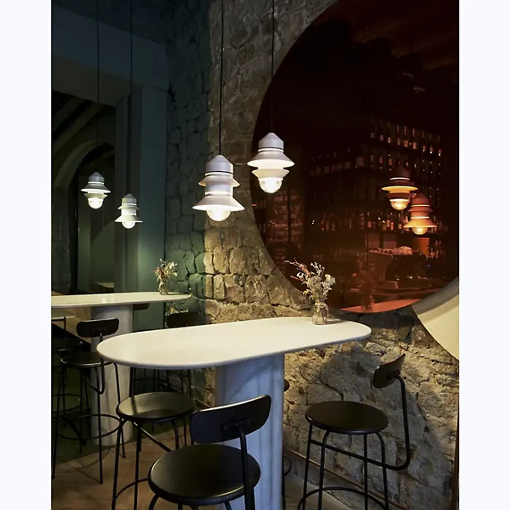 A modern take on the traditional fishing boat lanterns. The Santorini Indoor Pendant by Marset features a half-oval diffuser made of blown glass juxtaposed with two movable shades that can be repositioned to alter the lighting's exposure. Suspended from a cord, this fixture utilizes an energy-efficient LED light source to deliver a combination of direct and reflected light. It can be arranged in rows or hung as a solo fixture over dining tables, kitchen islands, or seating areas.