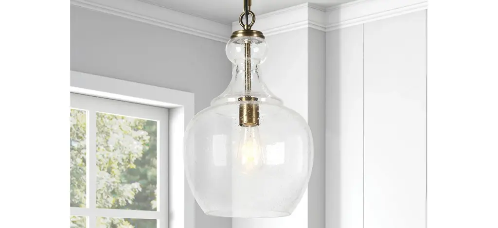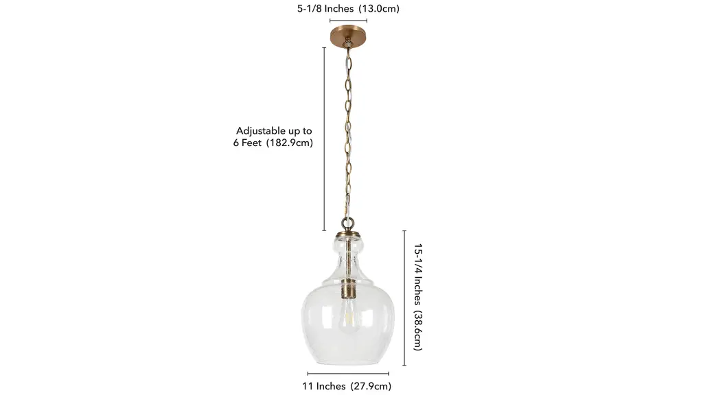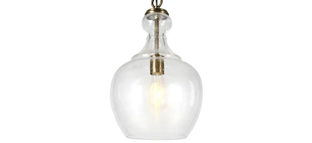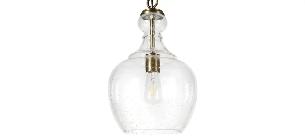 With a style inspired by the industrial revolution but appropriate for a coastal beach house, this pendant brings true mood lighting to your space. The seeded glass provides an antiqued look that complements the brass hardware and dome shape shade adds refinement to the space. The base is seeded glass with brass tones. It is paired with a glass dome shade.
