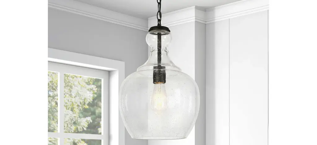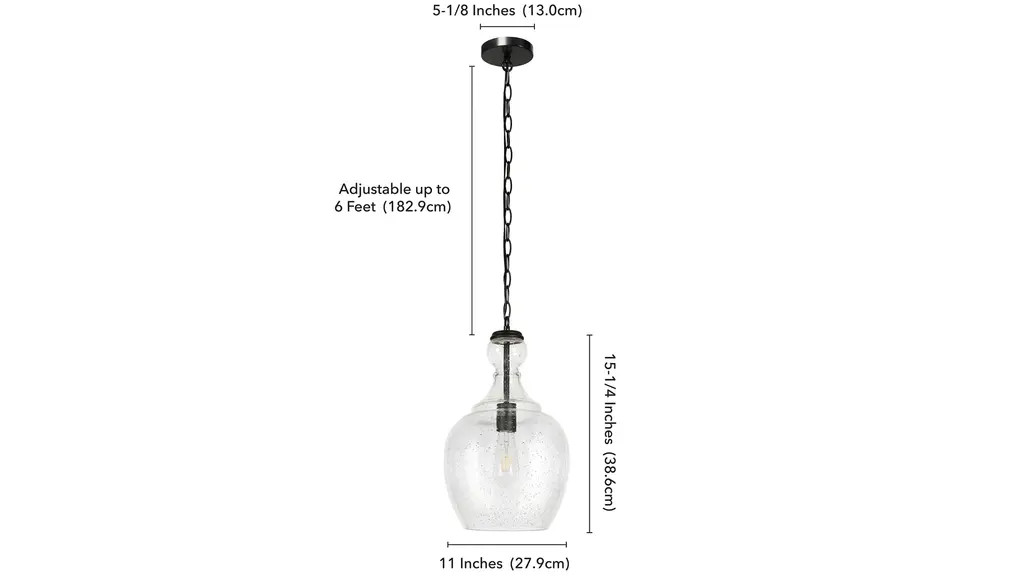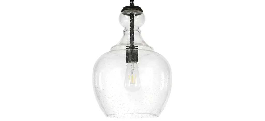 With a style inspired by the industrial revolution but appropriate for a coastal beach house, this pendant brings true mood lighting to your space. The seeded glass provides an antiqued look that complements the blackened bronze hardware and dome shape shade adds refinement to the space. The base is seeded glass with bronze tones. It is paired with a glass dome shade.