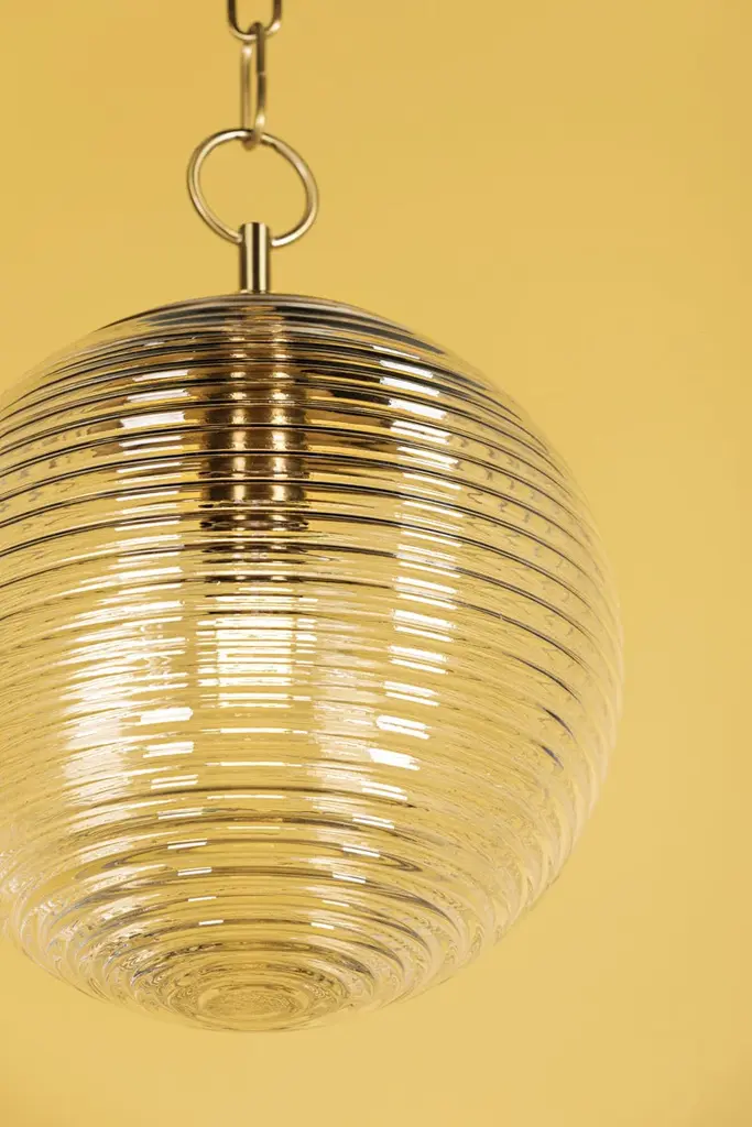 Influenced by vintage Holophane style glass fixtures, Sara gives the classic look a modern update. The clear ribbed glass globes were designed for maximum light and refraction. Available as a flush mount, wall sconce or pendant light, style Sara in multiples down hallways and over kitchen islands or alone above coffee or dining tables to fill a space with bright light and sleek sophistication. The lamp's ribbed ceramic base is similarly influenced and adds texture and a pop of color to any tabletop. Part of our Home Ec. x Mitzi Tastemakers collection.