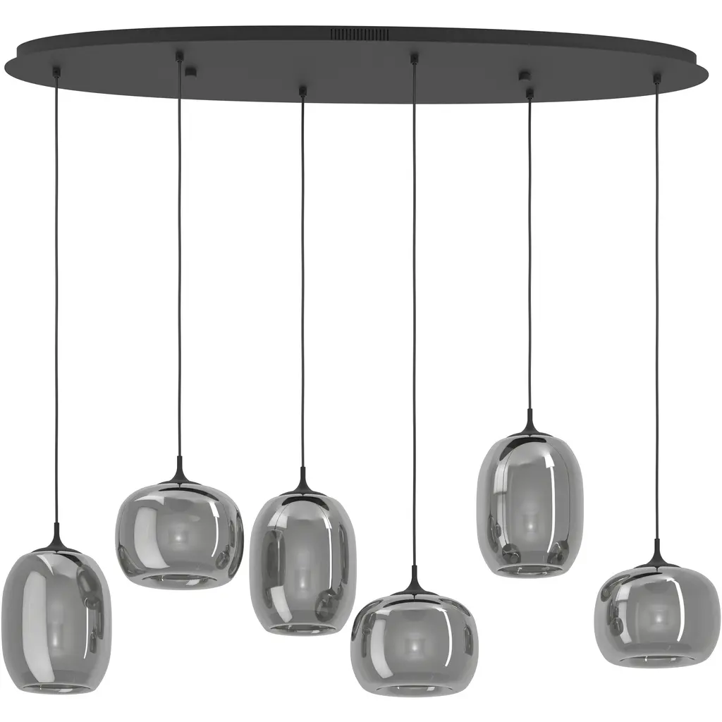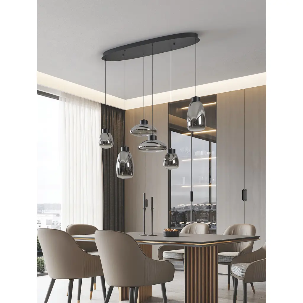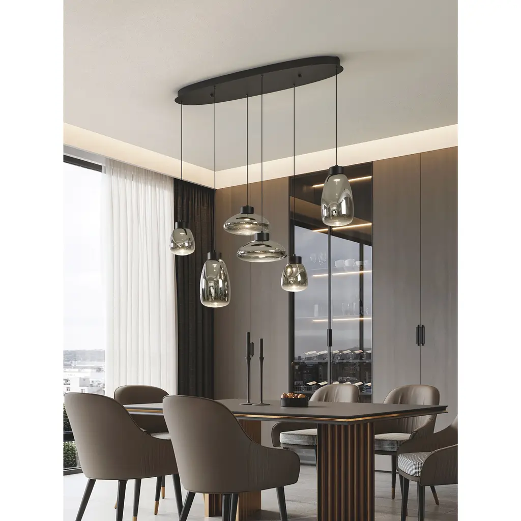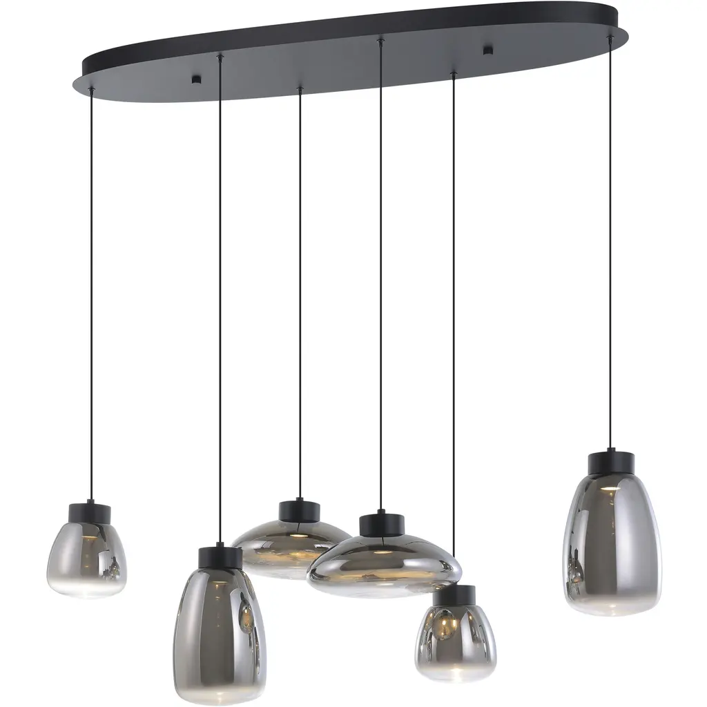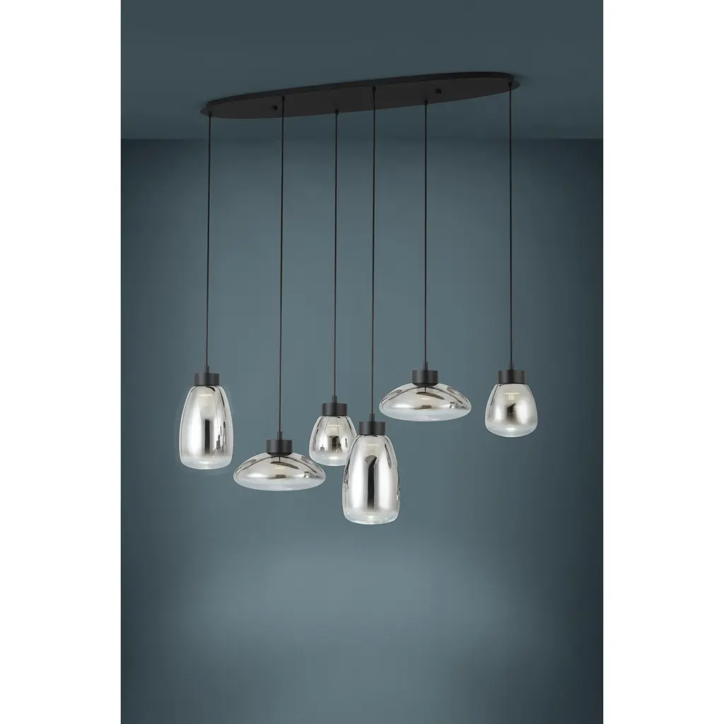 The Sarnarra 6-light pendant light exudes modern elegance with a striking row of uniquely shaped shades, crafted from sleek chrome-smoked glass. Suspended at varying heights from a linear black metal canopy, each shade creates a mirrored effect that conjures up beautiful reflections. Equipped with integrated LED light sources, this pendant allows you to effortlessly adjust the color temperaturefrom warm white to daylightensuring the perfect lighting above a dining table or over a kitchen island.