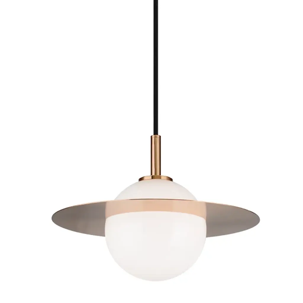 Simple, beautiful, otherworldly. Achieve a state of bliss under the soft, enveloping glow of the Saturn Pendant from Matteo Lighting. The pendant’s fine suspension lets you arrange a few over a table or drop one in a tight, intimate space. The first element catching the eyes is a sleek metal disc whose silhouette evokes that of the planet Saturn. The disc provides a fresh visual for every day of the week as it adjusts up to 60 degrees. An opal glass globe creates a calming experience, concealing the brilliant bulbs inside. When turned on, the piece generates an ambient and down glow that accentuates the slicing metal disc.