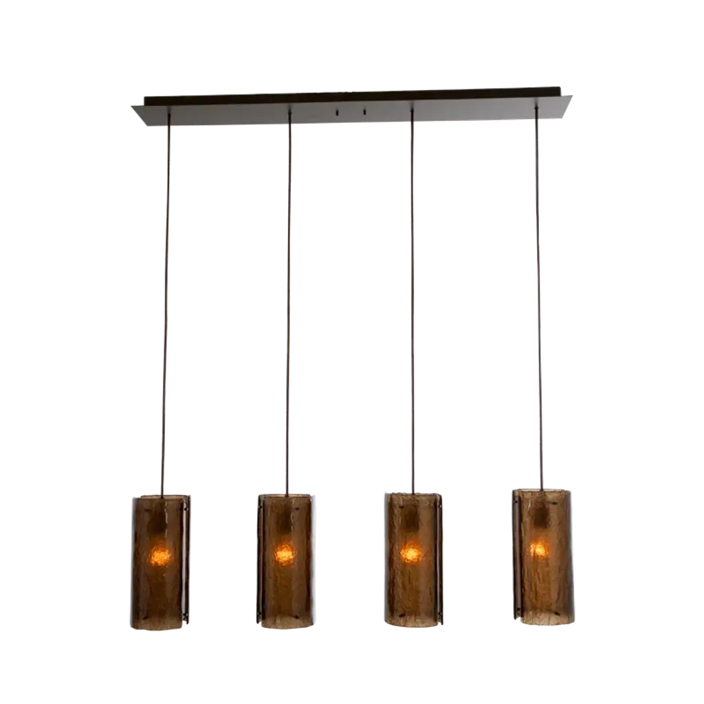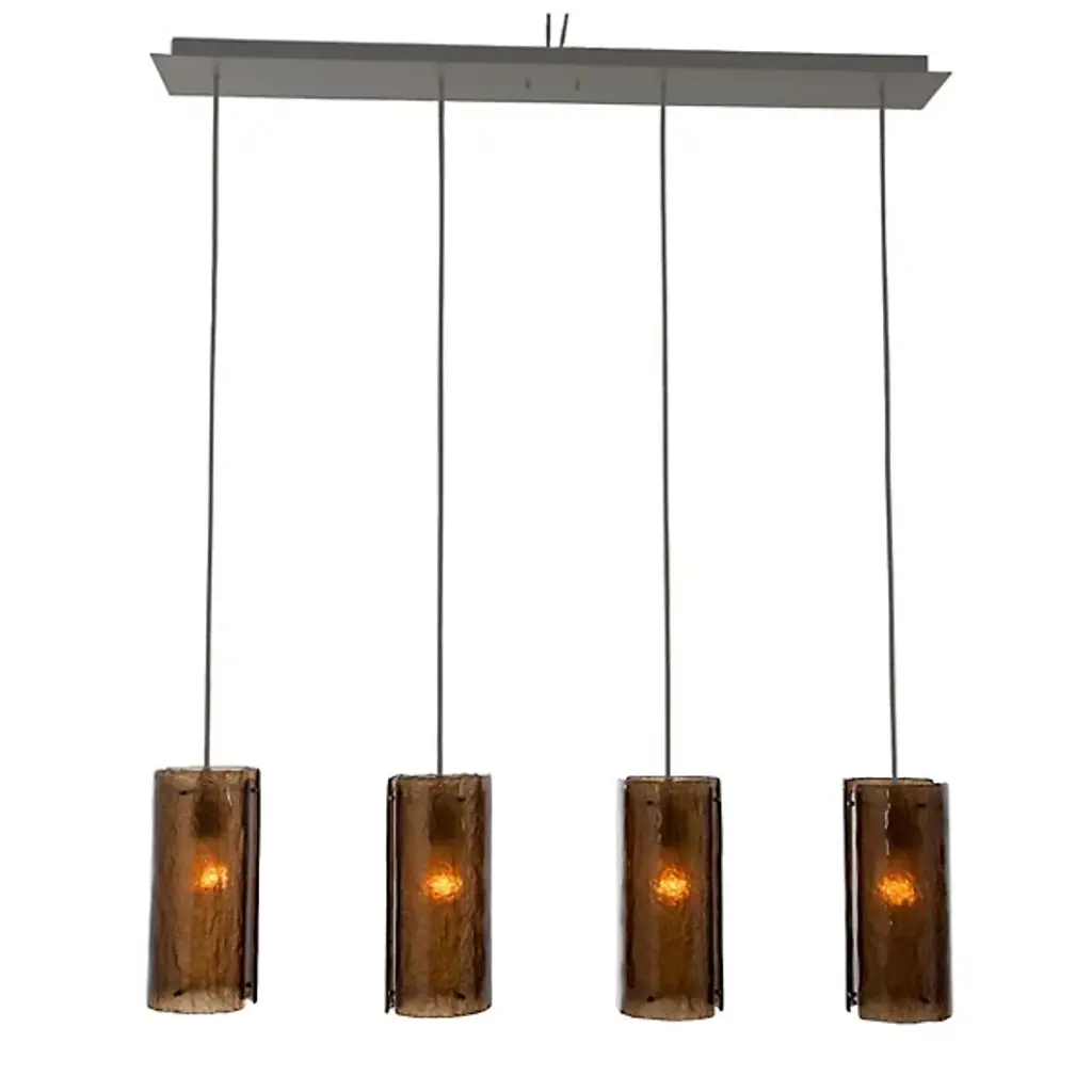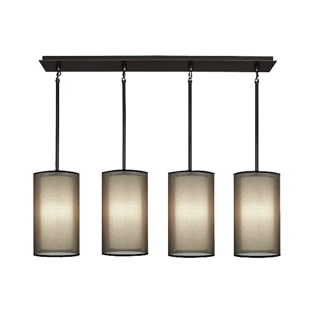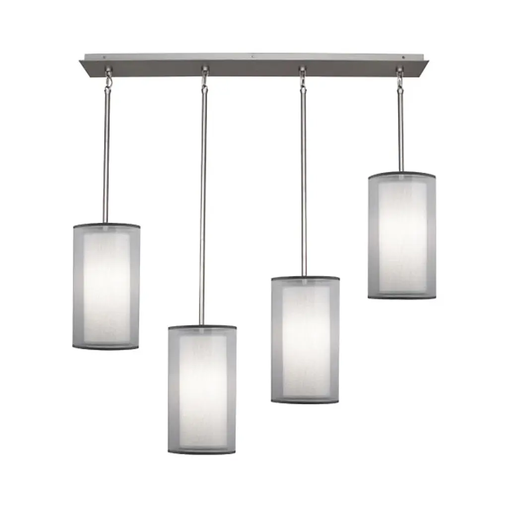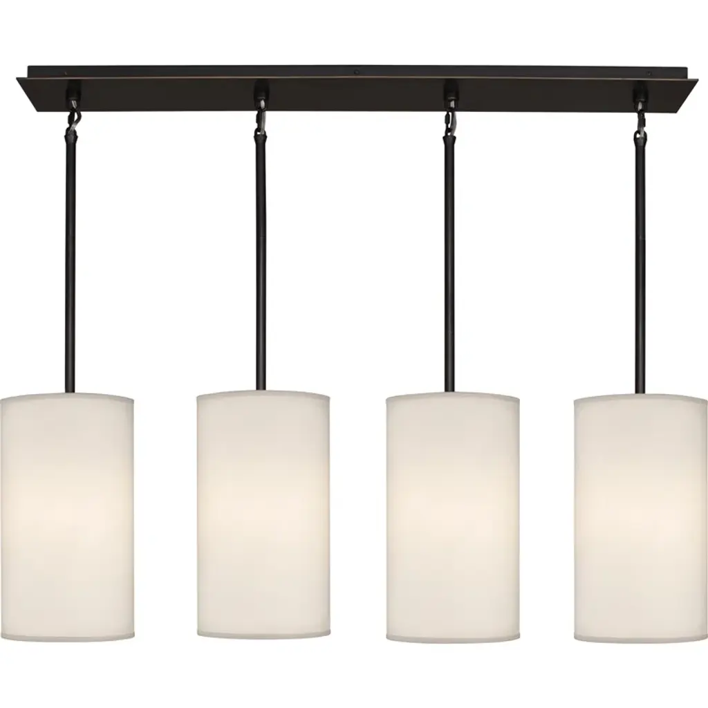 The Robert Abbey Saturnia Linear Suspension brings warm light and metallic shimmer into modern spaces. It features four cylindrical shades of transparent metallic fabric over light-diffusing cylinders of Ascot White fabric. A variety of included stems allows you to hang the shades all at the same length or stagger them as desired.