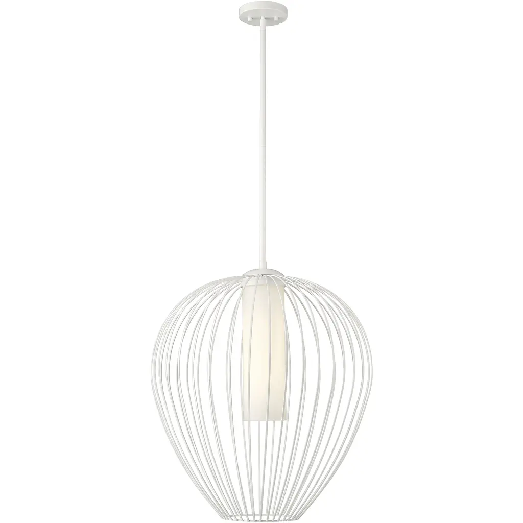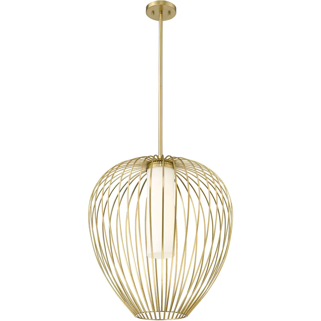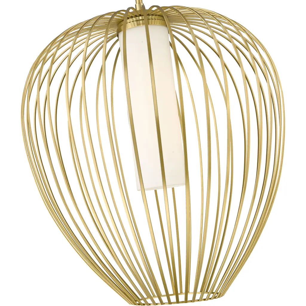 An inner shade of white opal glass create inviting illumination for a modern one-light pendant with big personality. Its outer cage frame features slender spokes that curve and taper to create a rounded silhouette, adding bold style over an island, or living room. The fixture features a rich modern gold finish to set a refined, sophisticated ambiance.