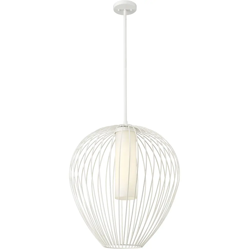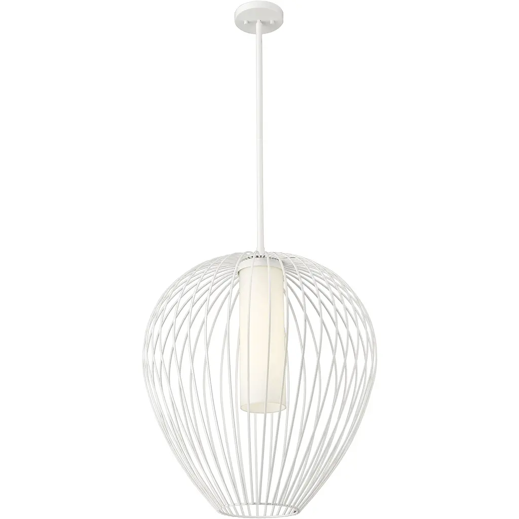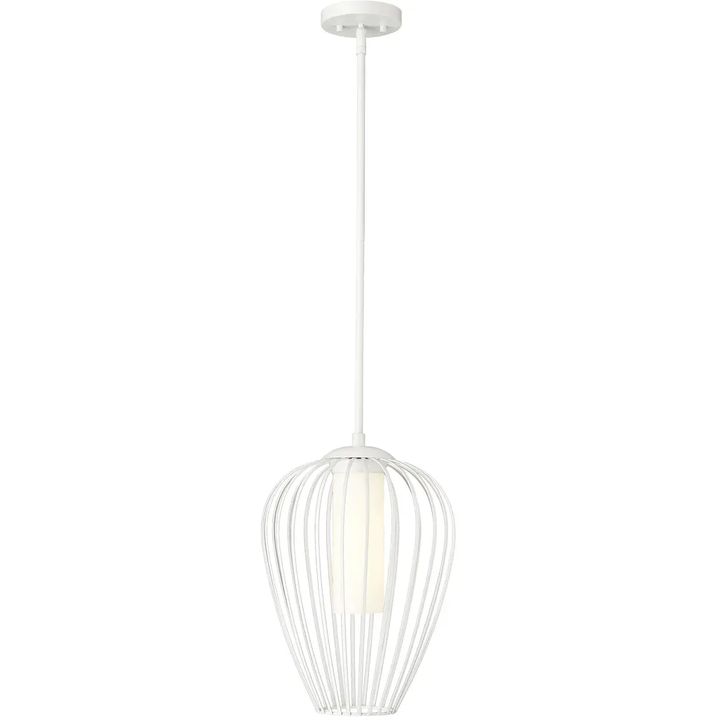 An inner shade of white opal glass create inviting illumination for a modern one-light pendant with big personality. Its outer cage frame features slender spokes that curve and taper to create a rounded silhouette, adding bold style over an island, or living room. The fixture features a cool textured white finish to set a refined but casual ambiance.