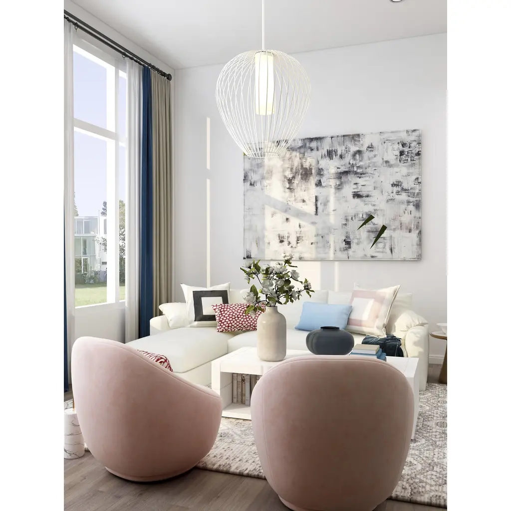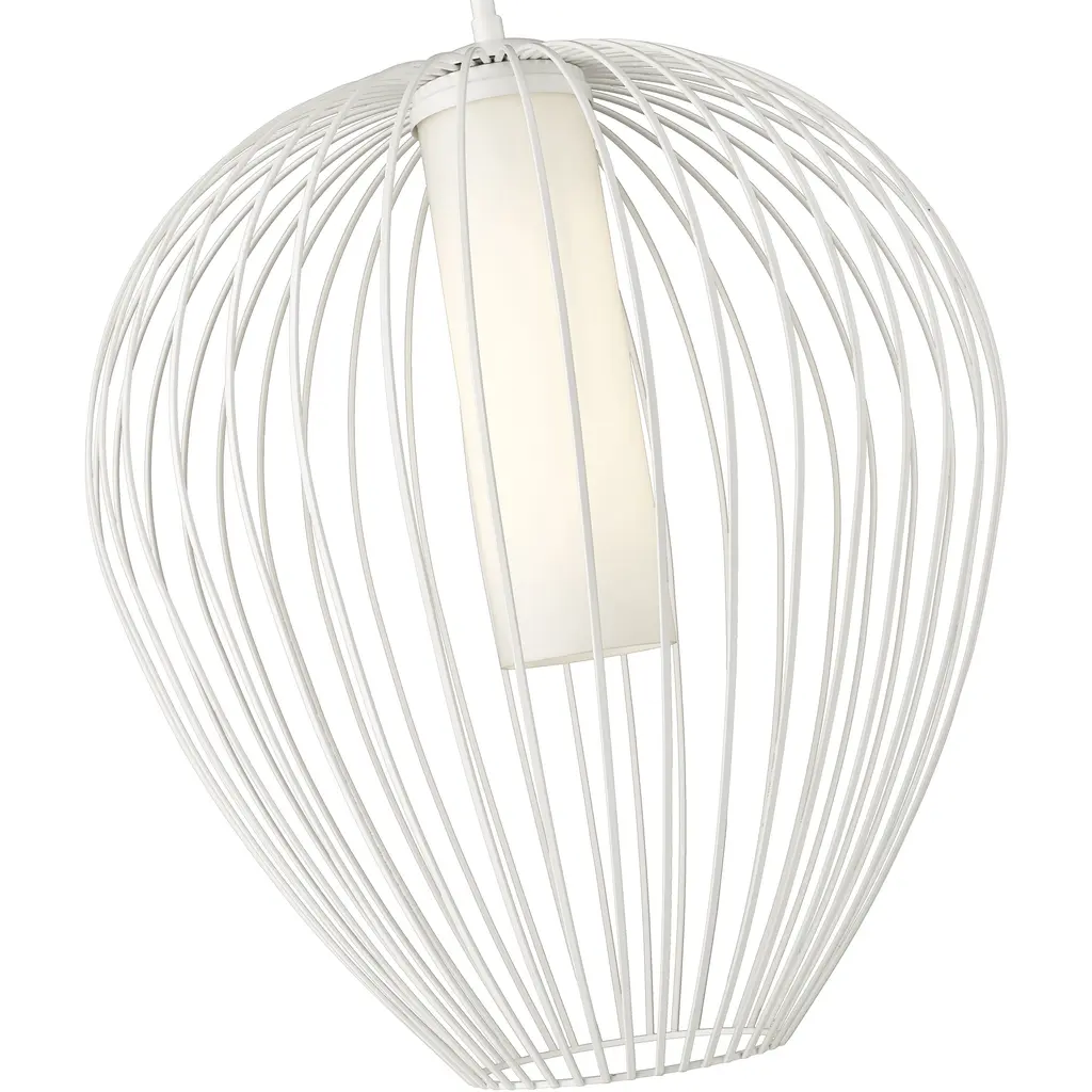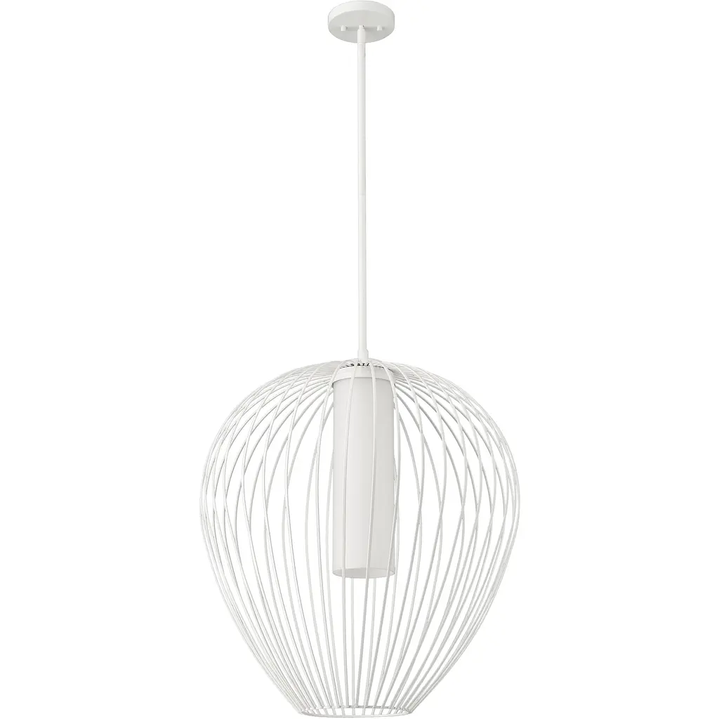 An inner shade of white opal glass create inviting illumination for a modern one-light pendant with big personality. Its outer cage frame features slender spokes that curve and taper to create a rounded silhouette, adding bold style over an island, or living room. The fixture features a cool textured white finish to set a refined but casual ambiance.