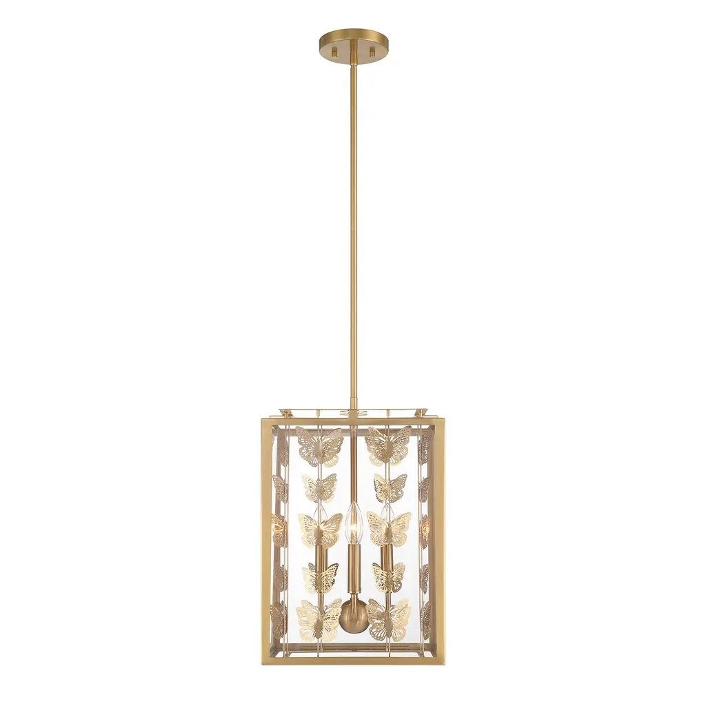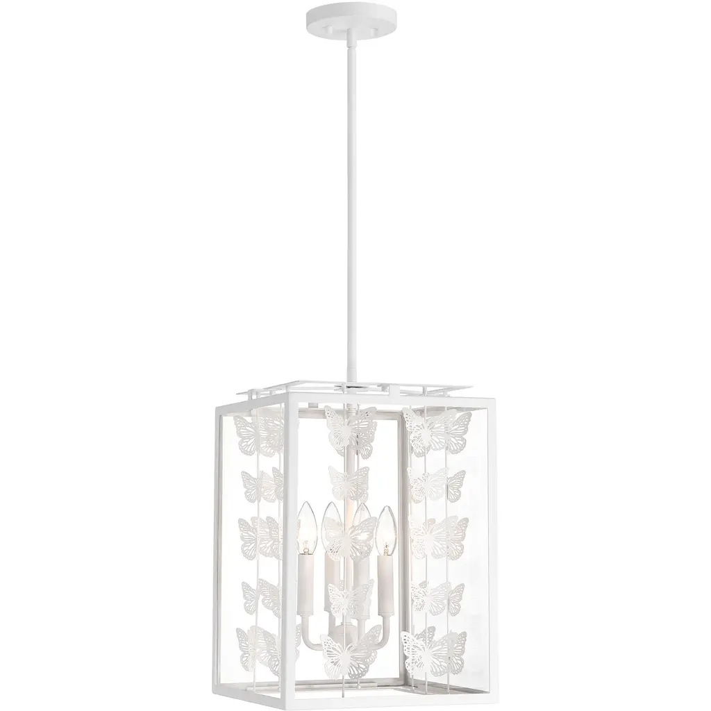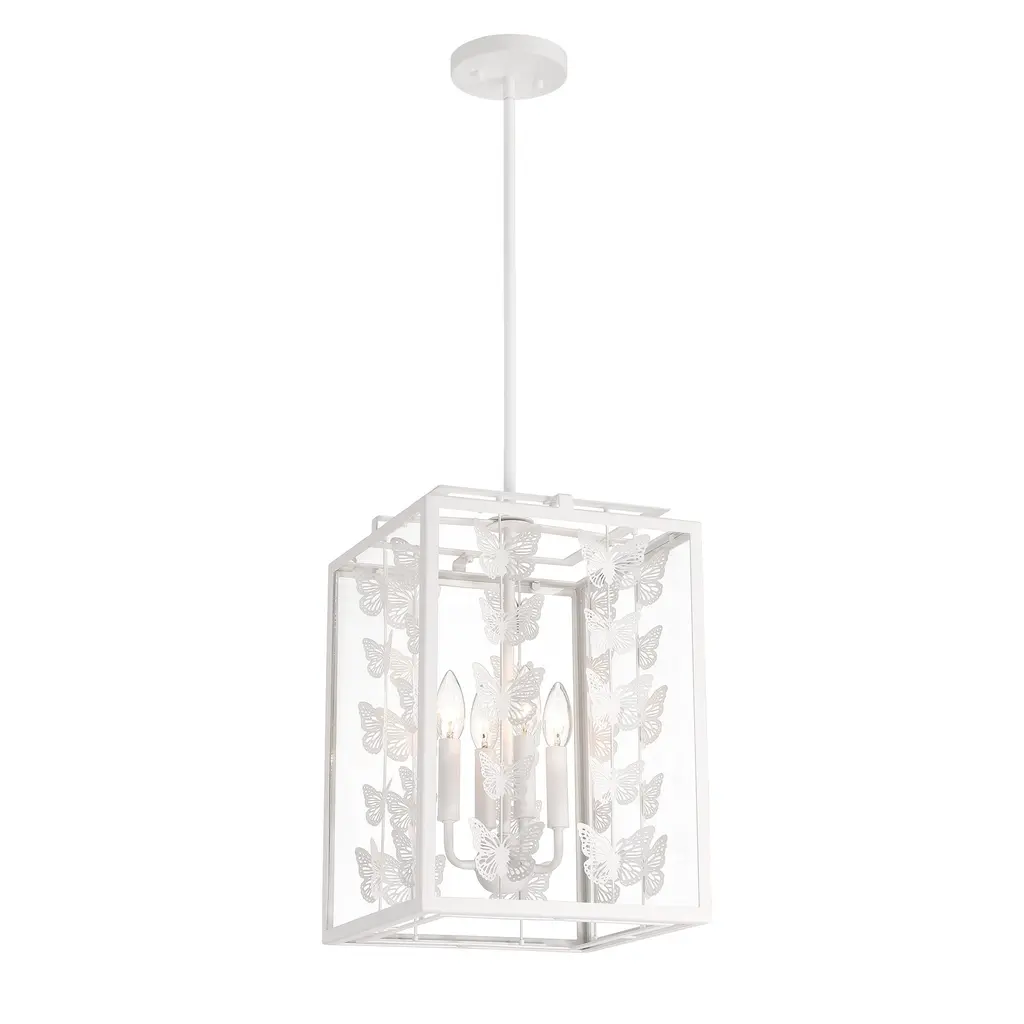 Add a little magic to any room with the whimsical Savoy House Birch 4-light pendant, which features a geometric structure adorned with rows of lovely metal butterflies. Clear glass panes frame everything beautifully. Birch is 12" in width and has an adjustable height ranging from 17" to 71". Comes with four 12" downrods and one 6" downrod. Uses four candelabra size bulbs of up to 60 watts per bulb. Bulbs are not included.Features:Dimensions:Electrical Specifications: