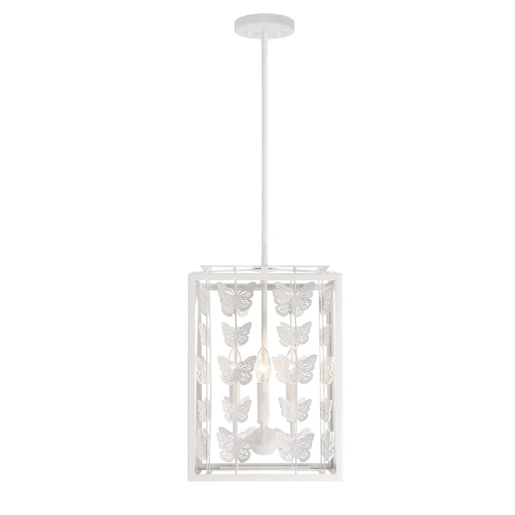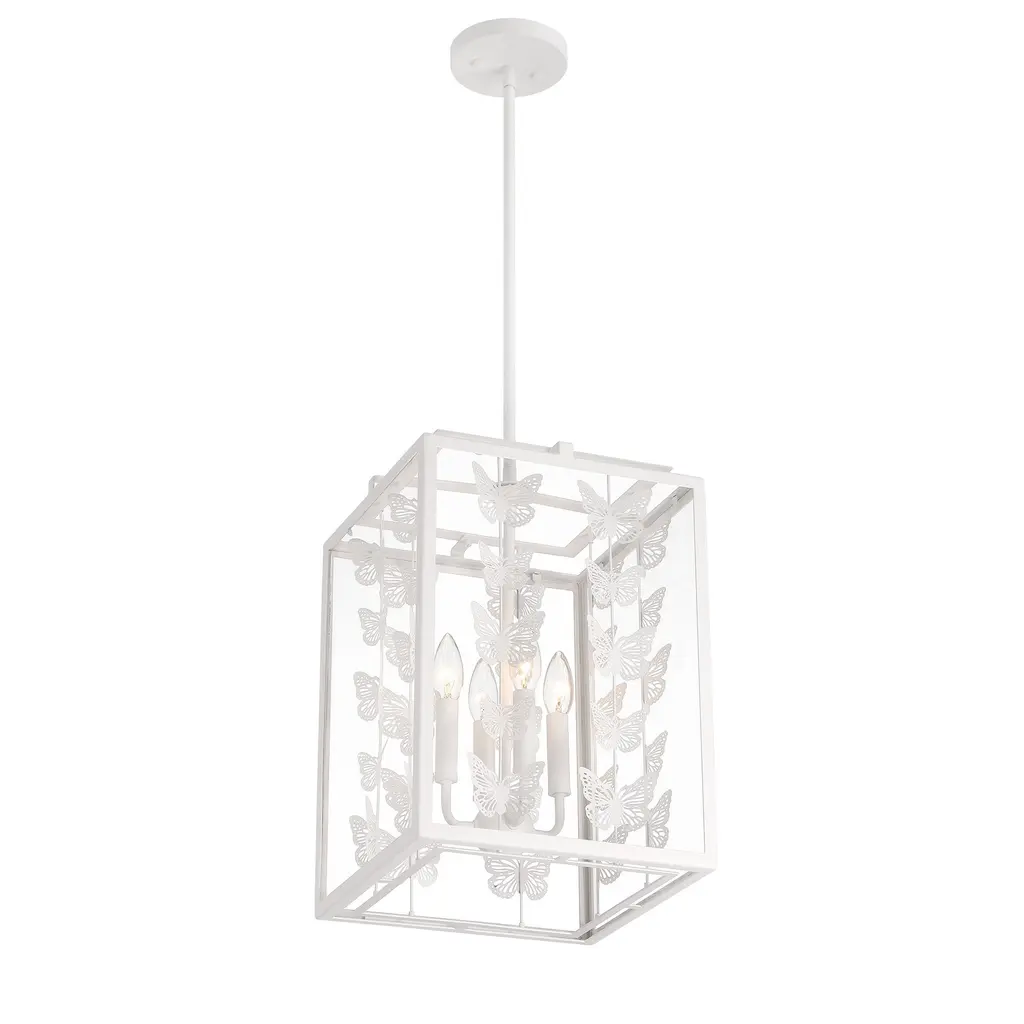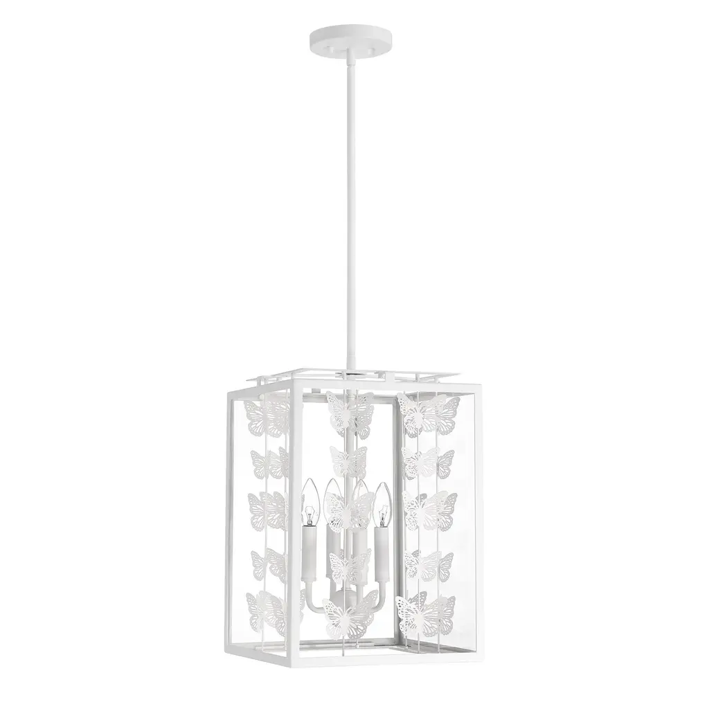 Add a little magic to any room with the whimsical Savoy House Birch 4-light pendant, which features a geometric structure adorned with rows of lovely metal butterflies. Clear glass panes frame everything beautifully. Birch is 12" in width and has an adjustable height ranging from 17" to 71". Comes with four 12" downrods and one 6" downrod. Uses four candelabra size bulbs of up to 60 watts per bulb. Bulbs are not included.Features:Dimensions:Electrical Specifications:
