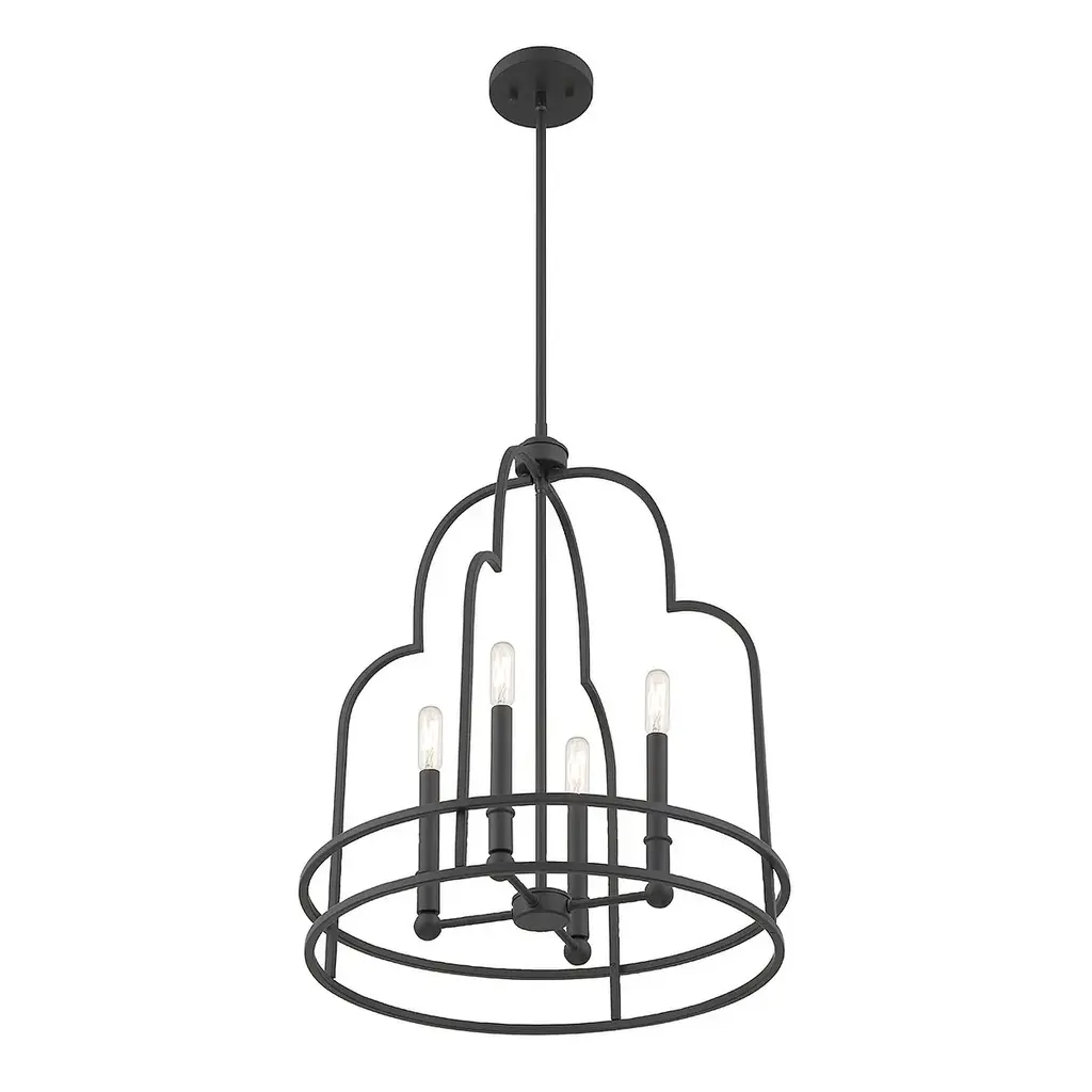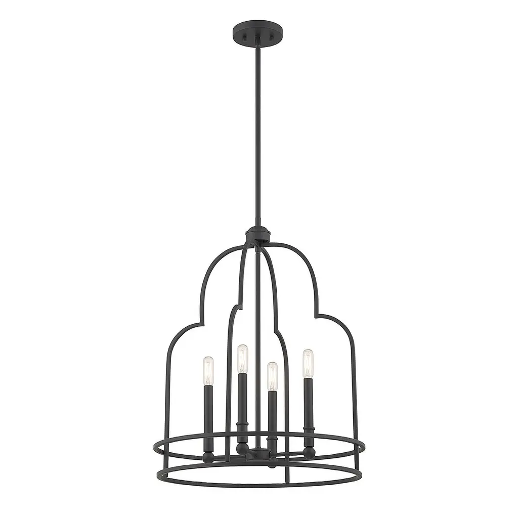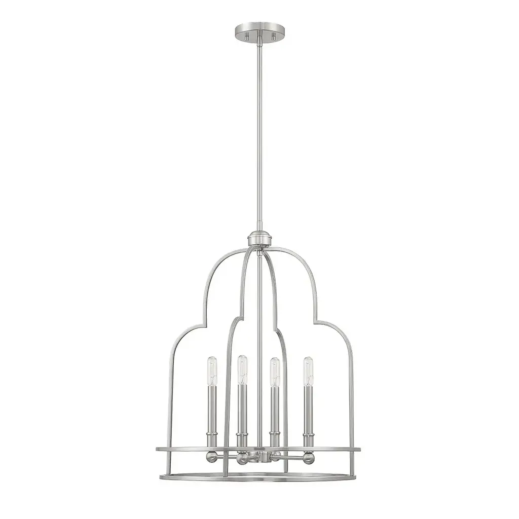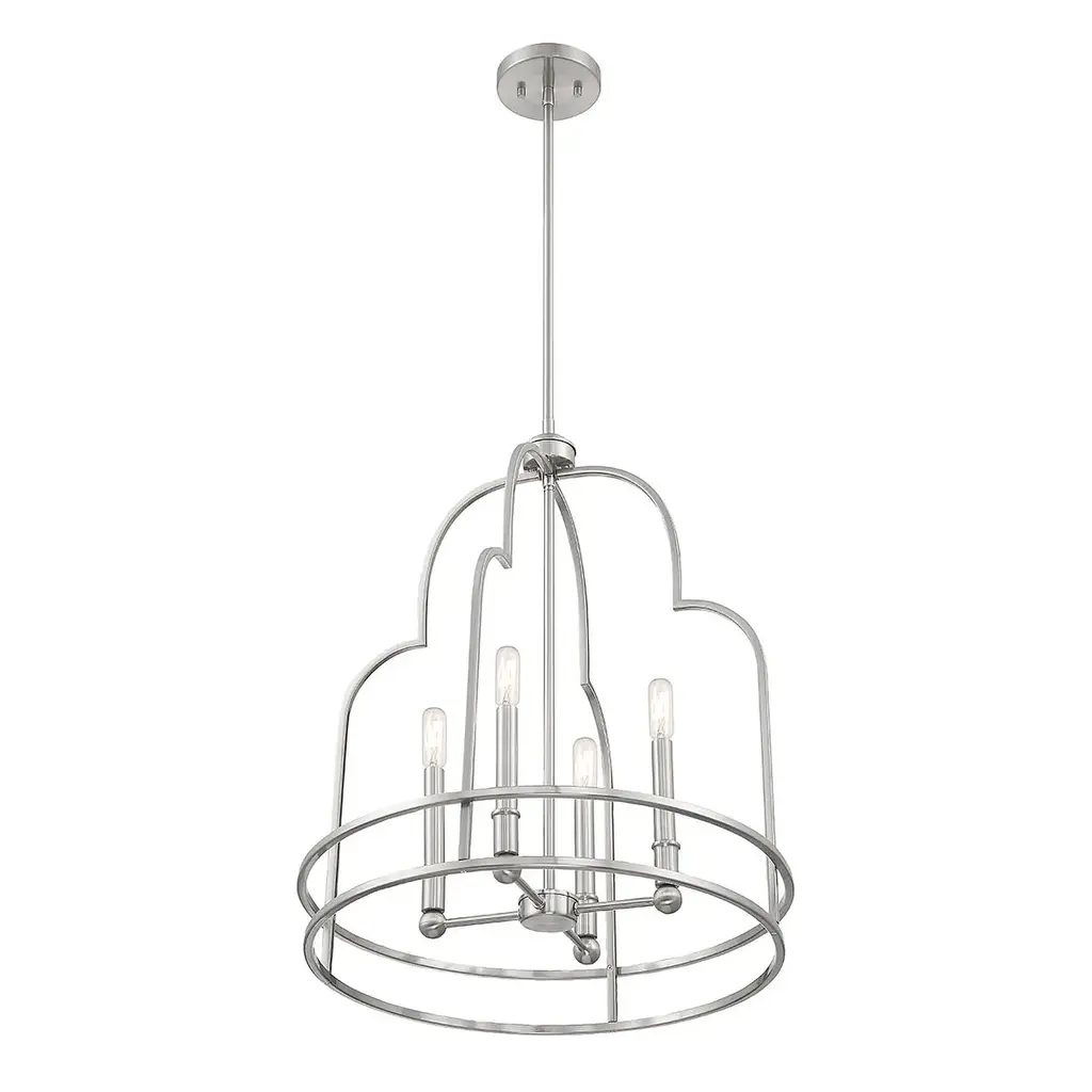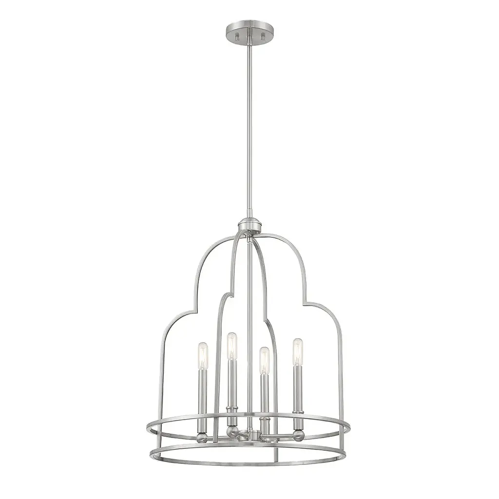 The eye-catching curves on the Savoy House Diplomat 4-light pendant make it an intriguing lighting choice for any space, especially for creating great first impressions in foyers and entryways! Diplomat is 20" in width and has an adjustable height ranging from 25" to 79". Comes with four 12" downrods and one 6" downrod. It uses 4 candelabra size bulbs of up to 60 watts per bulb (bulbs not included).Features:Dimensions:Electrical Specifications: