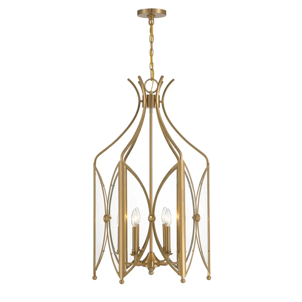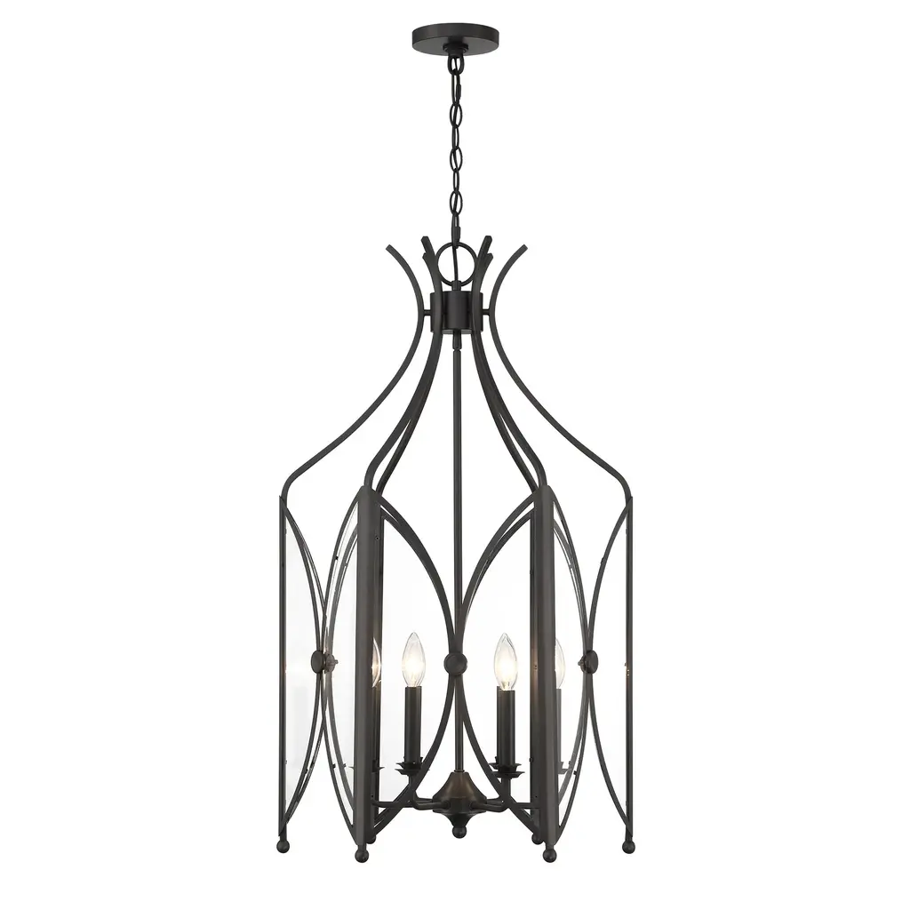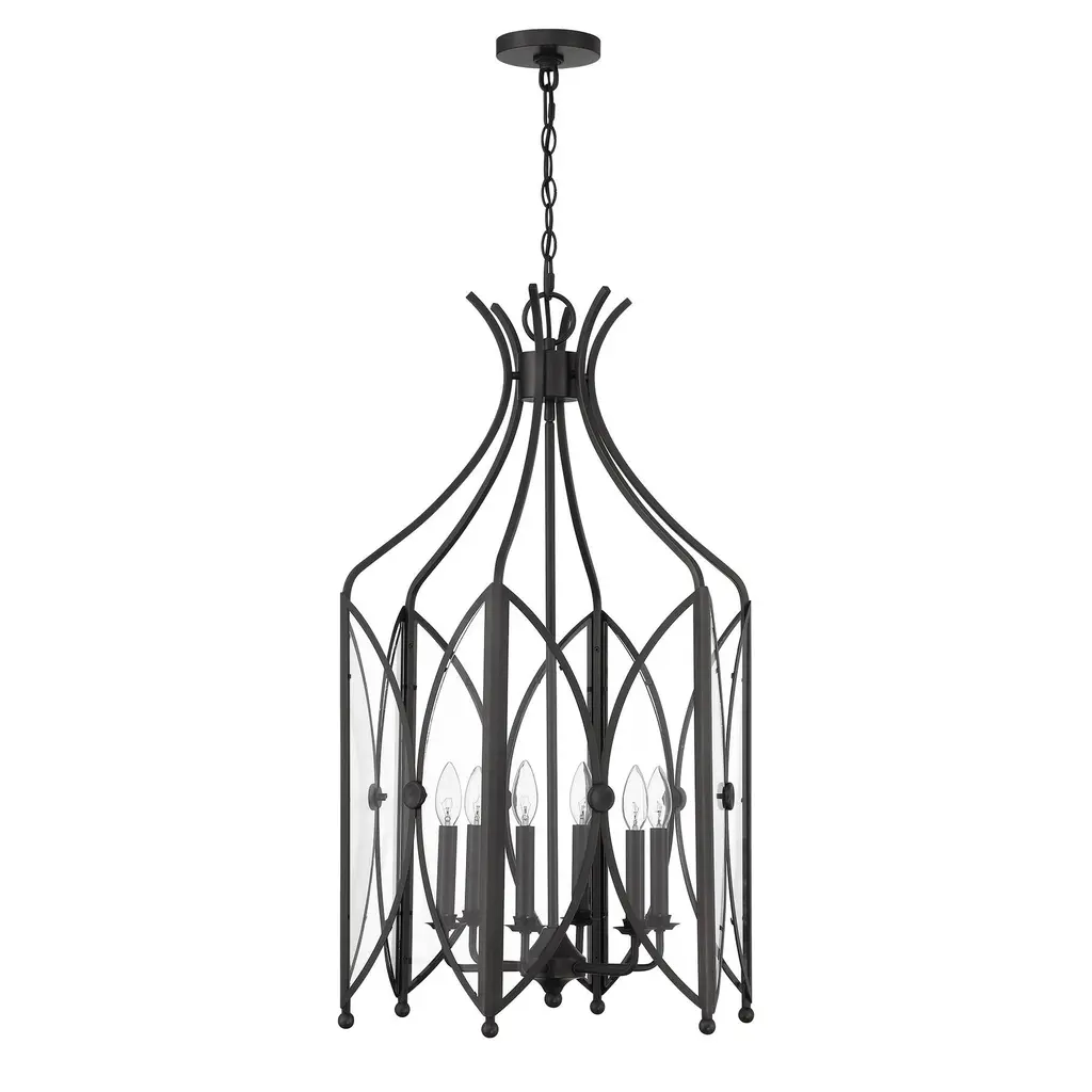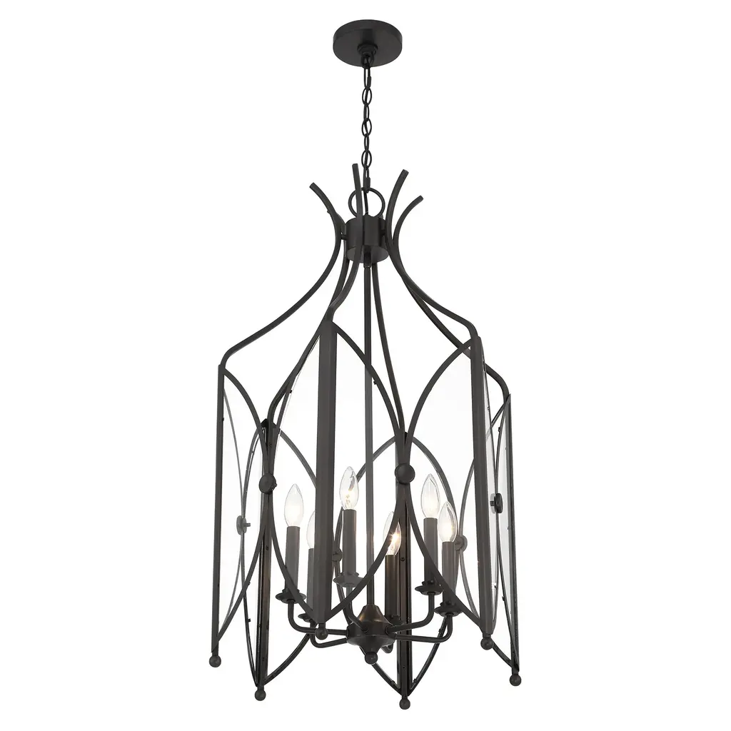 Elegant and dramatic, the Savoy House Enclave 6-light lantern offers a strikingly beautiful lighting look. It is decorated with panes of clear glass in curving frames that recall the look of leaves and seem to multiply the lights within. Enclave is 35" in height and 21" in width. It uses six candelabra size bulbs of up to 60 watts per bulb. Bulbs not included.Features:Dimensions:Electrical Specifications: