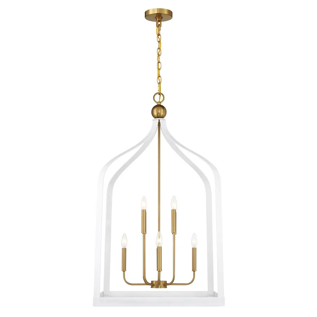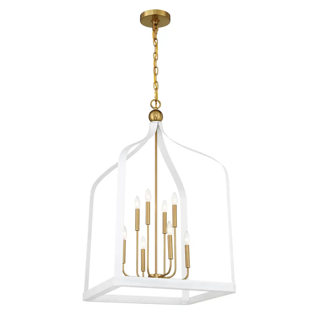 The Savoy House Sheffield 8-light pendant offers up a beautiful, elegant and classic look with a lantern-like style, airy openness and a White finish with Warm Brass accents. It is 41.5" in height and 23.5" in width. It uses eight candelabra size bulbs of up to 60 watts per bulb. Bulbs not included.Features:Dimensions:Electrical Specifications: