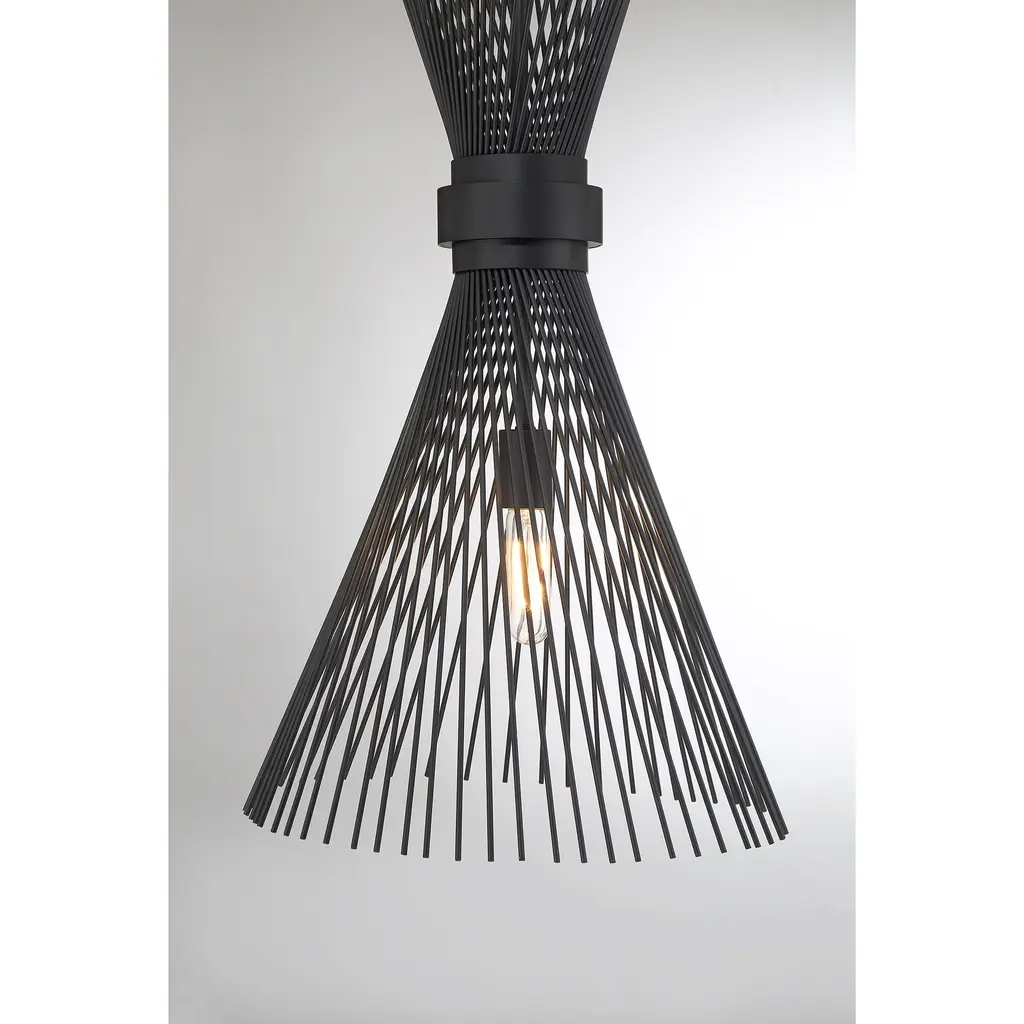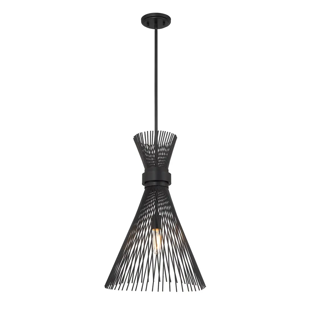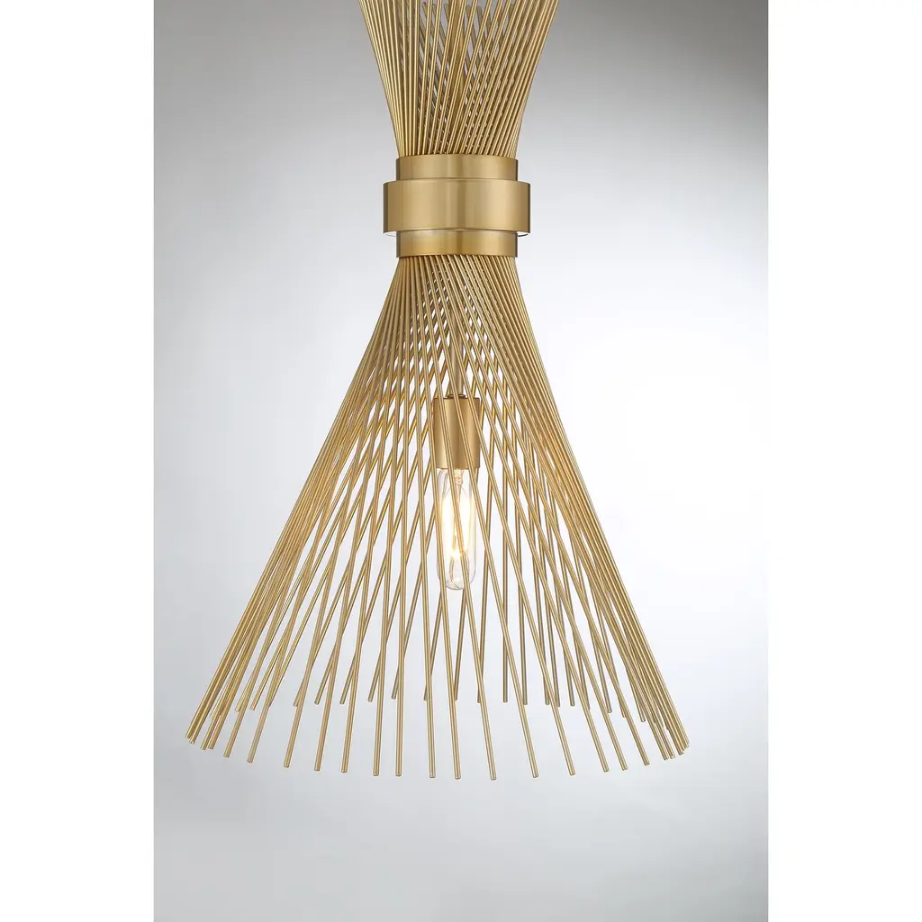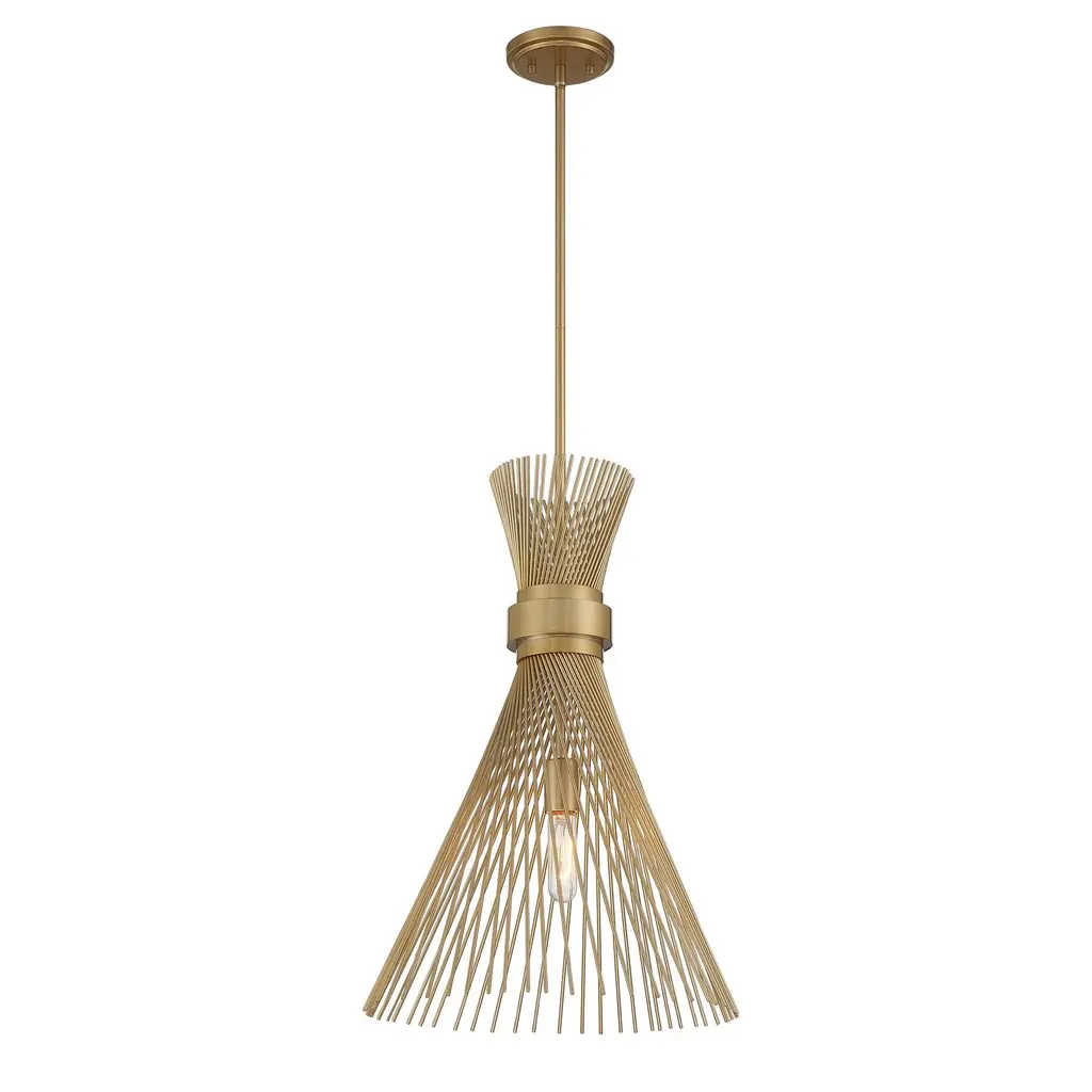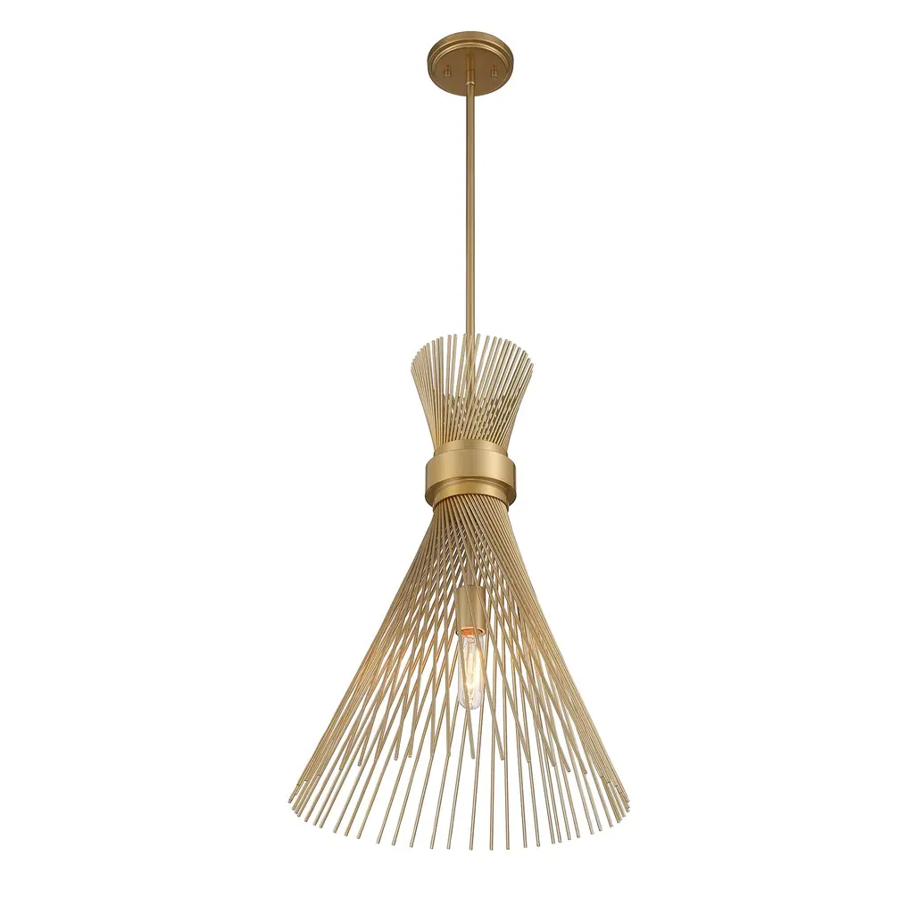 The Savoy House Longfellow 1-light pendant showcases a fashionable style with metal rods that are gathered together at the center and unfurl outward. When the light is on, it creates a dramatic glow that is sure to catch the eye. Burnished Brass finish. Longfellow is 16" in width and has an adjustable height ranging from 24" to 78". Comes with four 12" downrods and one 6" downrod. Uses one standard size bulb of up to 60 watts. The bulb is not included.Features:Dimensions:Electrical Specifications: