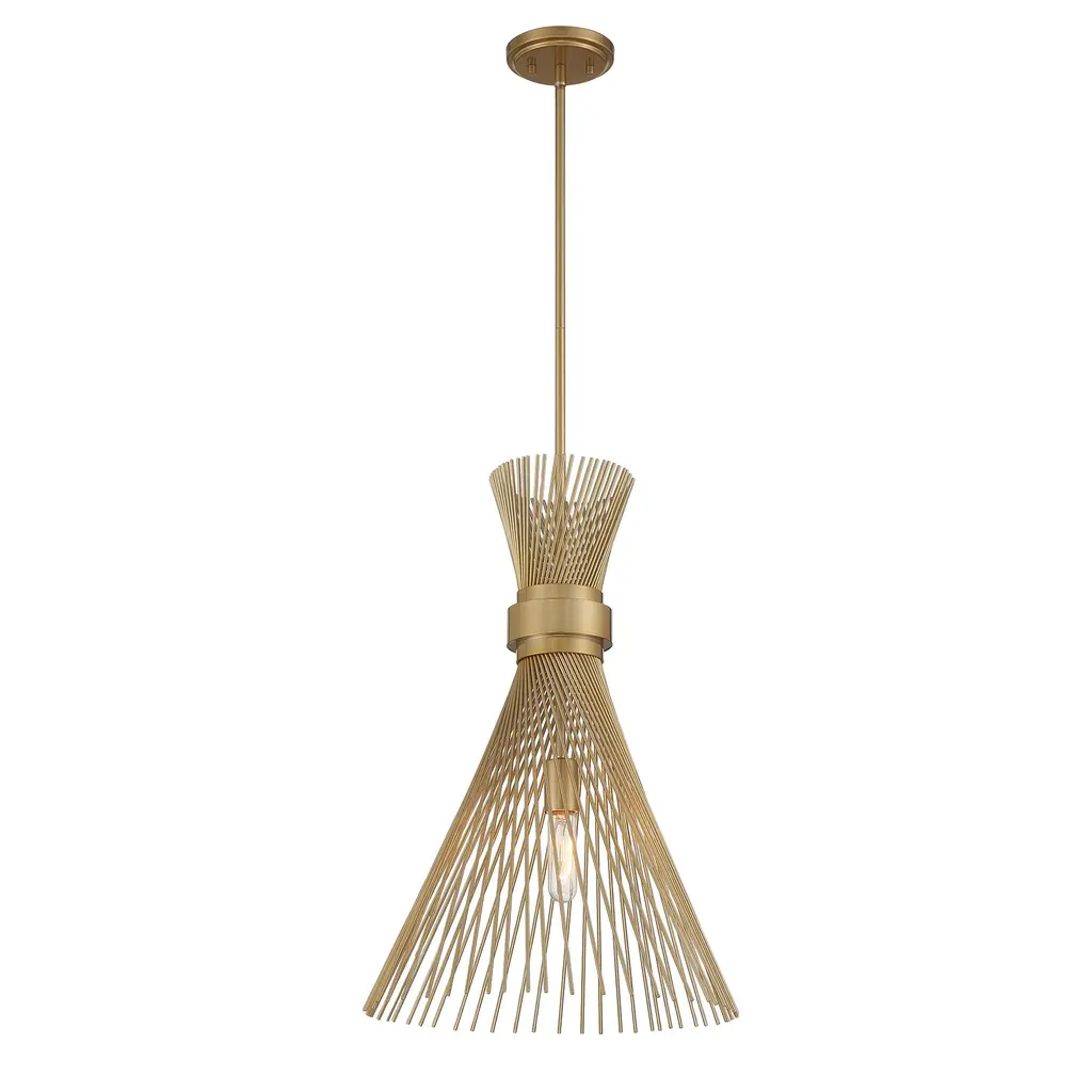 The Savoy House Longfellow 1-light pendant showcases a fashionable style with metal rods that are gathered together at the center and unfurl outward. When the light is on, it creates a dramatic glow that is sure to catch the eye. Burnished Brass finish. Longfellow is 16" in width and has an adjustable height ranging from 24" to 78". Comes with four 12" downrods and one 6" downrod. Uses one standard size bulb of up to 60 watts. The bulb is not included.Features:Dimensions:Electrical Specifications: