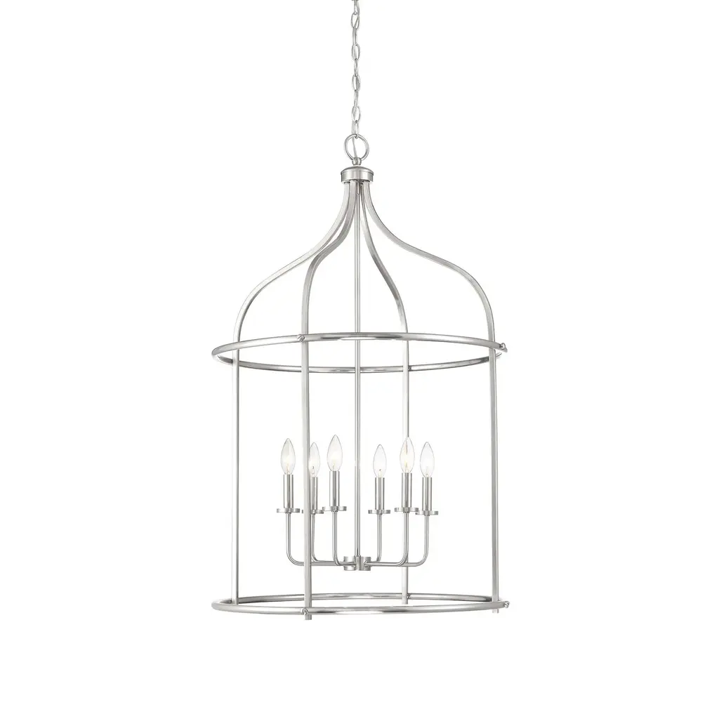 Collection: Brookstone, Material: Metal, Finish Color: Bisque White, Width: 26", Height: 40", Length: 26", Chain Length: 120", Lamping Type: Incandescent, Number Of Bulbs: 6, Wattage: 60 Watts, Dimmable: Yes, Moisture Rating: Dry Rated, Desc: Brighten up boldly with the Savoy House Brookstone 6-light lantern. It has a simply elegant open lantern style and a lovely Warm Brass finish. At 40" in height and 26" in width, it is a great way to illuminate a large room, like a grand foyer. Brookstone uses six candelabra size bulbs of up to 60 watts per bulb. Bulbs not included.,