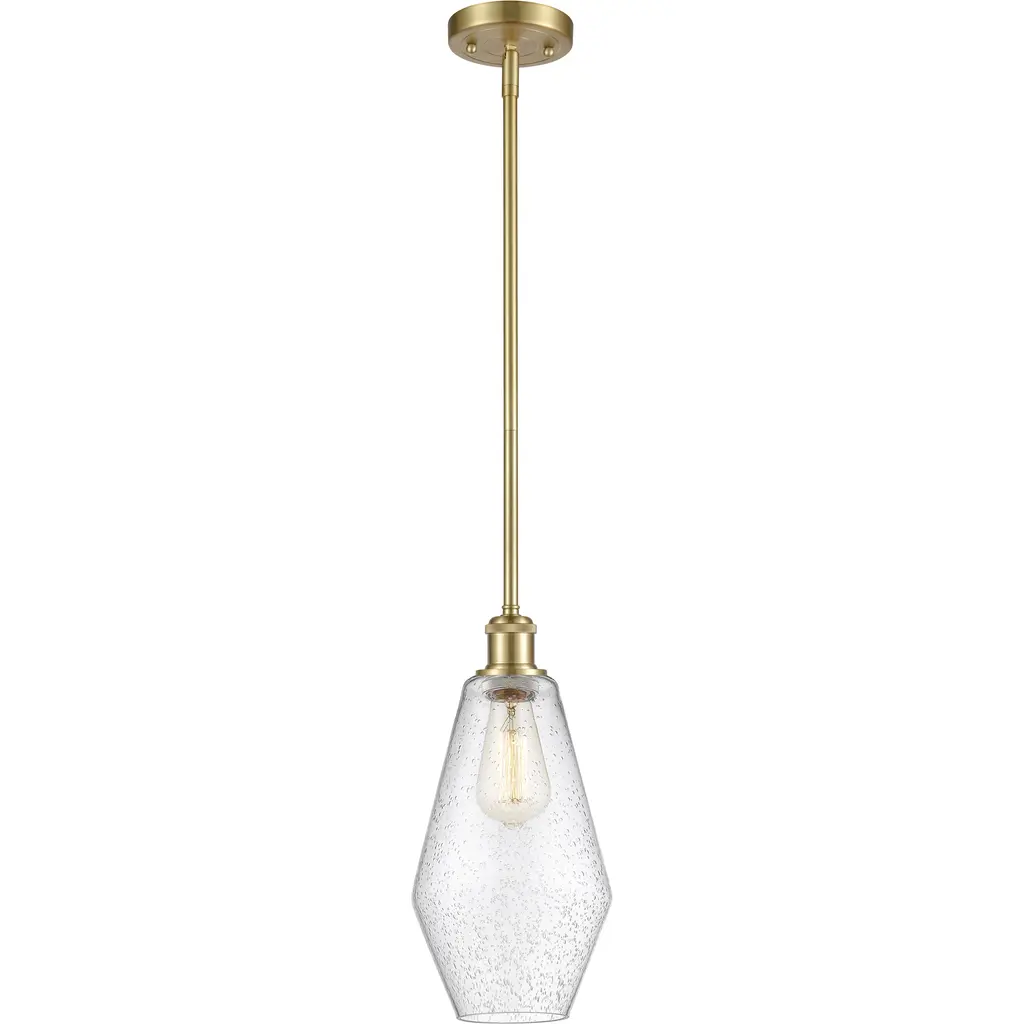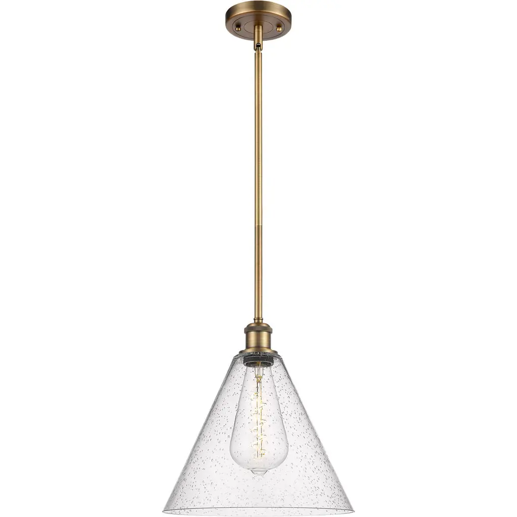 The Savoy House Carlton 1-light pendant features a beautifully streamlined style highlighted by a shade of ribbed glass that gives a hint of motion. Finished in warm brass. Carlton is 11" in width and has an adjustable height ranging from 20" to 74". Comes with four 12" downrods and one 6" downrod. Uses 1 standard size bulb with a max of 60 watts (bulb not included).
