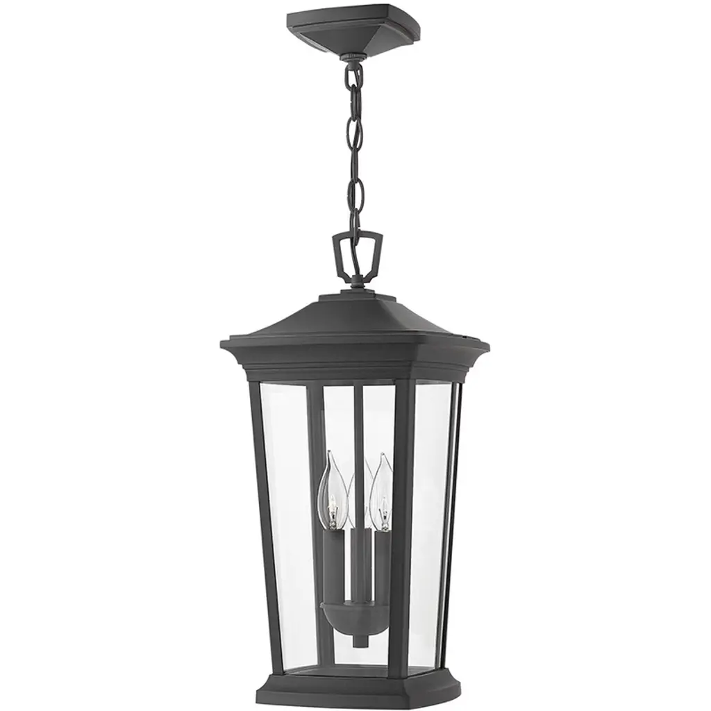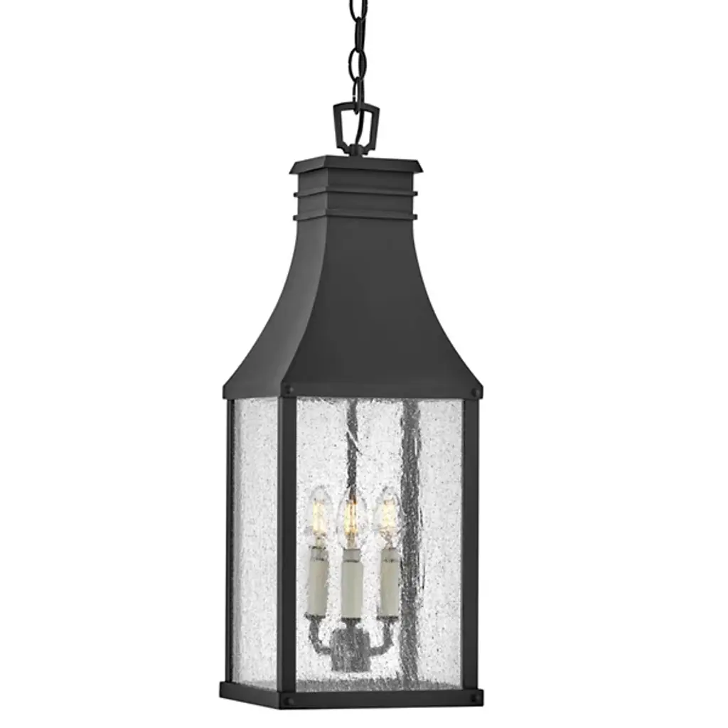 Brighten the exterior of your home and welcome your guests in style, with the Ellijay hanging lantern. The design mimics a vintage gas lantern, with a classic, tapered box shape and decorative top finial. A deep black finish looks terrific, and blends well with other hardware and architectural materials. Panes of clear glass fill all four side panels —and the roof panels, too. Four 40W, C-style bulbs provide inviting and secure illumination. This lantern measures 12” wide and 20.75” high. You’ll enjoy its timeless style and enhance the beauty of your property, whether on your porch, patio, sunroom, pergola, or hung from other ceilings in your outdoor living areas.