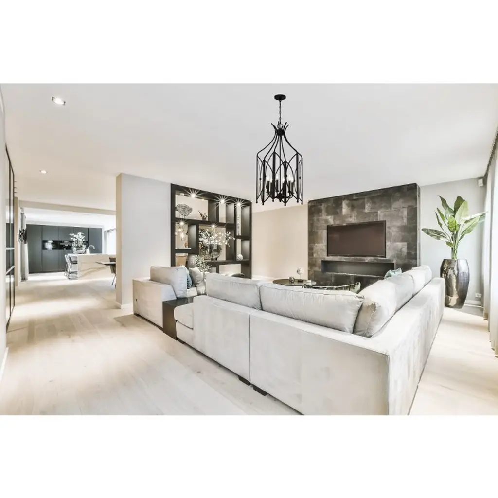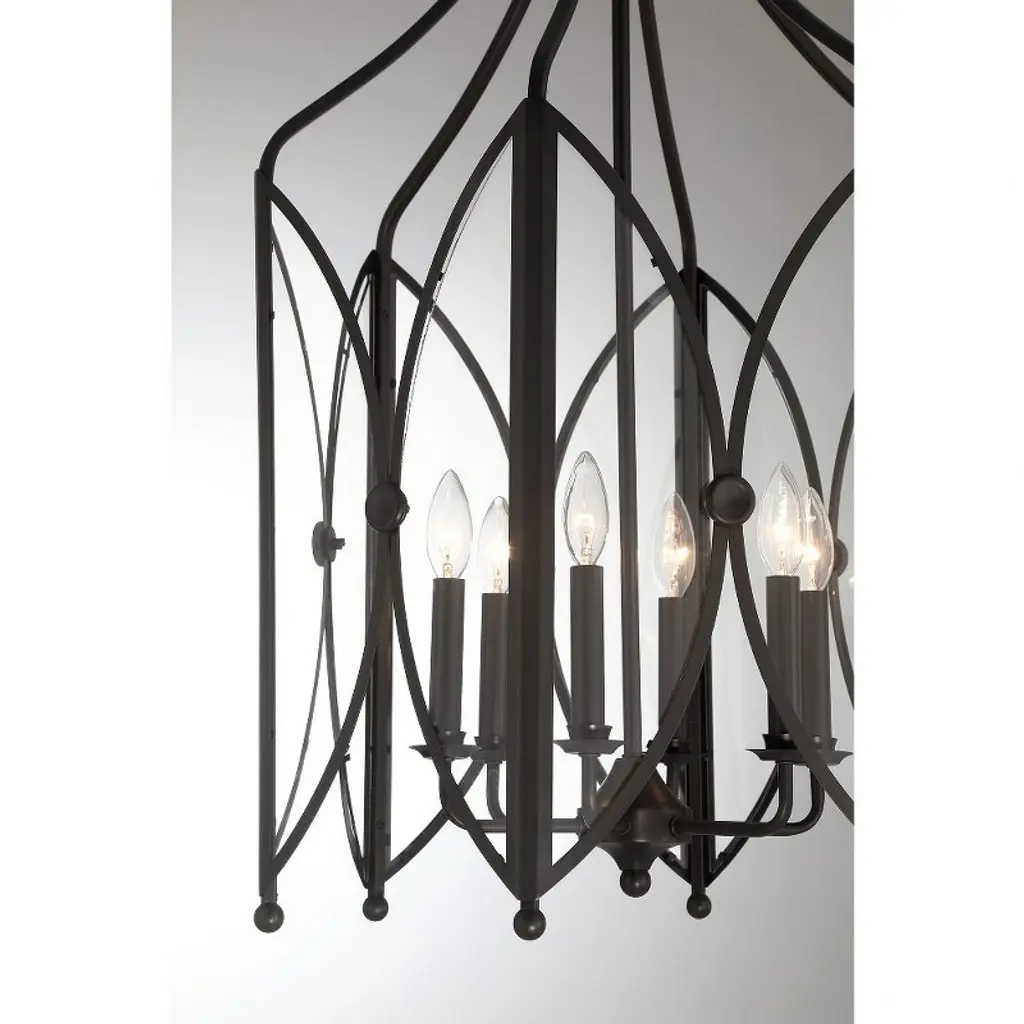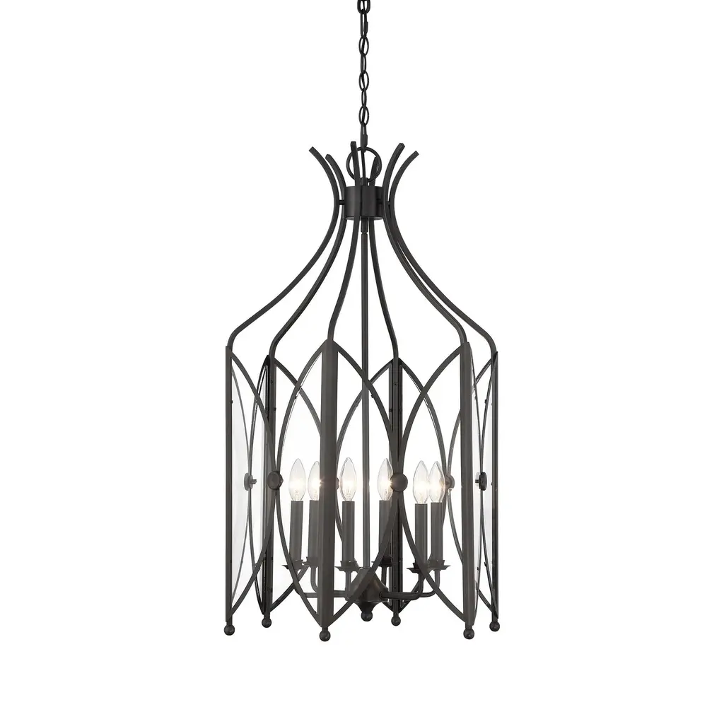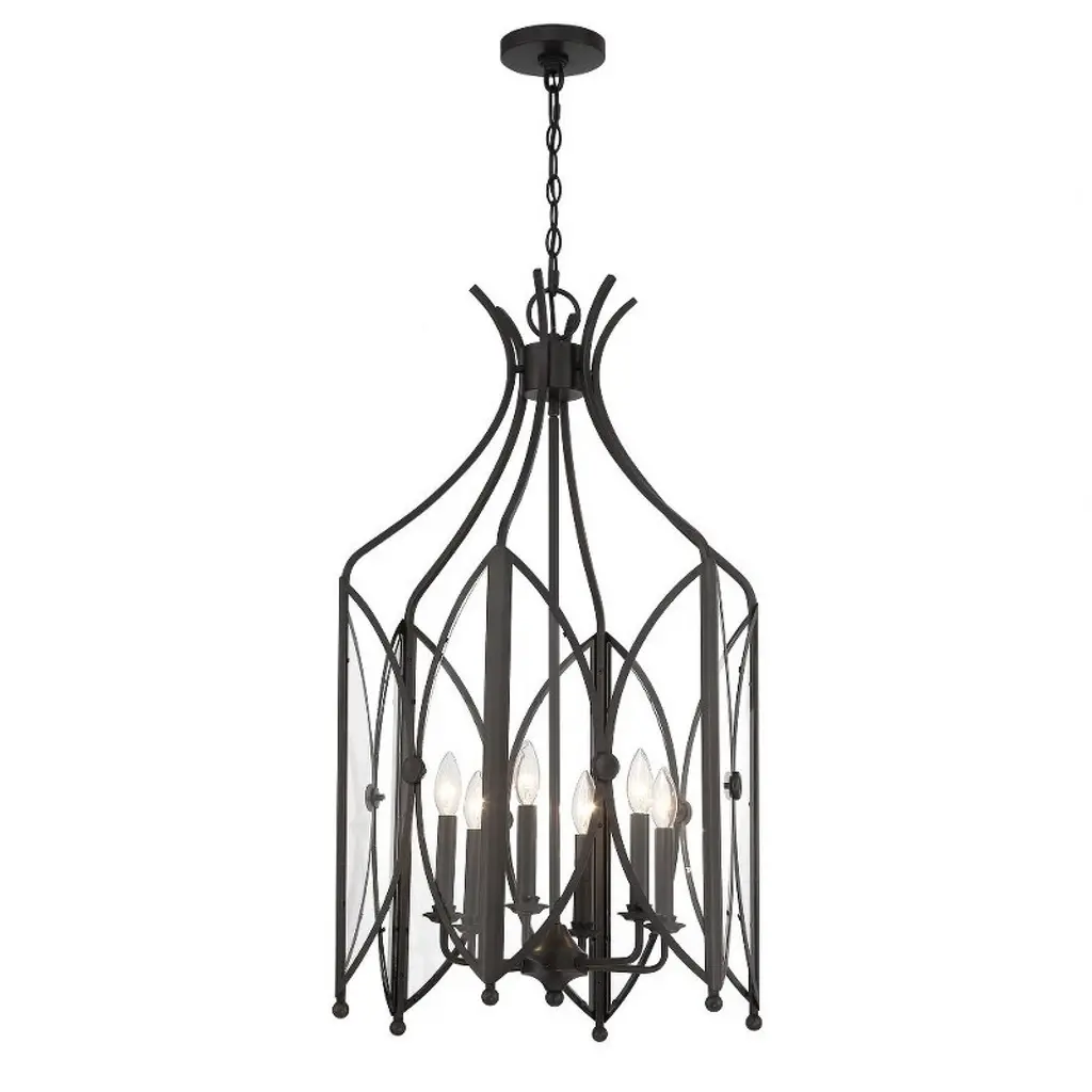 Collection: Enclave, Material: Metal, Finish Color: Black Tourmaline, Width: 21", Height: 35", Length: 21", Chain Length: 120", Lamping Type: Incandescent, Number Of Bulbs: 6, Wattage: 60 Watts, Dimmable: Yes, Moisture Rating: Dry Rated, Desc: Elegant and dramatic, the Savoy House Enclave 6-light lantern offers a strikingly beautiful lighting look. It is decorated with panes of clear glass in curving frames that recall the look of leaves and seem to multiply the lights within. The Noble Brass finish adds a bold touch of luxury. Enclave is 35" in height and 21" in width. It uses six candelabra size bulbs of up to 60 watts per bulb. Bulbs not included.,