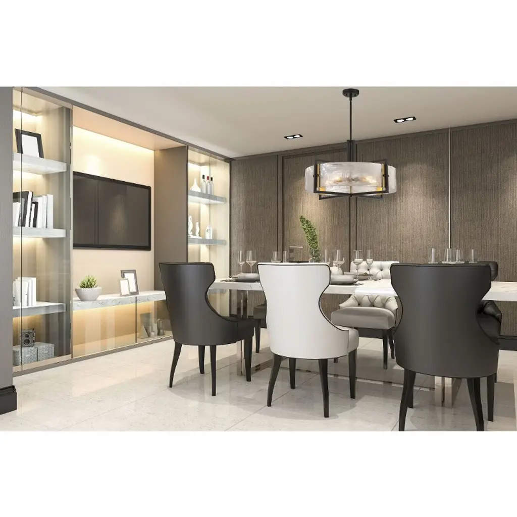 Swirling, mesmerizing strie piastra glass surrounds the lights within the Savoy House Hayward 5-light pendant. The matte black frame showcases warm brass accents for another dimension of style. Hayward is 28" in width and has an adjustable height ranging from 17" to 71". It uses five standard size bulbs of up to 60 watts per bulb. Comes with four 12" downrods and one 6" downrod, plus 80" of cord.