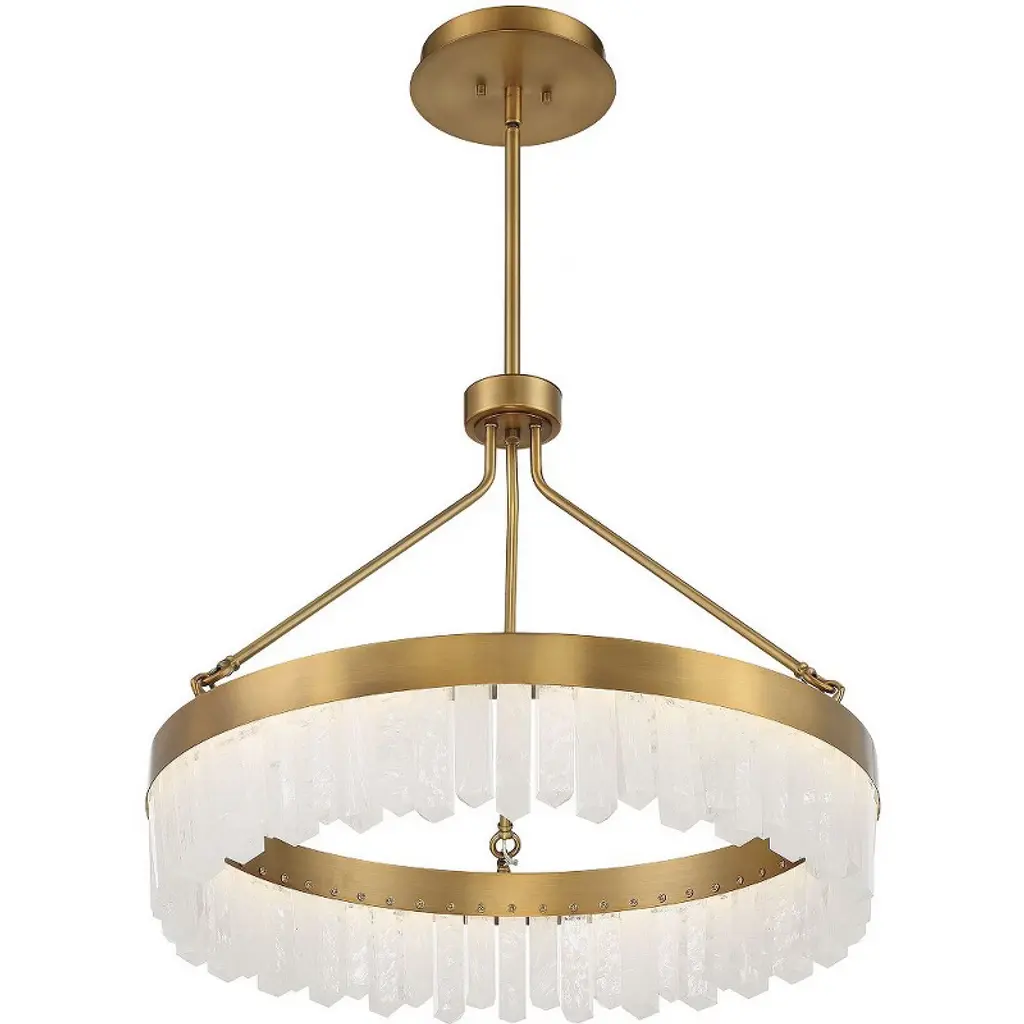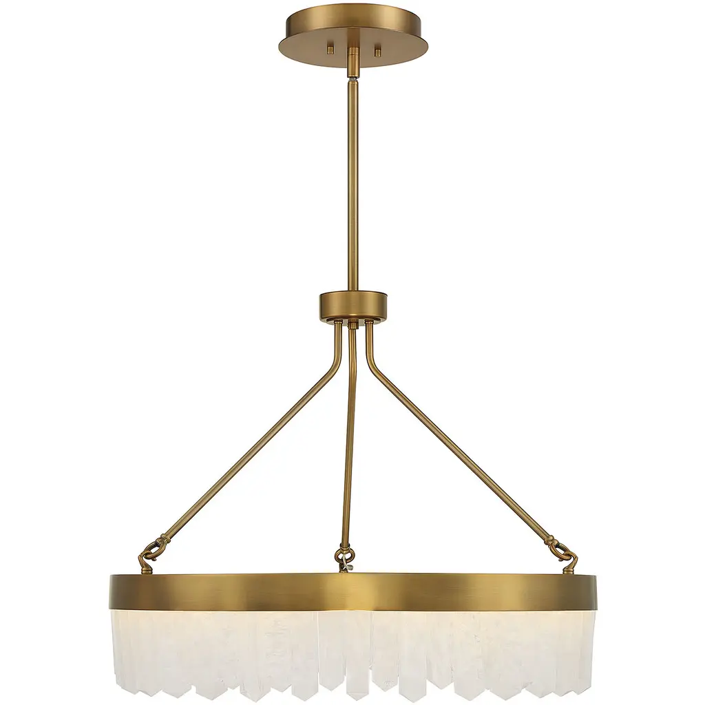Create a breathtaking glow with the Savoy House Landon pendant, which features a circular shade adorned with dramatically-cut pieces of calcite that are illuminated from within by integrated LED light sources. The warm brass finish adds to the bright, warm look. Landon is 22" in height and 27" in width. It comes with four 12" downrods and one 6" downrod, plus 80" of cord.
