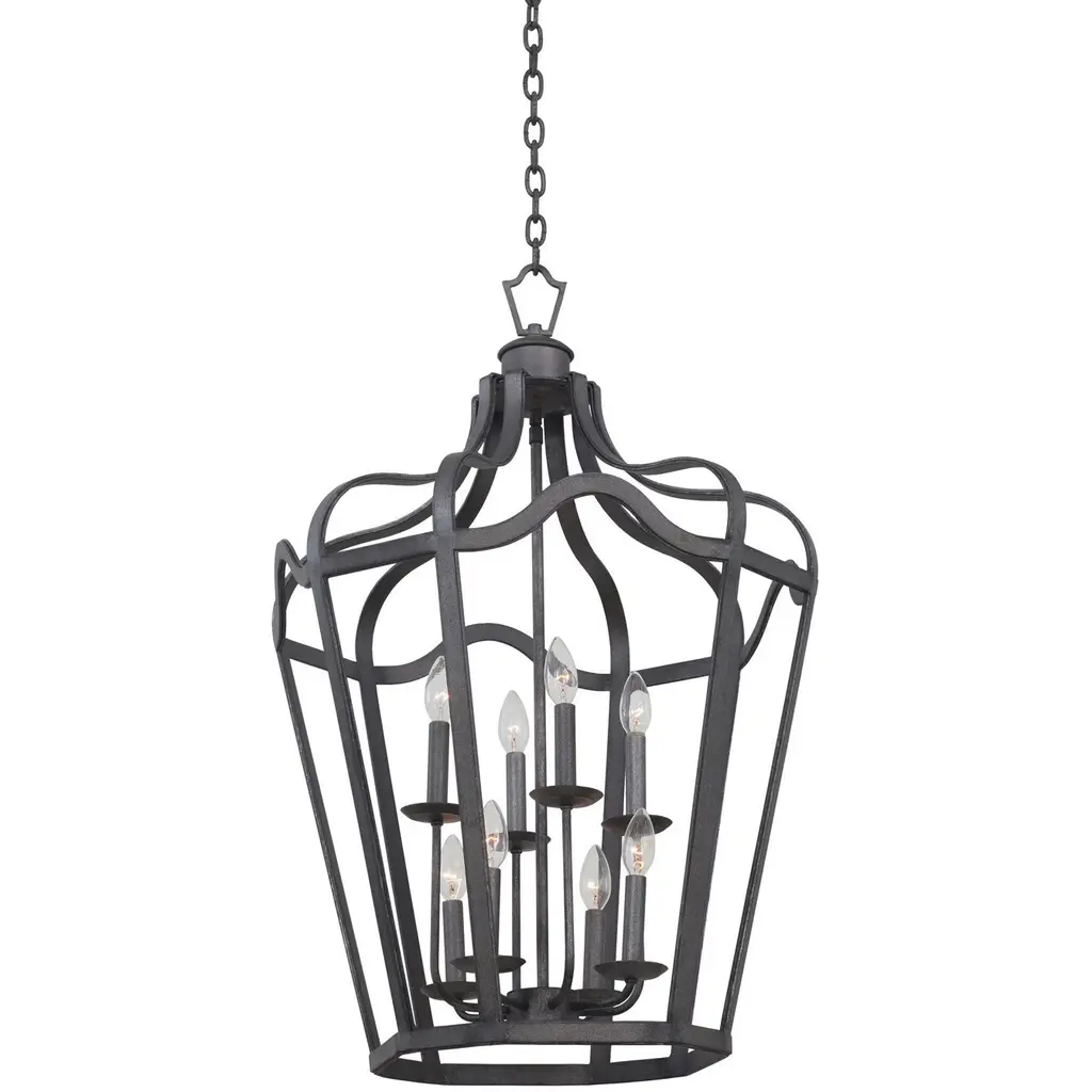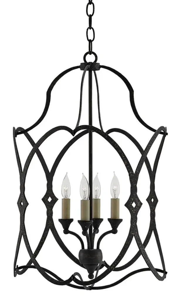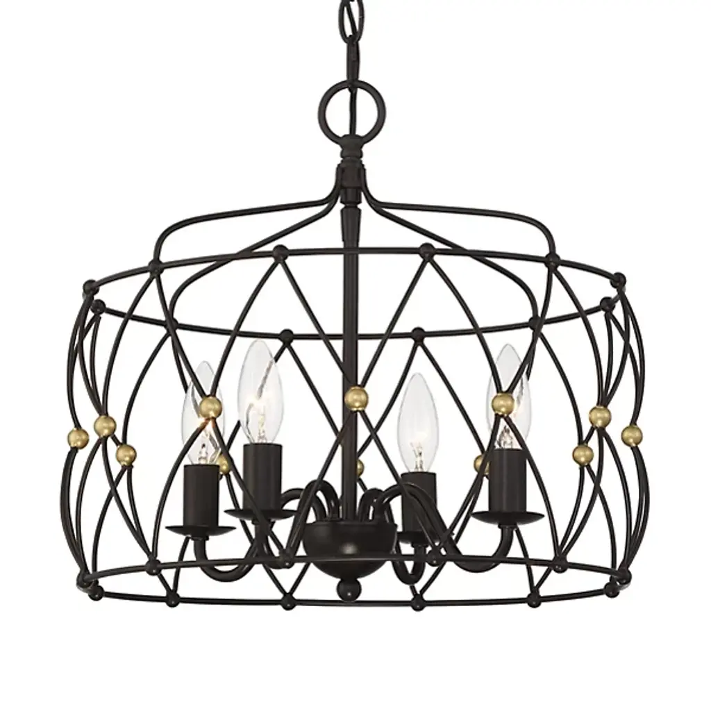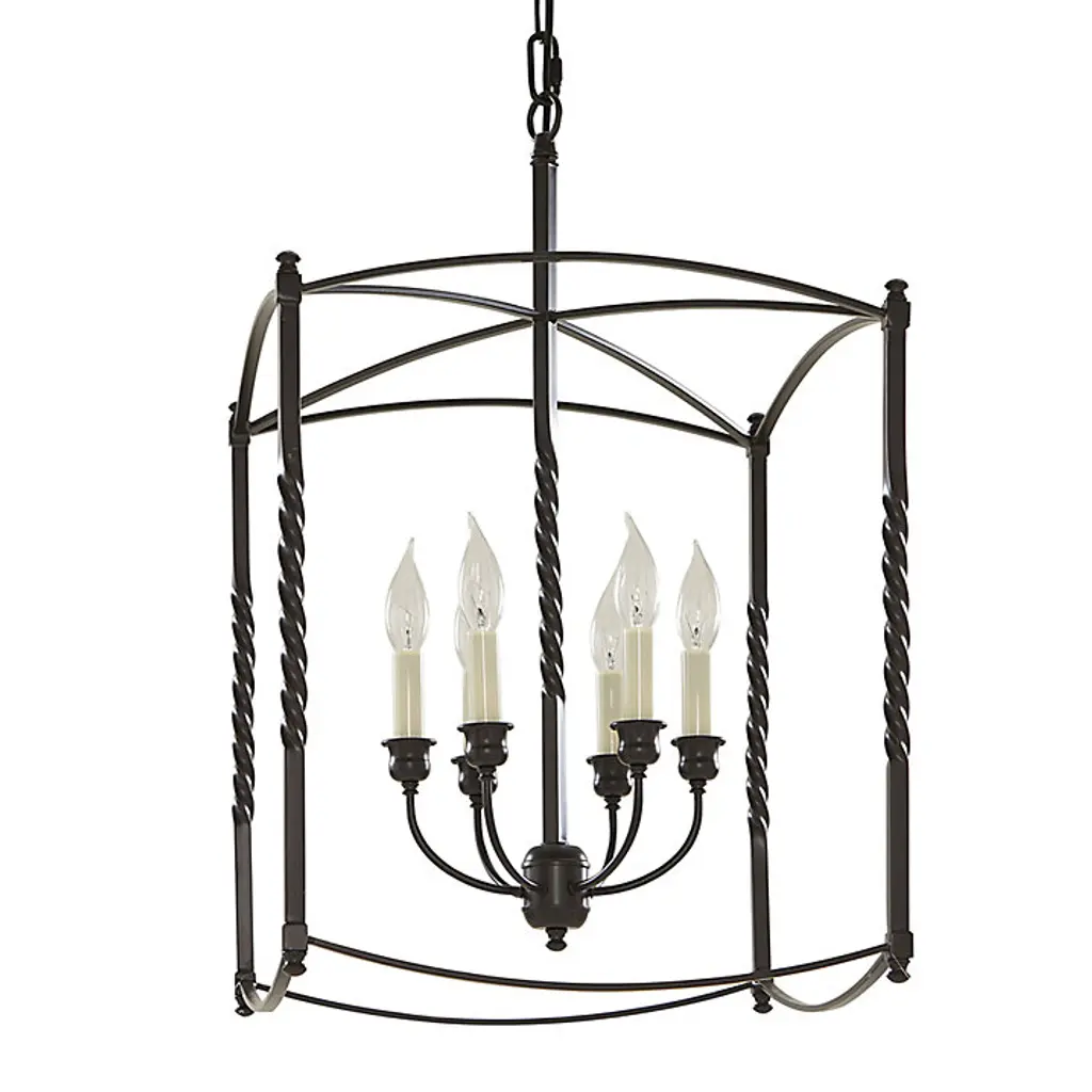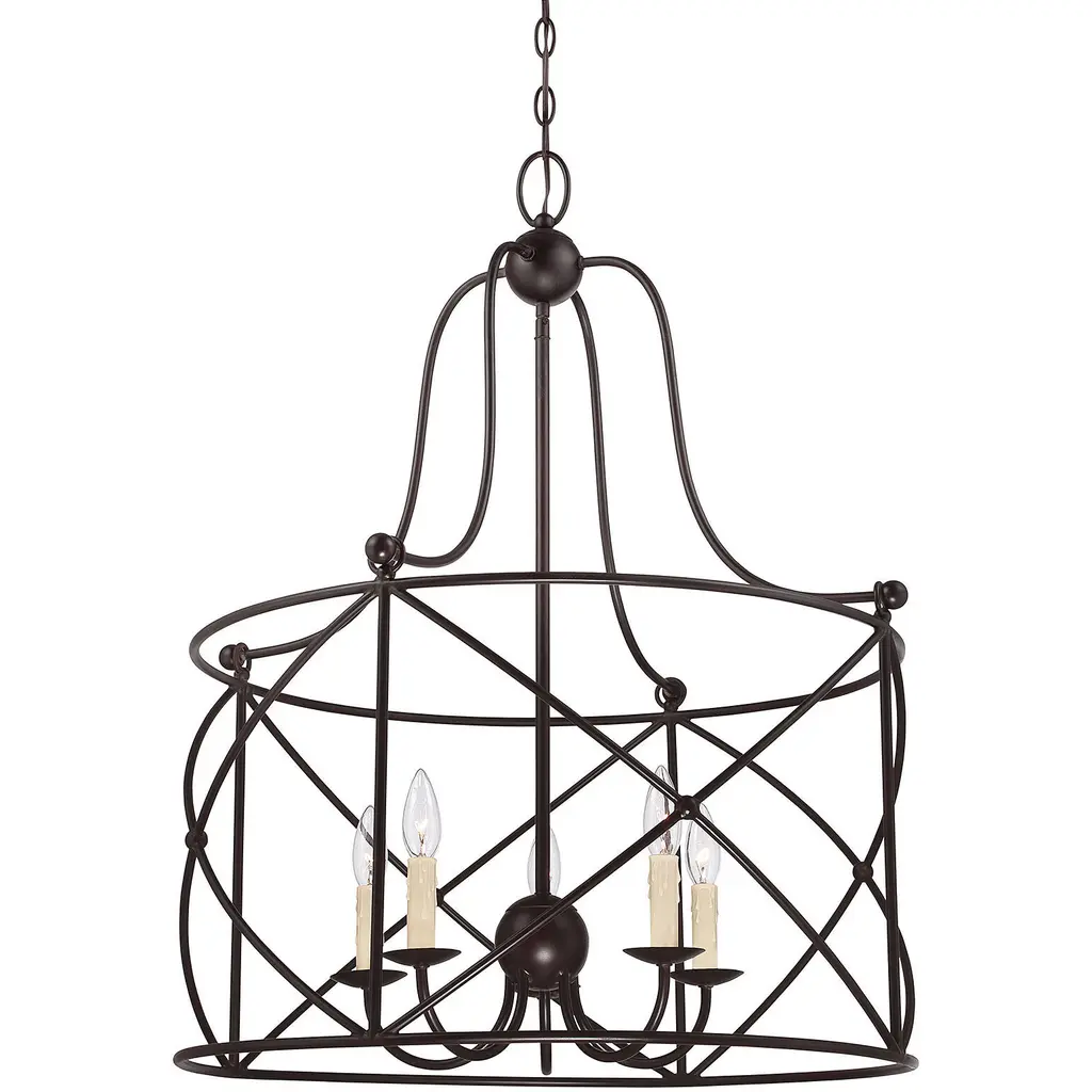 The Seneca pendant sports an open, airy frame with an elegant, birdcage-like design. Slim, curved metal bars swoop down from the globe canopy to crisscross around the main drum-shaped frame. The central column suspends an inner, candelabra structure, with five curved light arms, simple candle cups, and a globe finial —all with a rich, dark, English bronze finish. Each of the five light arms has a lovely, pale cream beeswax candle cover, and each holds a 60W, C-style bulb for plenty of illumination through the open frame. This pendant is 25.5” wide and 32.5” high: a superb size to put clean, casual style in your dining room, kitchen, foyer, family room, office, bedroom, great room, or stairway.