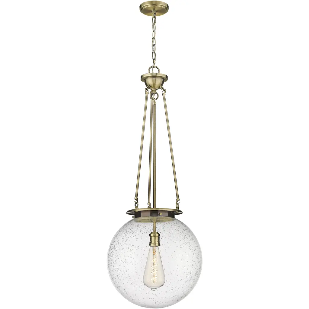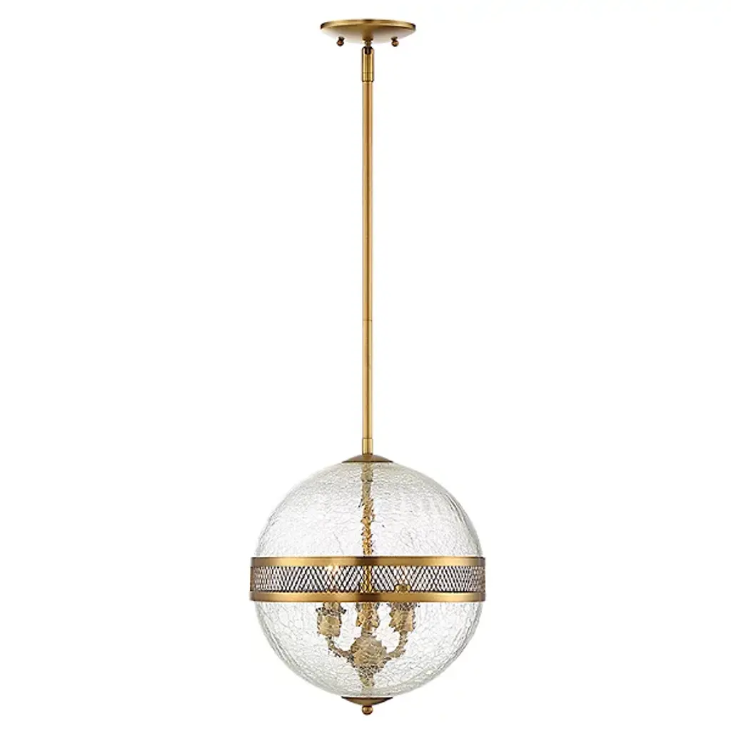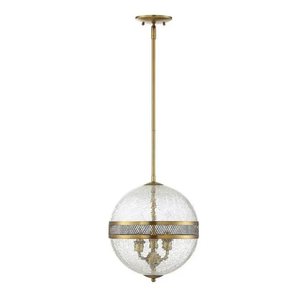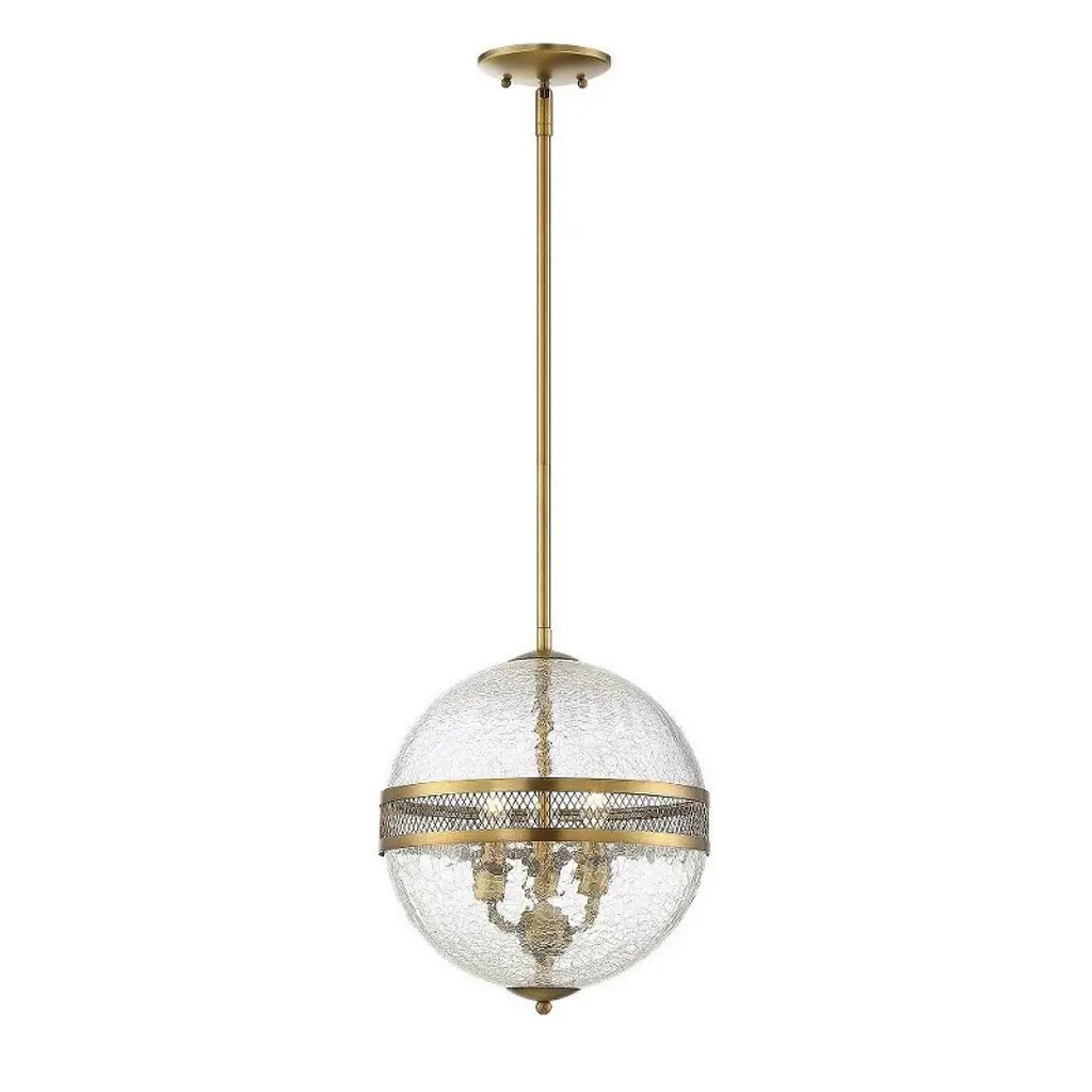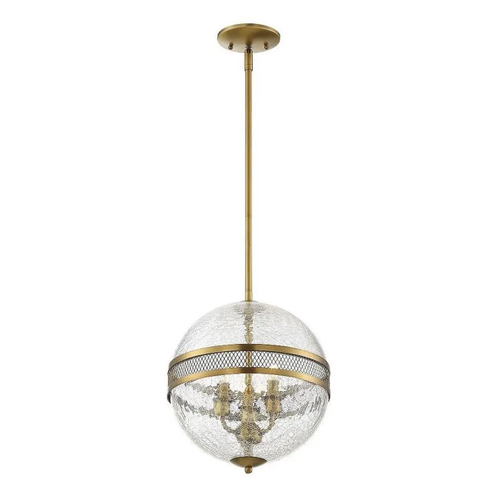 Give your home a bold, vintage-inspired lighting look with the Savoy House Stirling 3-light pendant. Its large, orb-shaped shade of crackled glass brings you high drama and is paired with a band of mesh detailing to add even more texture. Finished in rich warm brass. Pendants are very versatile and can be used in many different indoor spaces, including kitchens, foyers, offices, great rooms, bedrooms and even bathrooms. The hanging height is adjustable and it can be used on a sloped ceiling. Bulbs are not included, so try using stylized bulbs like Edison or tubular bulbs for a different look. The warm brass finish can be matched with brass hardware or mixed with hardware in other finishes. Choose Stirling to pep up the style of transitional, contemporary and classic style rooms. When you choose a Savoy House lighting fixture, you can be certain you've selected a piece that will withstand the test of time.