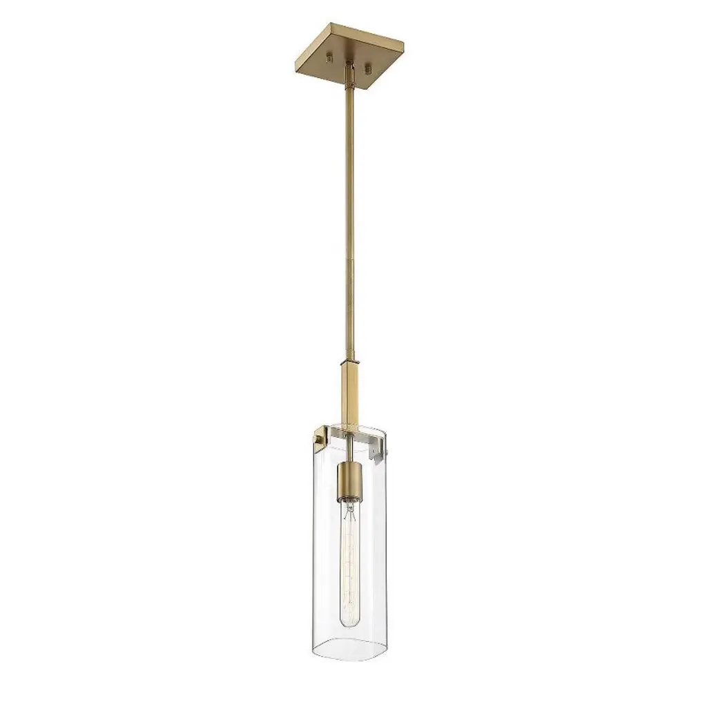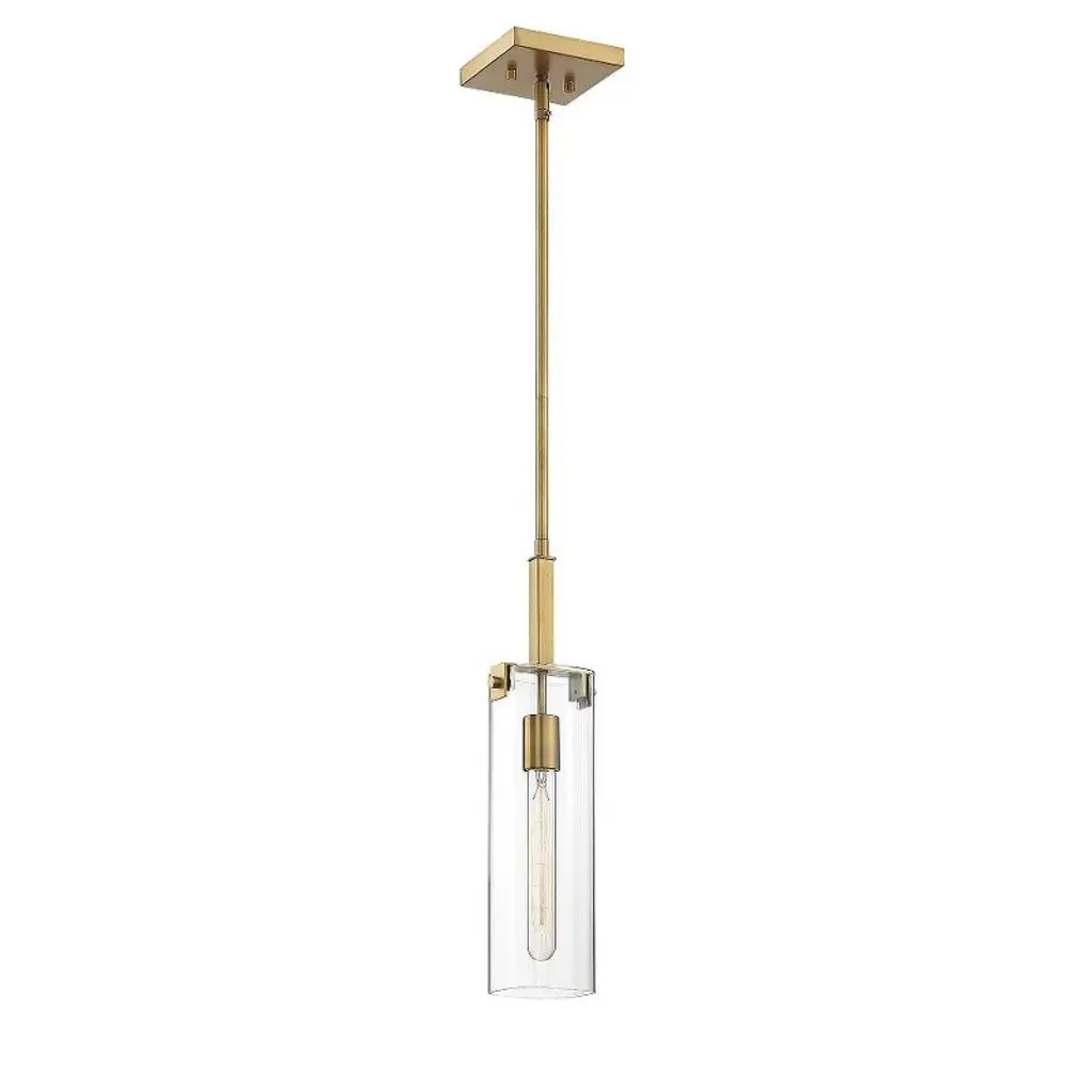 This Savoy House Winfield 1-light mini pendant showcases a bold, slim look with a shade of clear glass, thoughtful minimal detailing and a warm brass finish. Material: Glass, Finish Color: Warm Brass, Width: 5.13", Height: 15.75", Length: 5.13", Hanging Method: Stem, Lamping Type: Incandescent, Number Of Bulbs: 1, Wattage: 60 Watts, Dimmable: Yes, Moisture Rating: Dry Rated